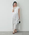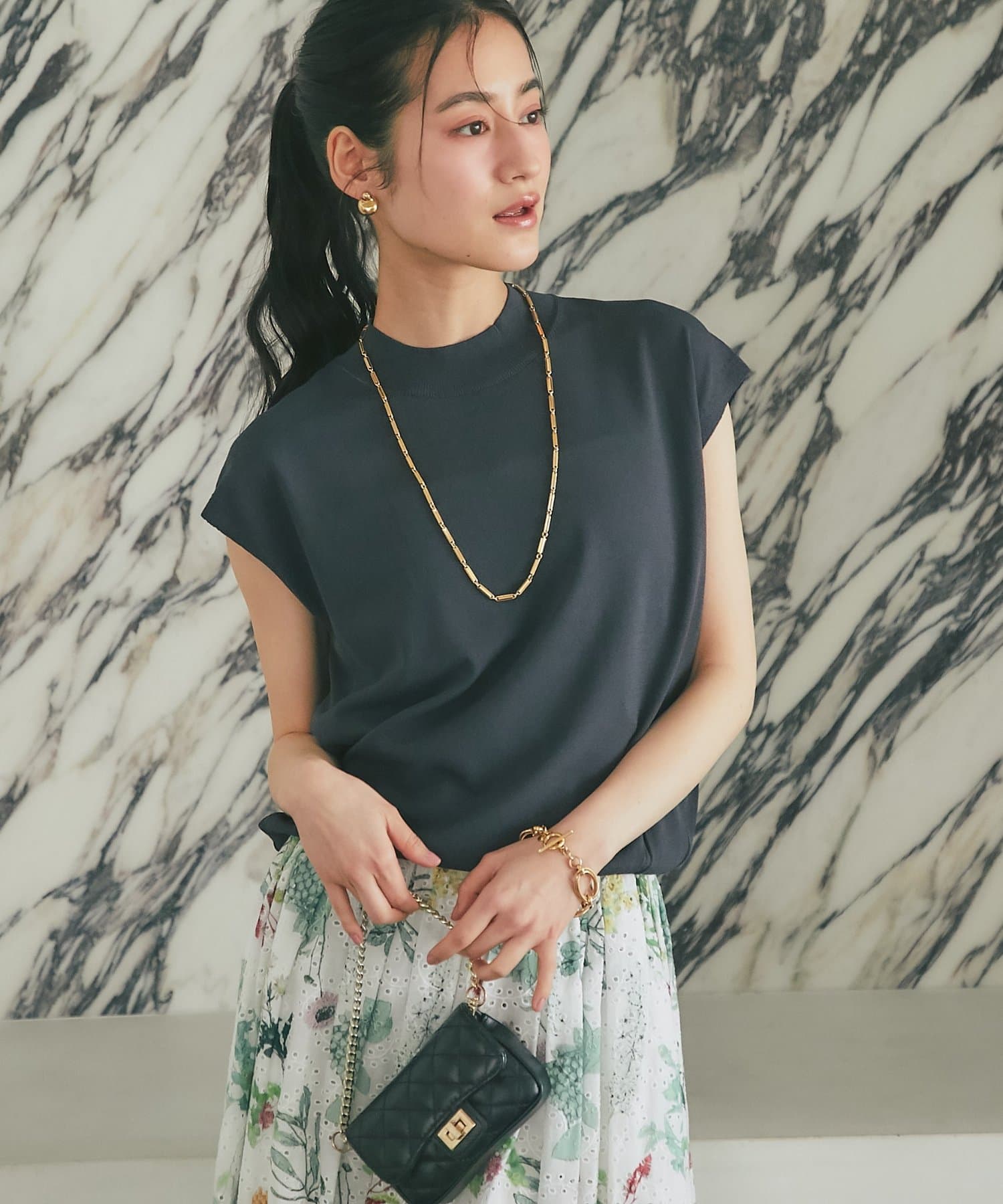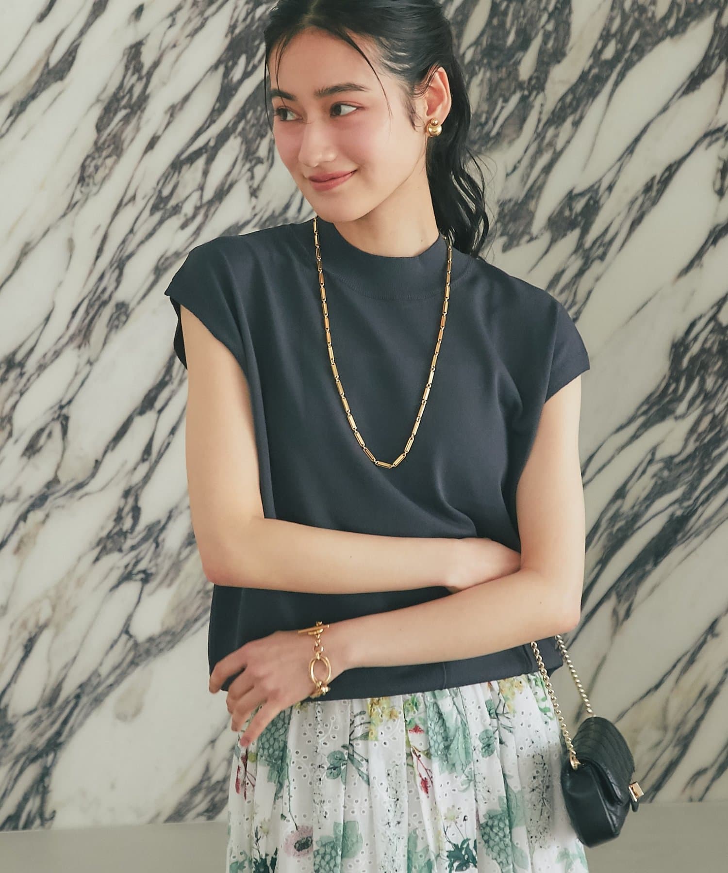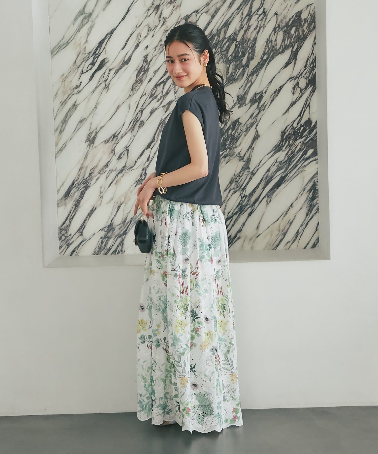 ボリュームのあるスカートに合わせて大人のお出かけスタイルに。