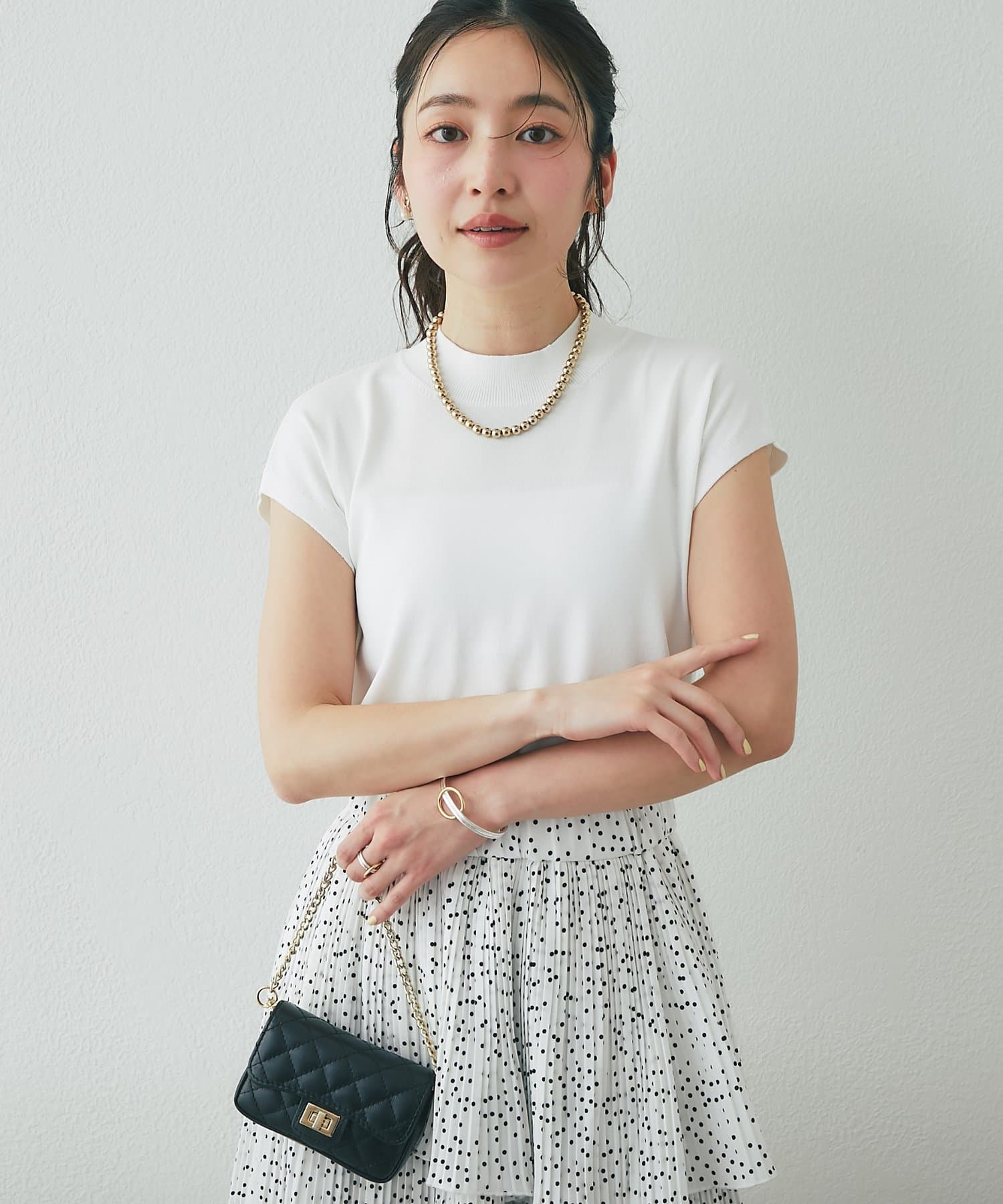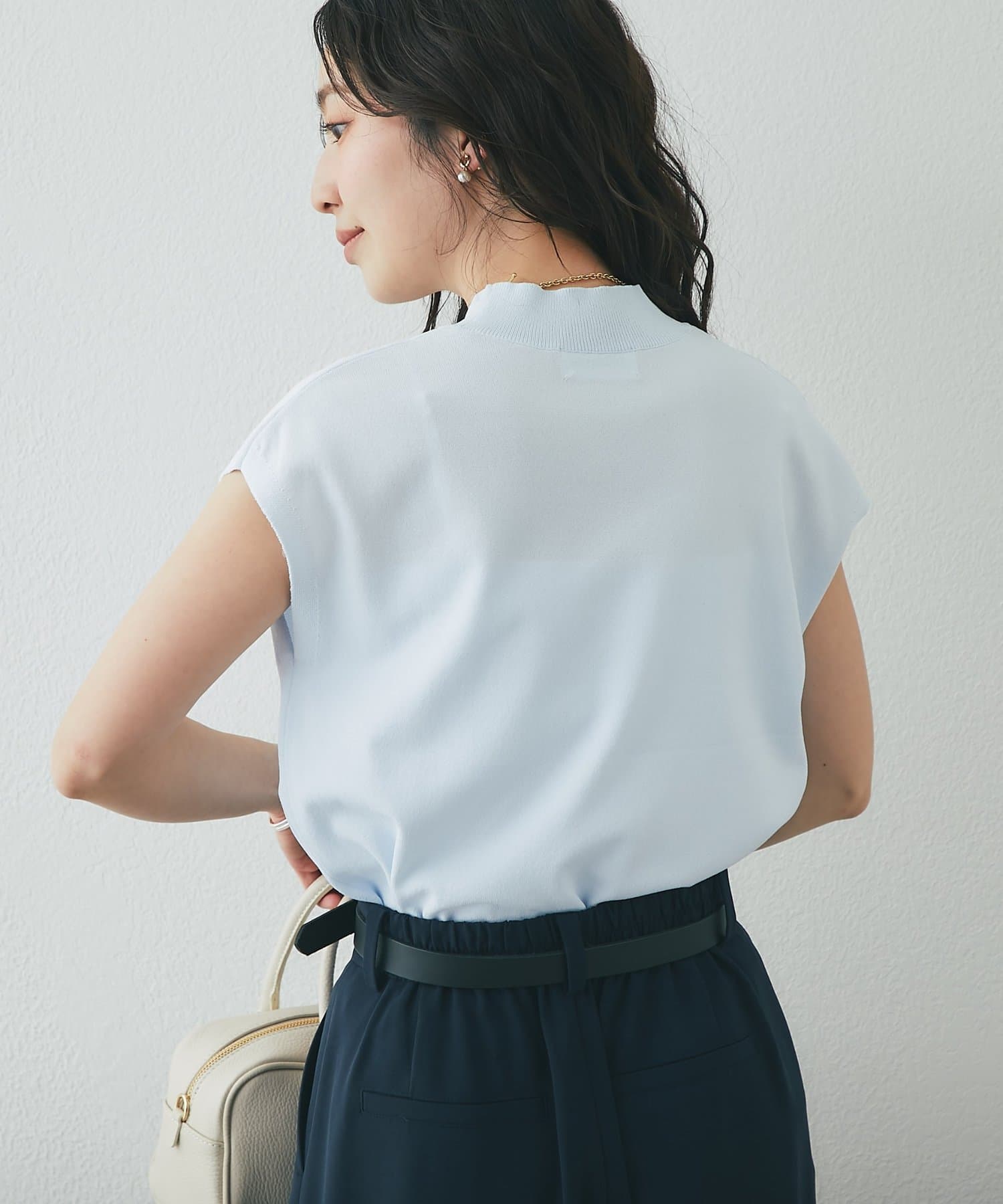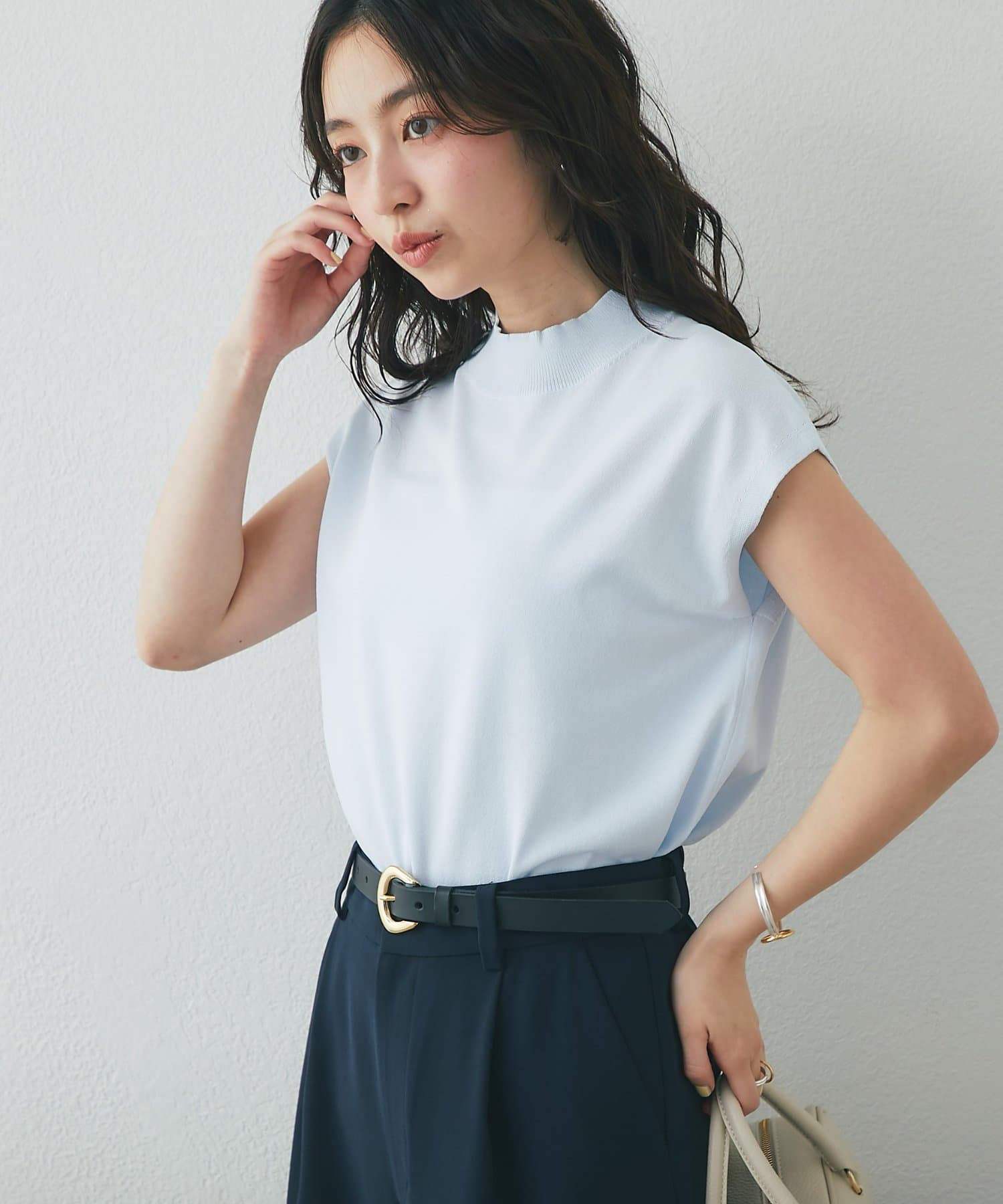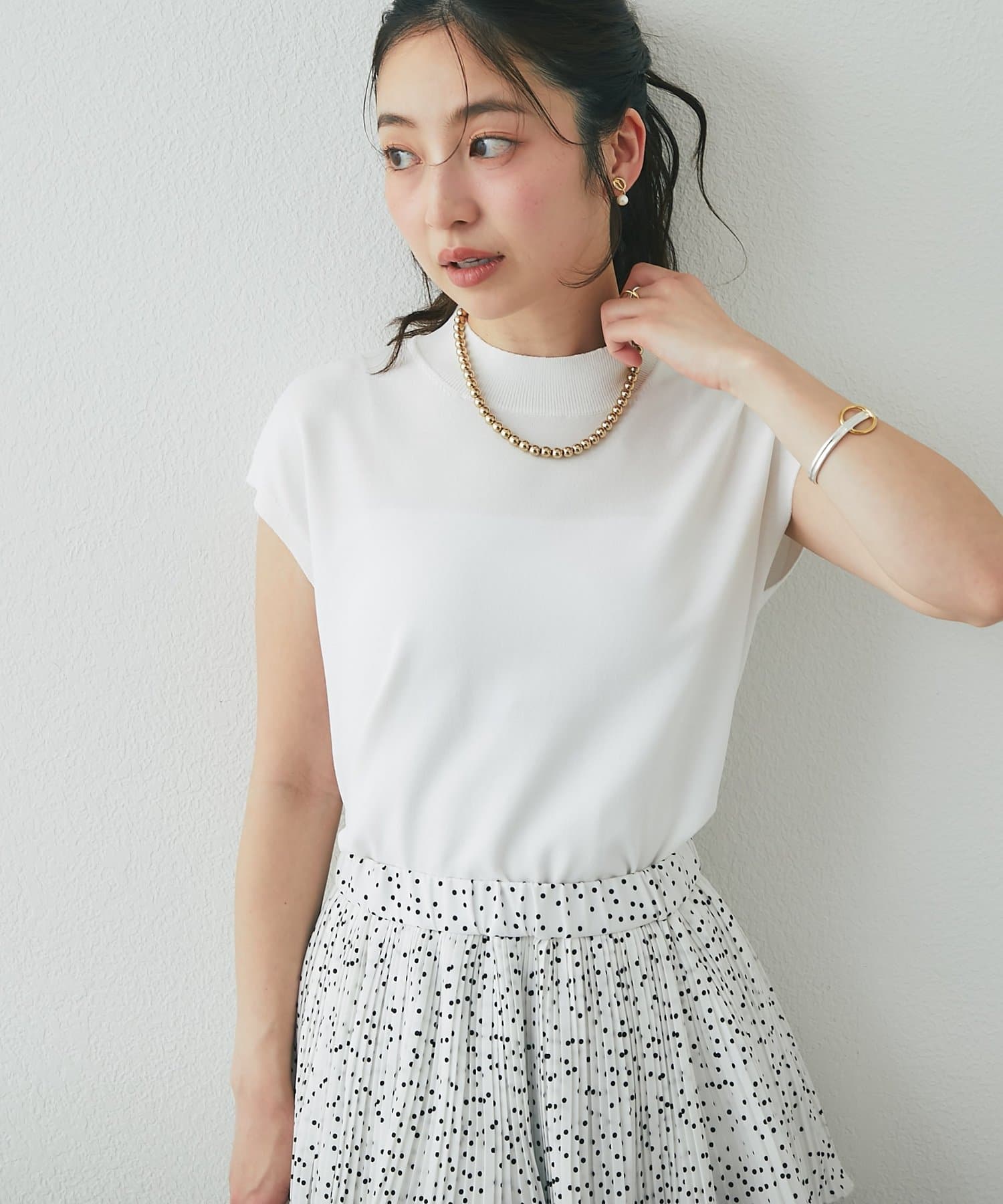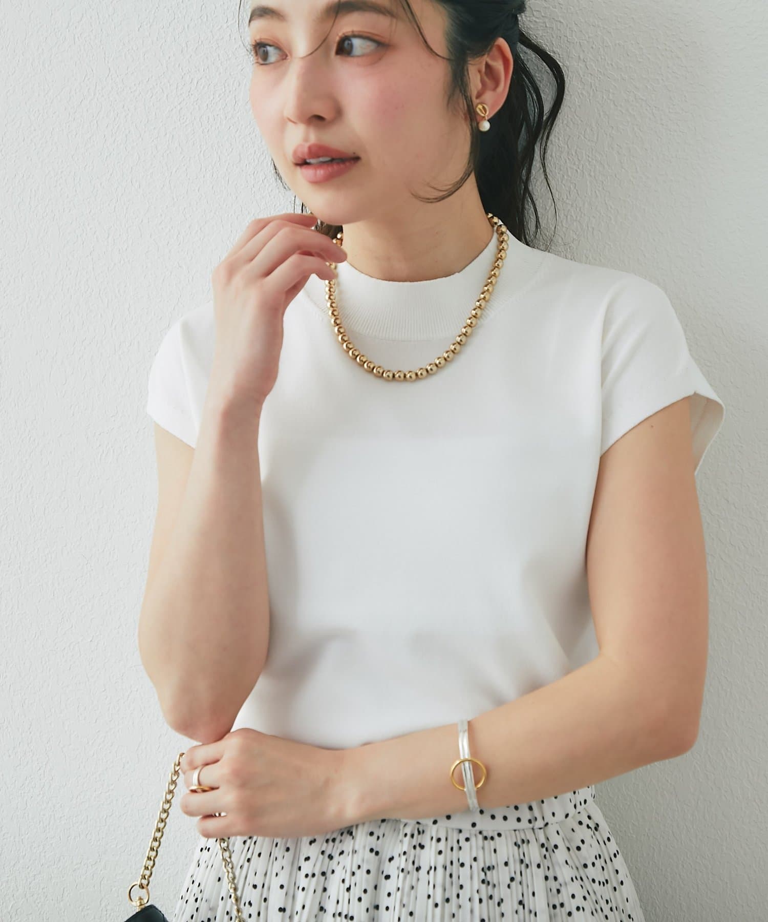一見ベーシックなデザインですが、さり気なく色香を宿すハイネックや清潔感のあるフレンチスリーブで
