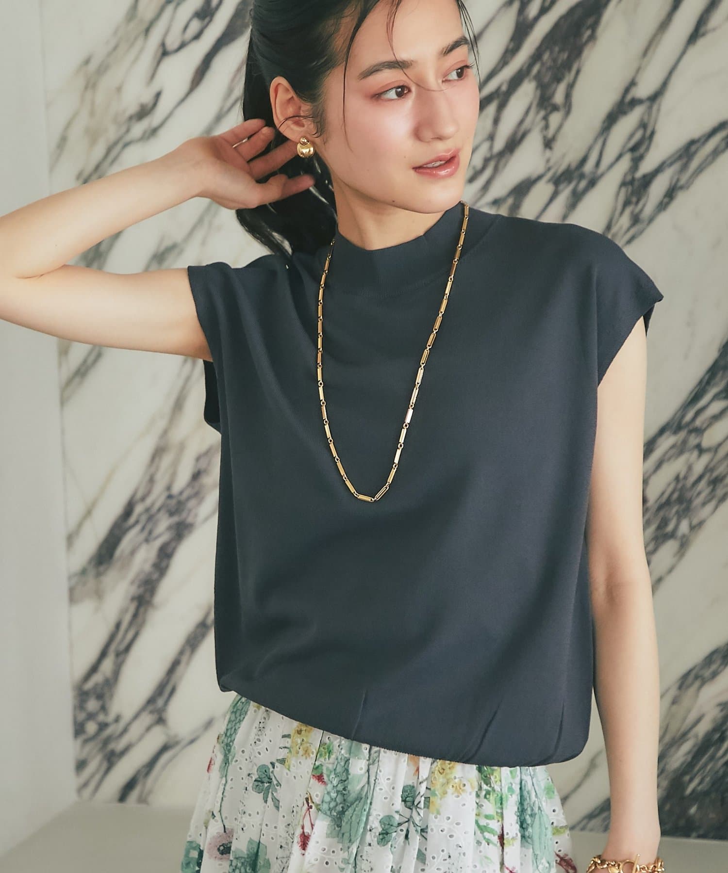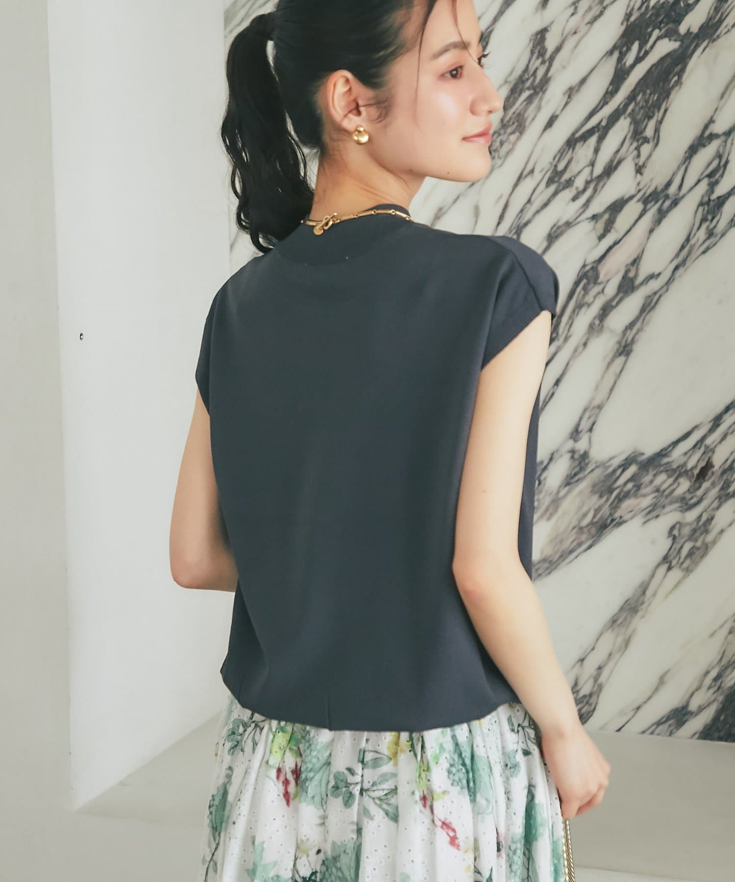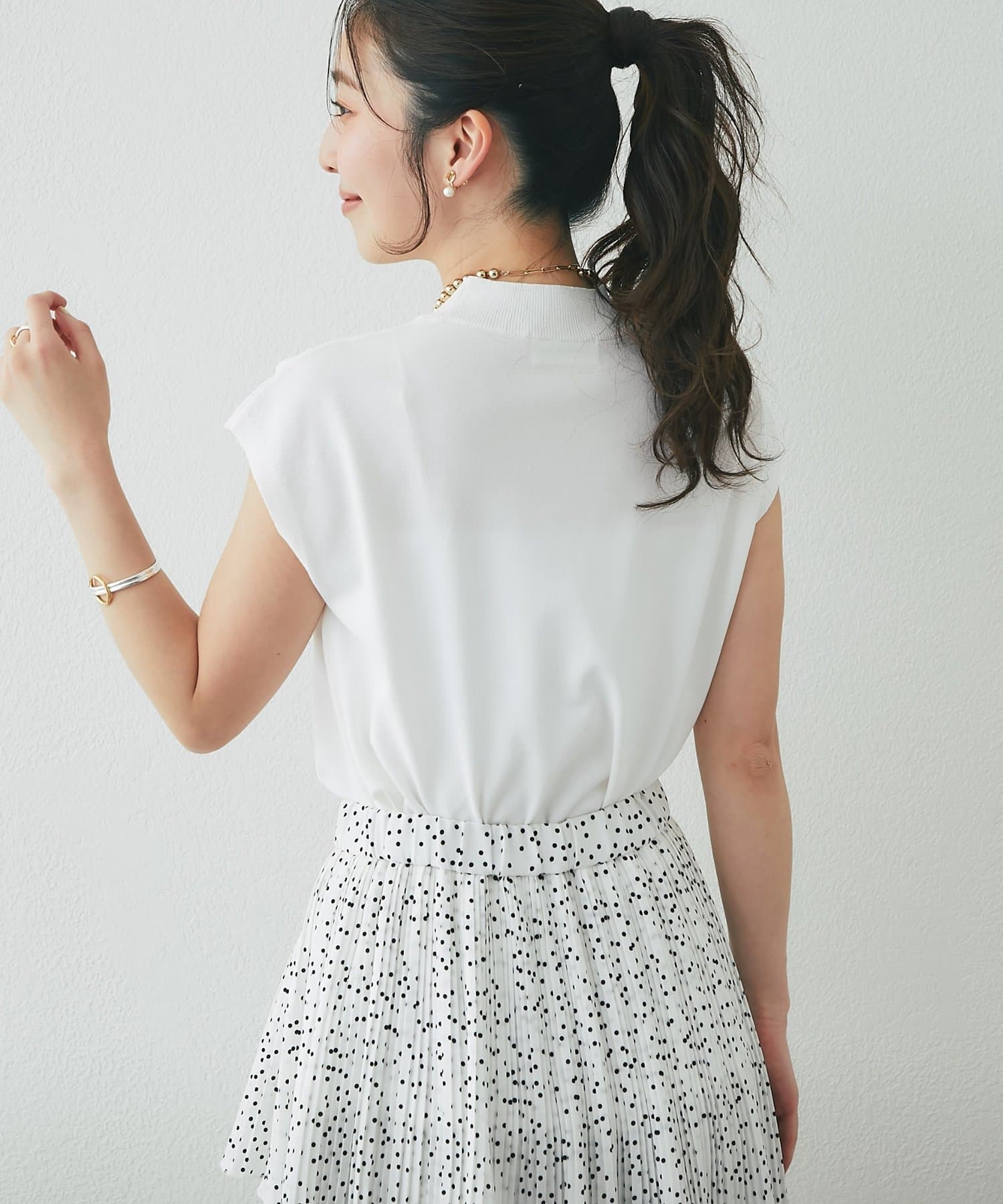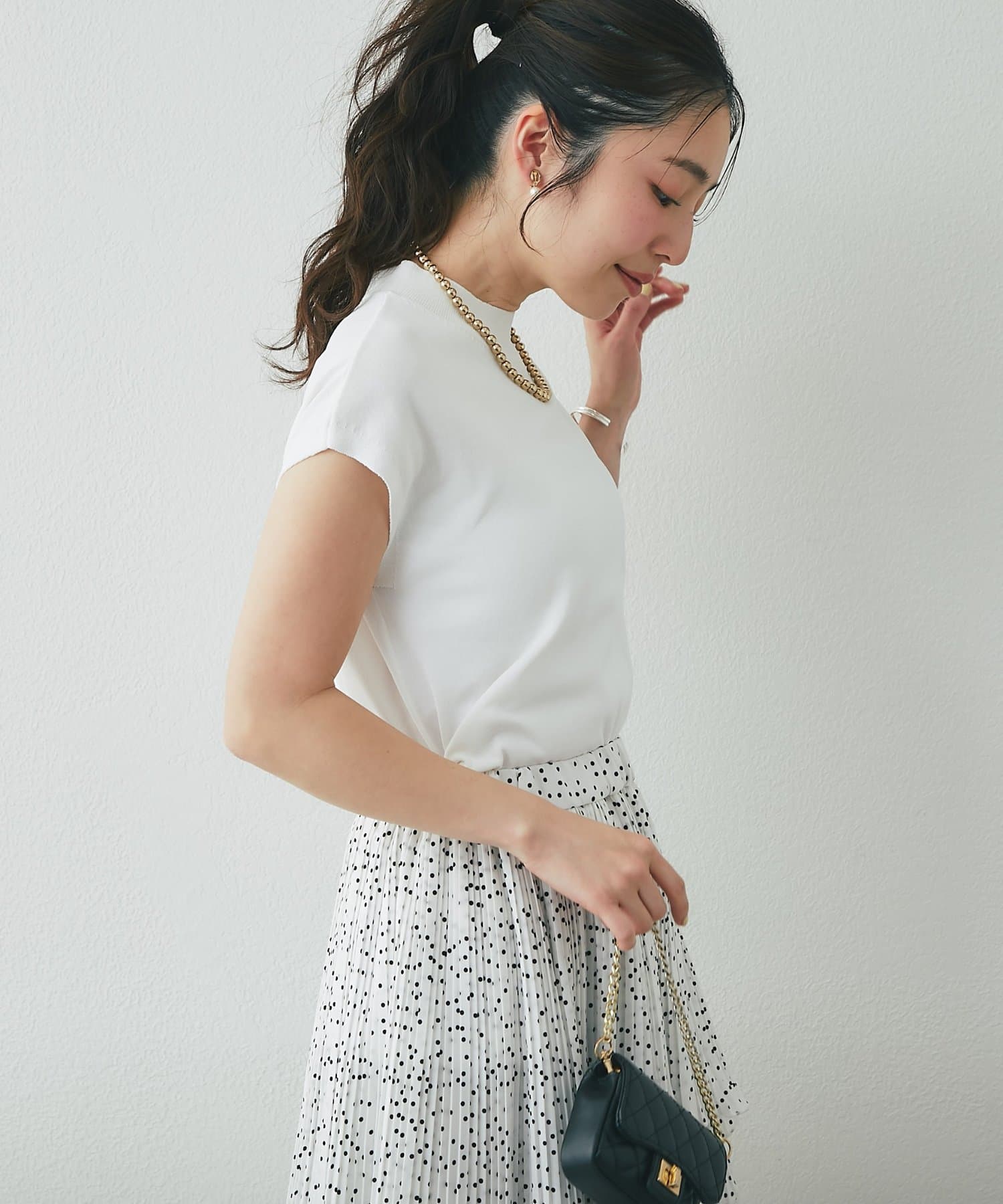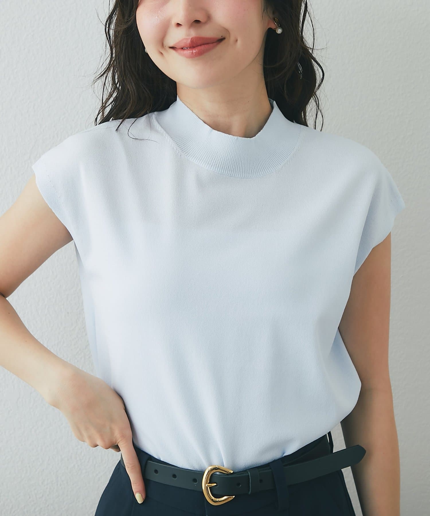 一見ベーシックなデザインですが、さり気なく色香を宿すハイネックや清潔感のあるフレンチスリーブで