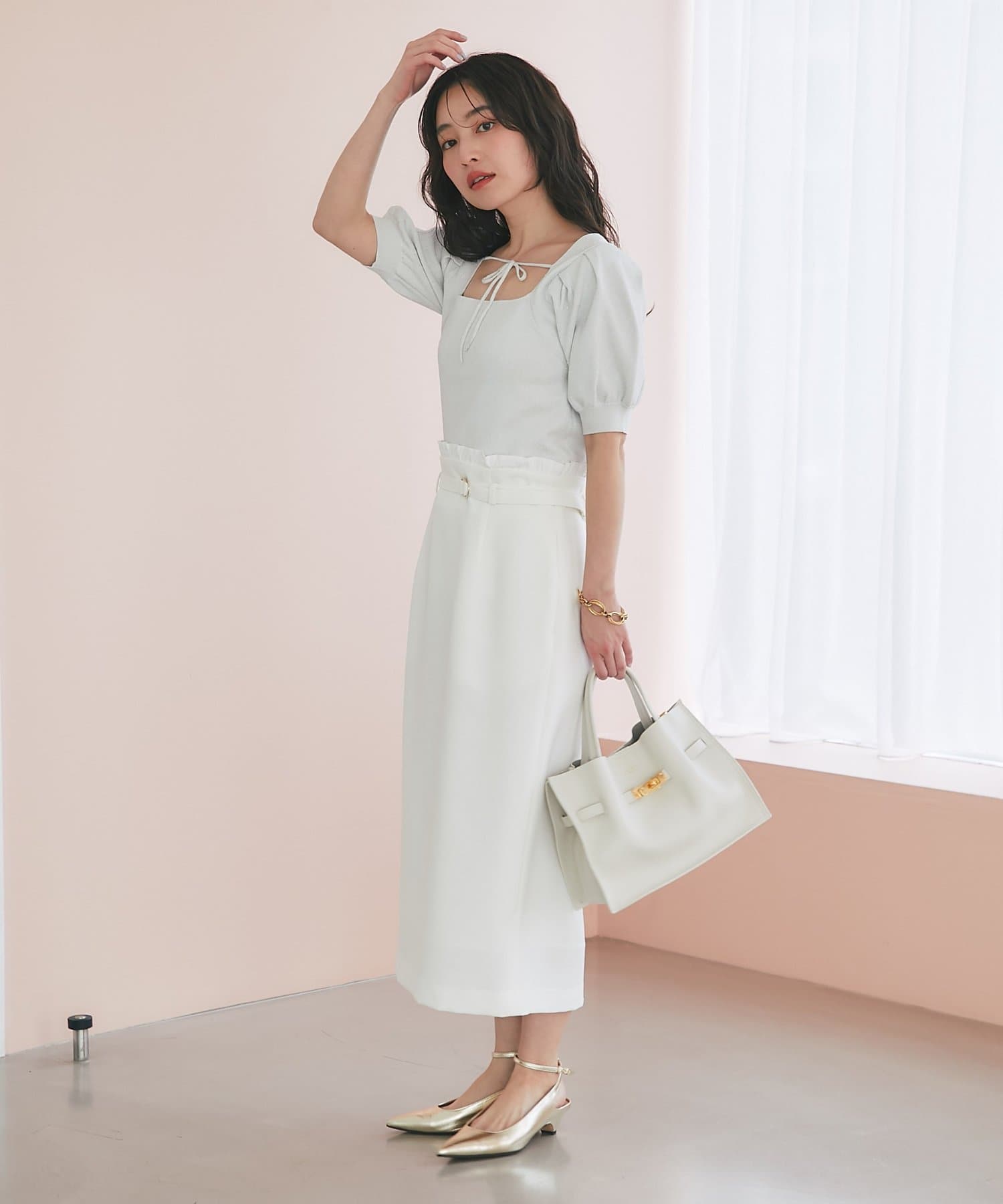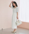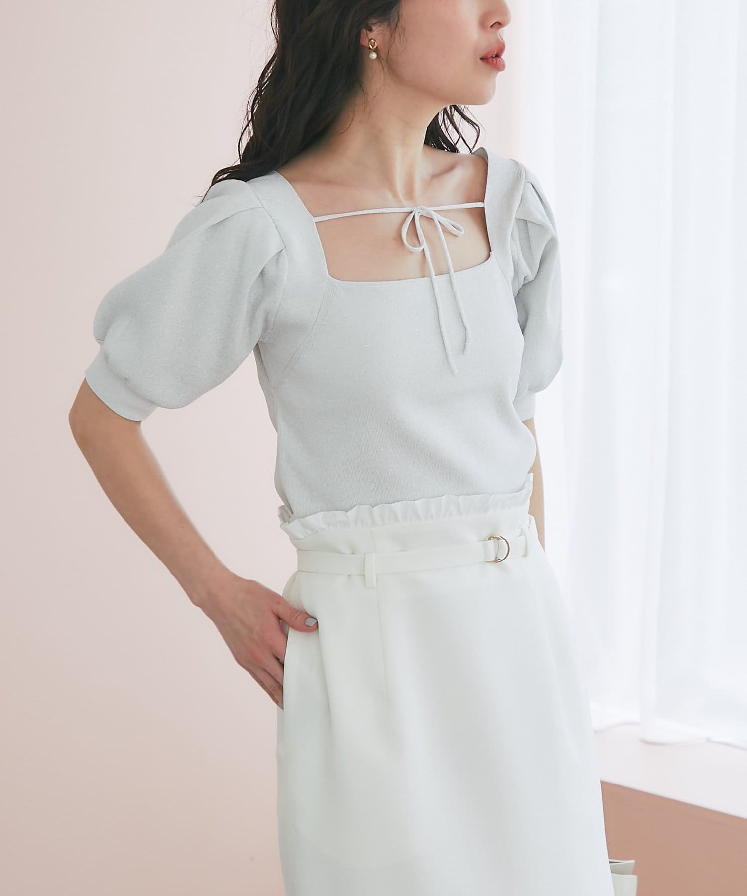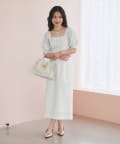 デコルテを美しく引き立てるスクエアネックに、華奢なリボンがポイント。