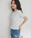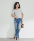 ラウンドネックがデコルテをきれいに見せ、女性らしい抜け感を演出。