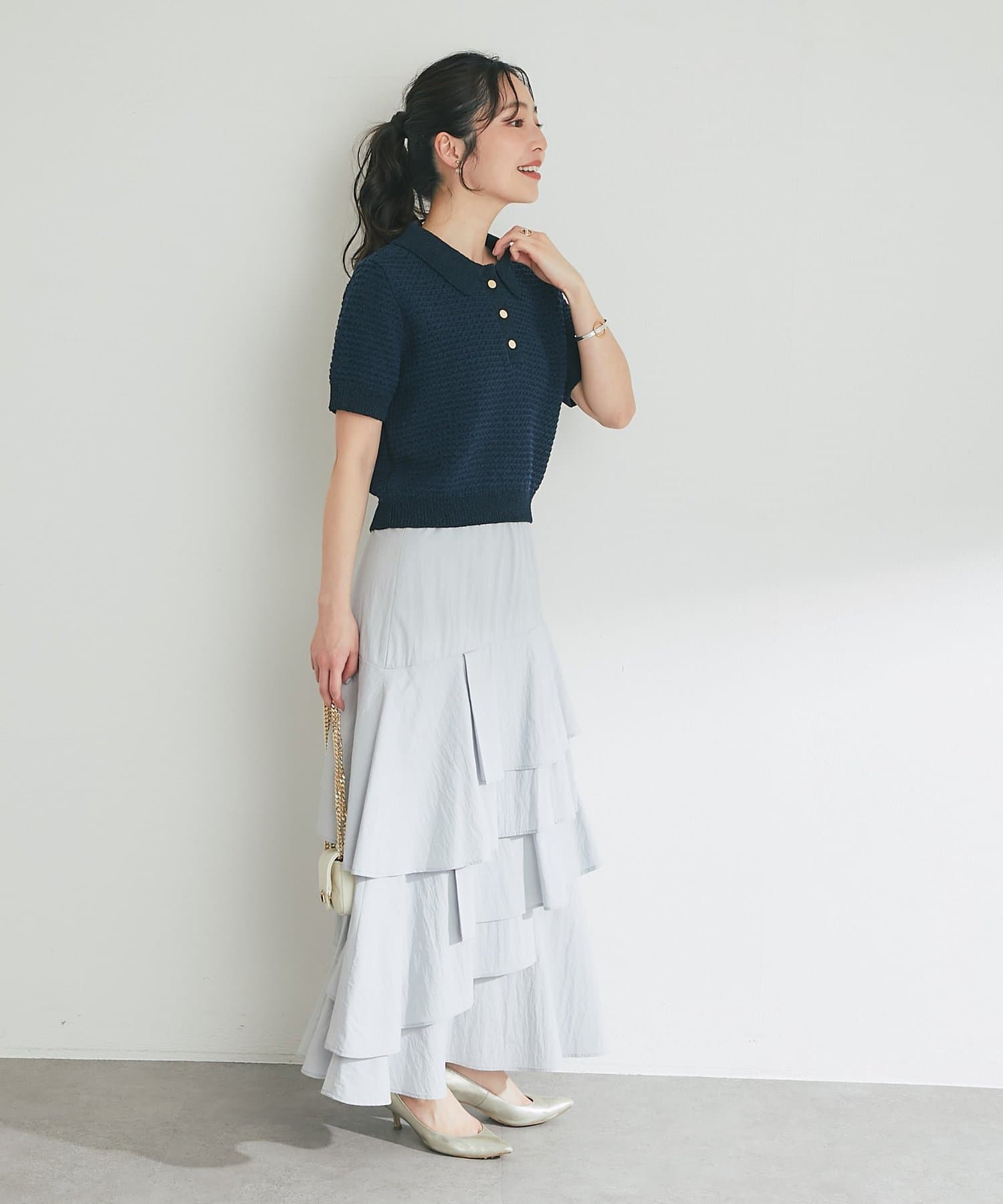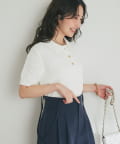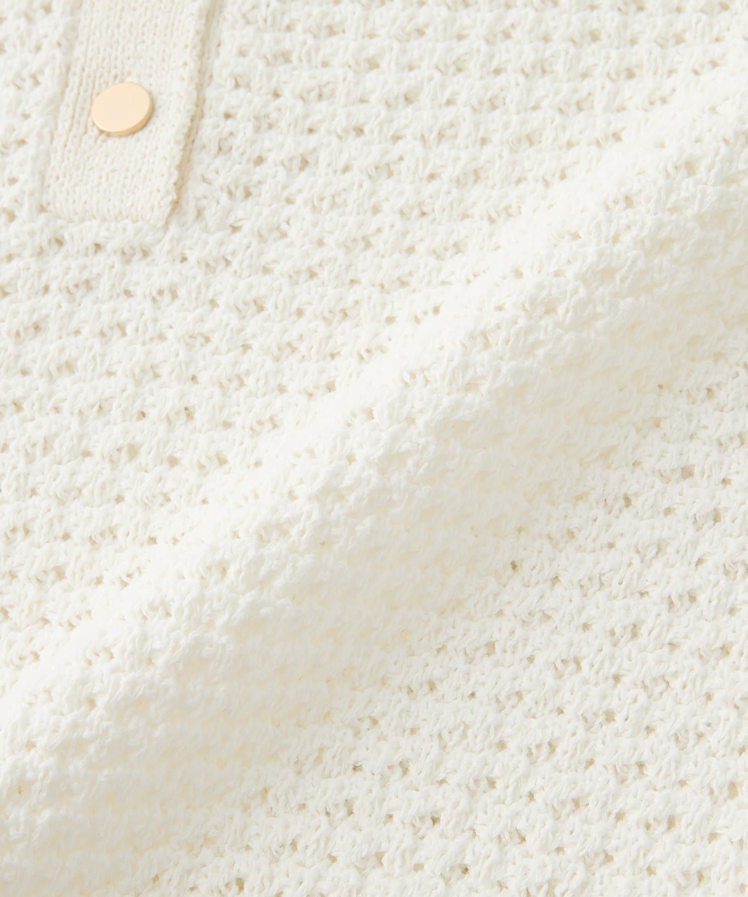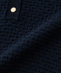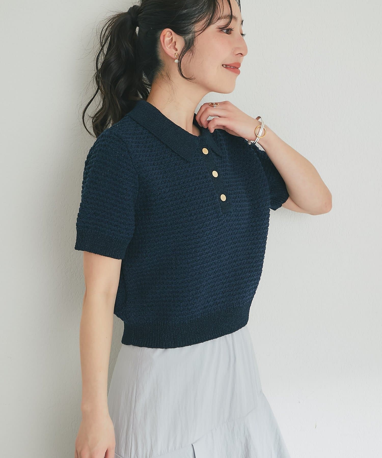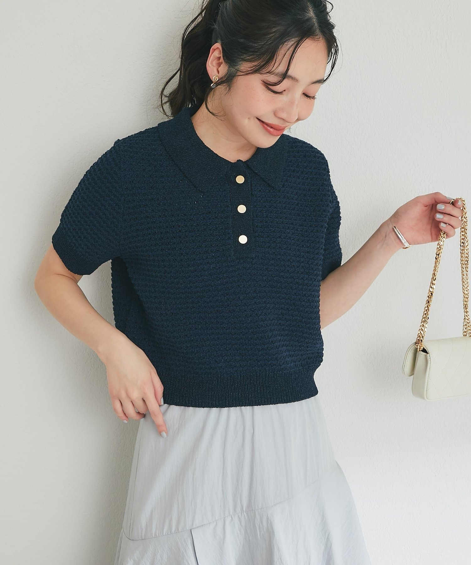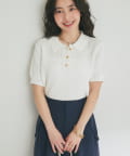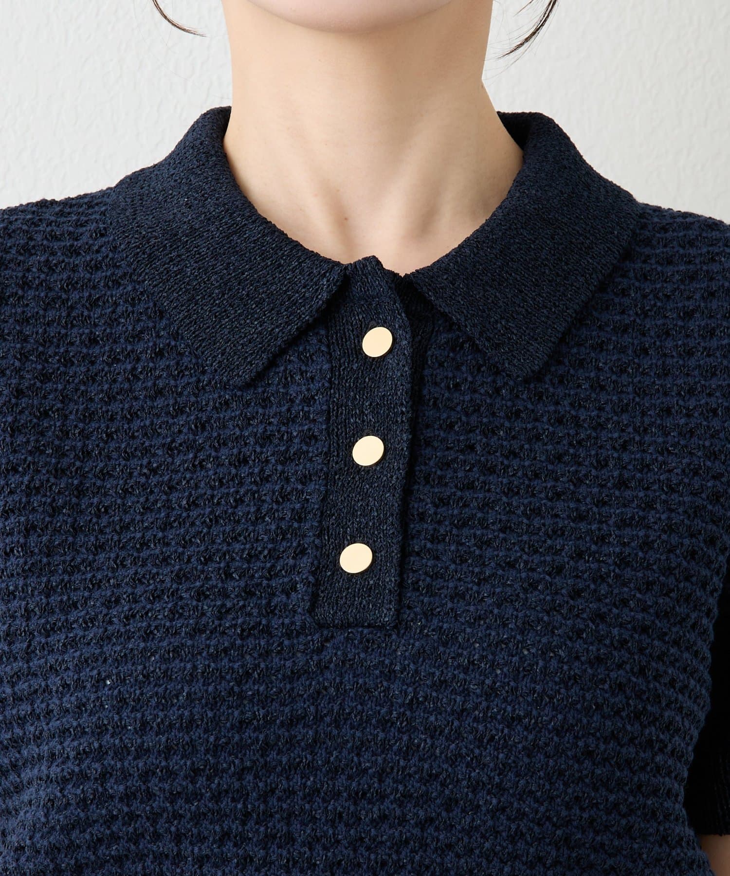 きちんと感のあるポロ襟と、フロントに並んだゴールドボタンが上品な印象に。
