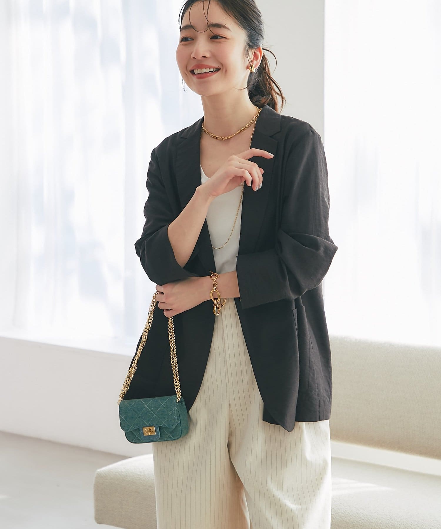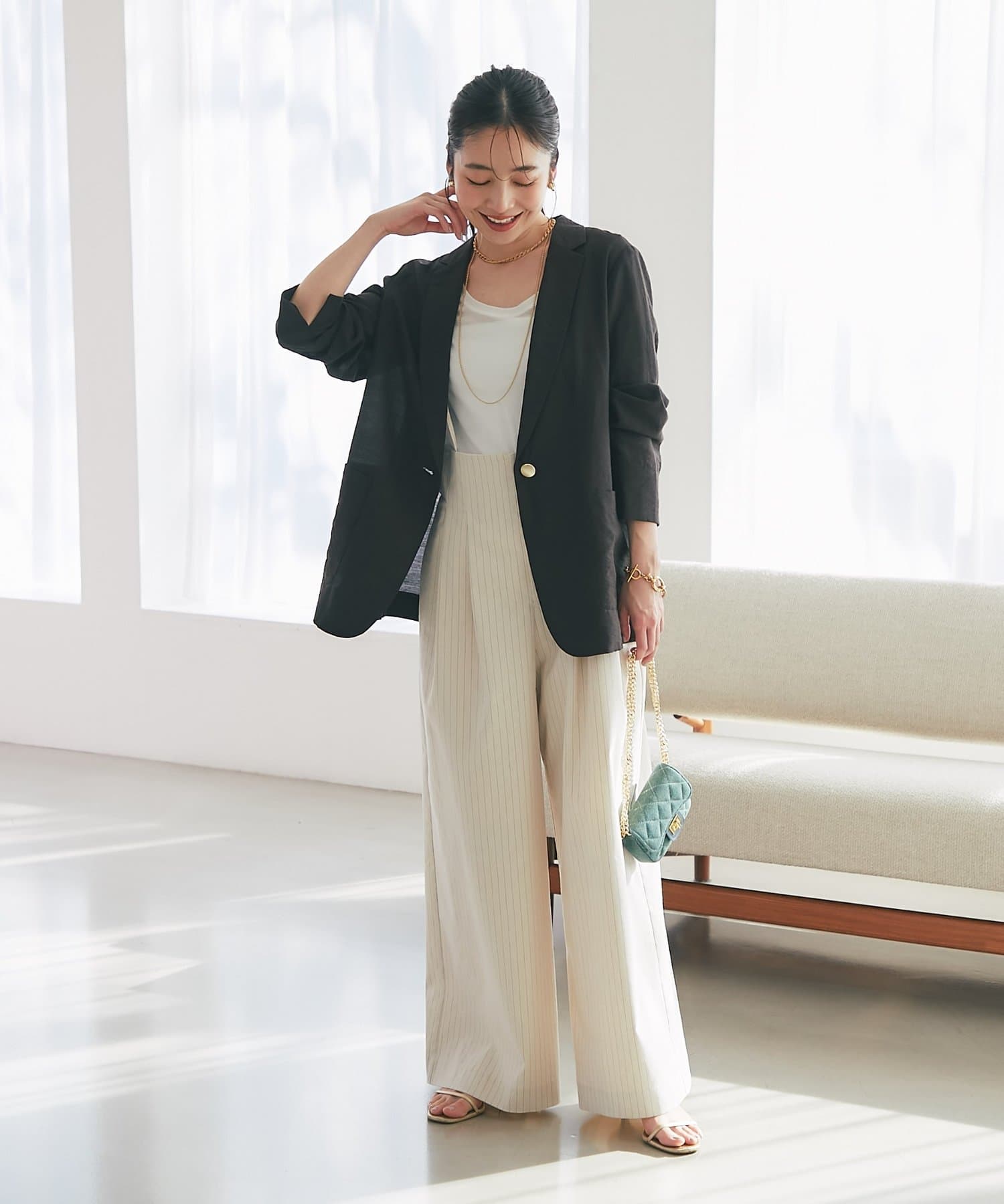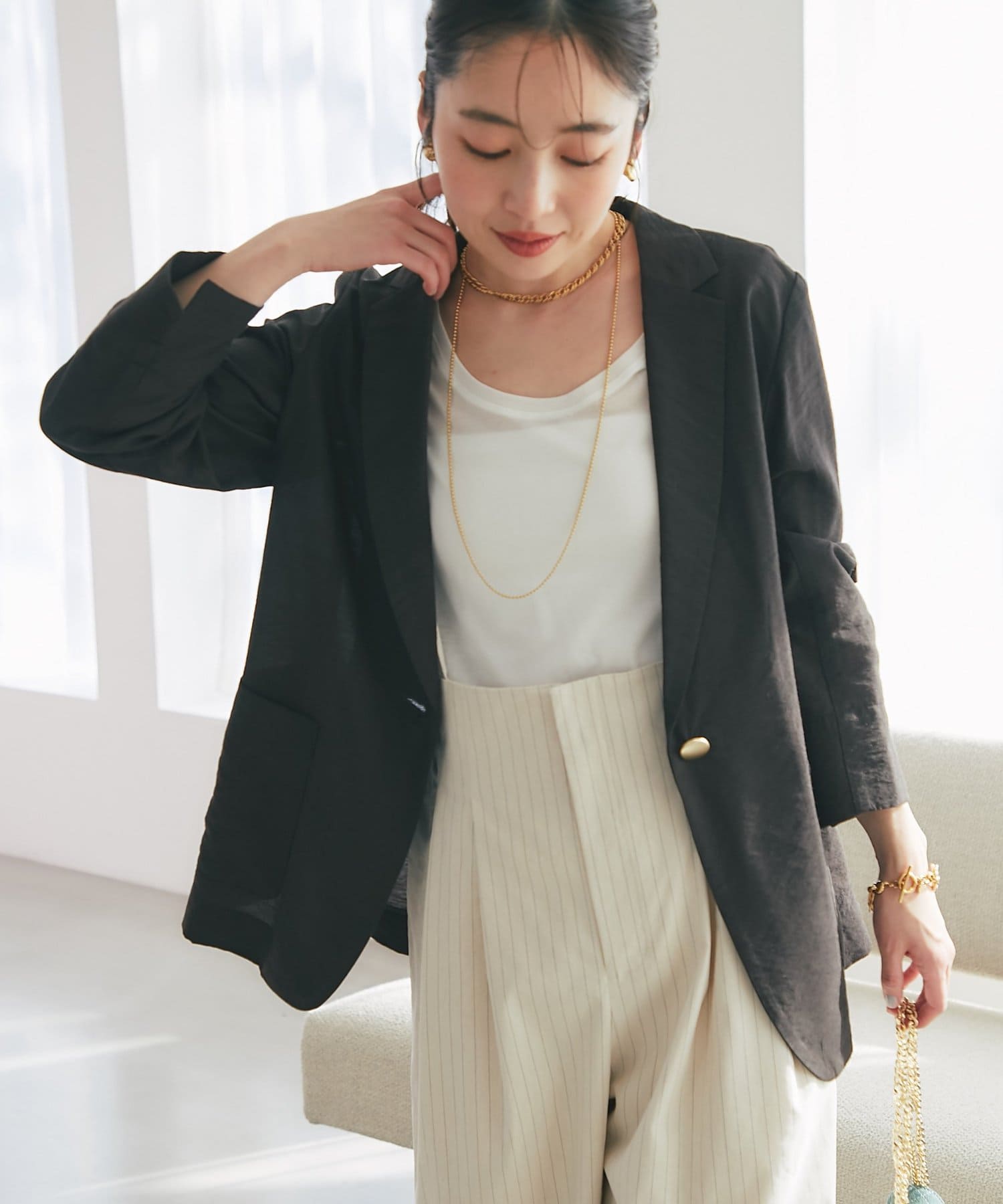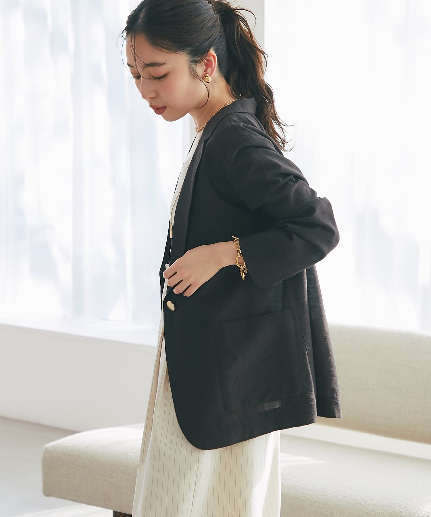 ゴールドのひとつボタンがぐ上品な印象をプラス。