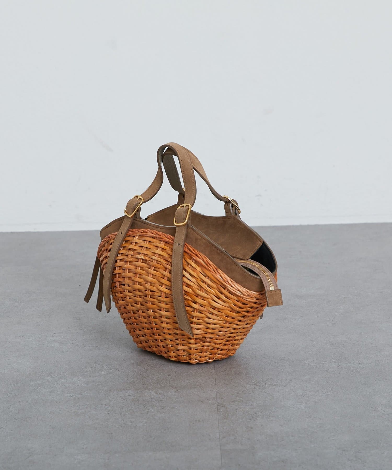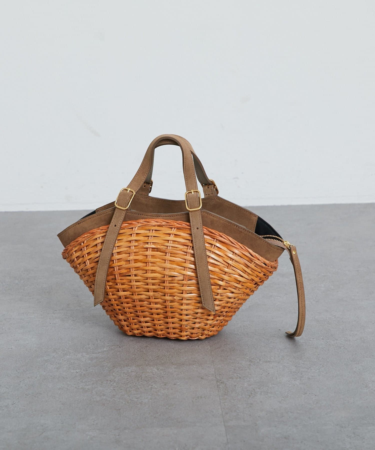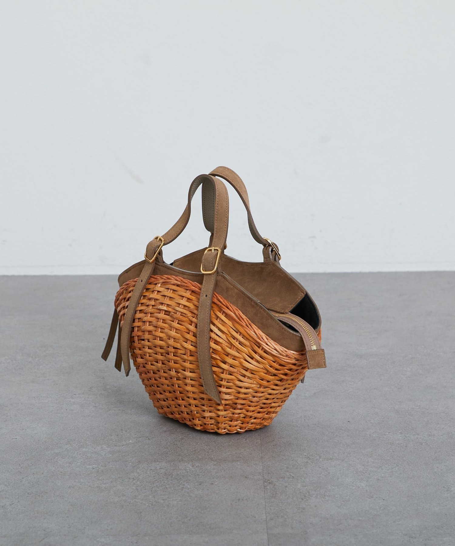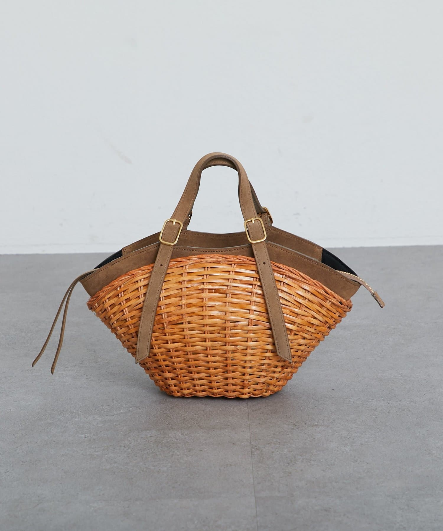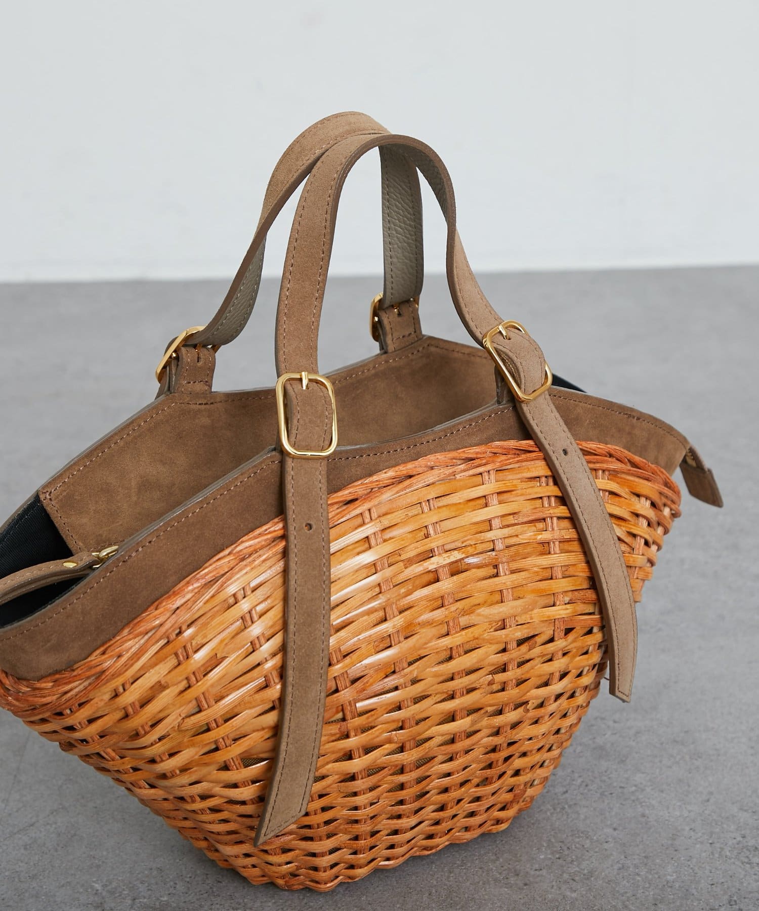 スエード使いを効かせたスプリットラタンのトートバッグ。
