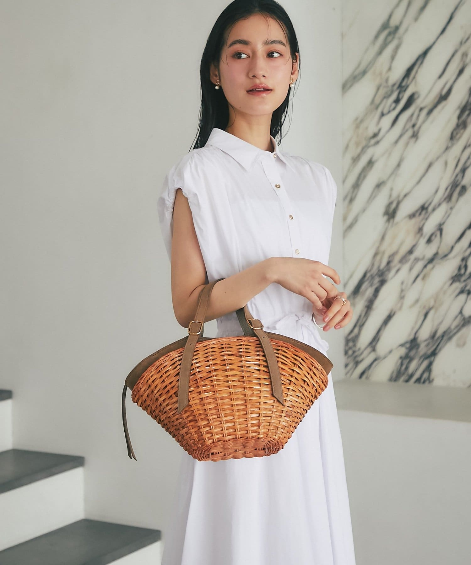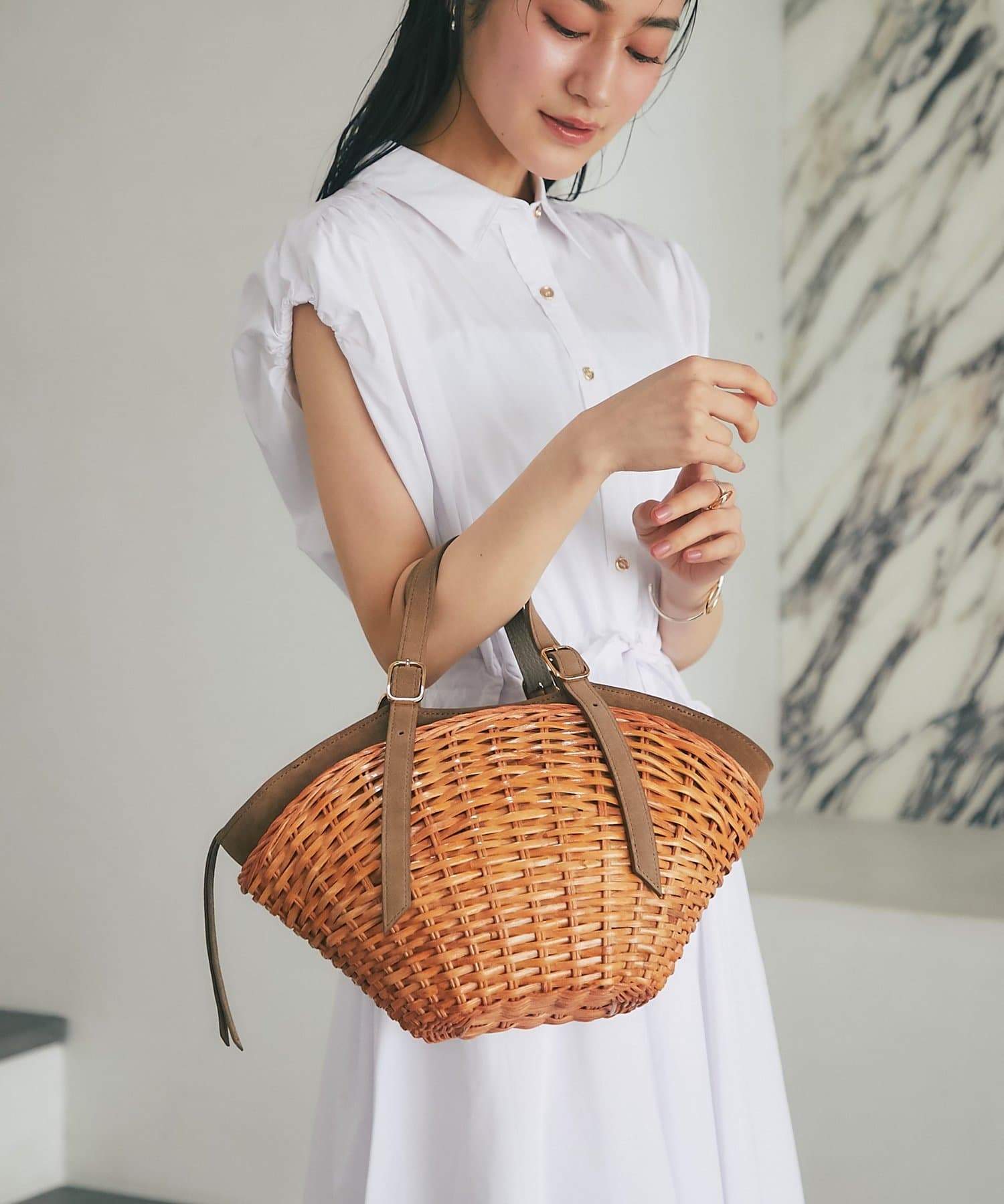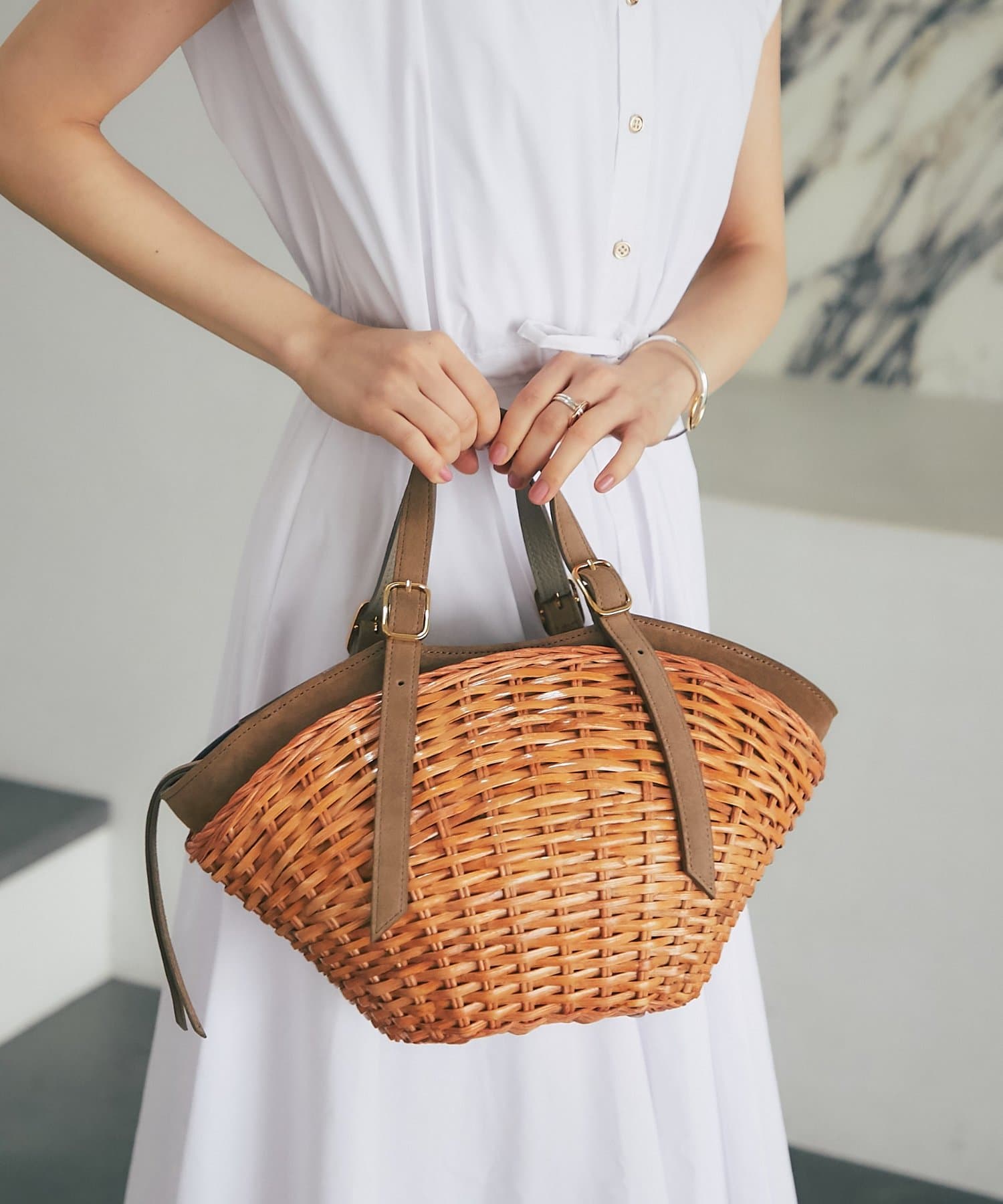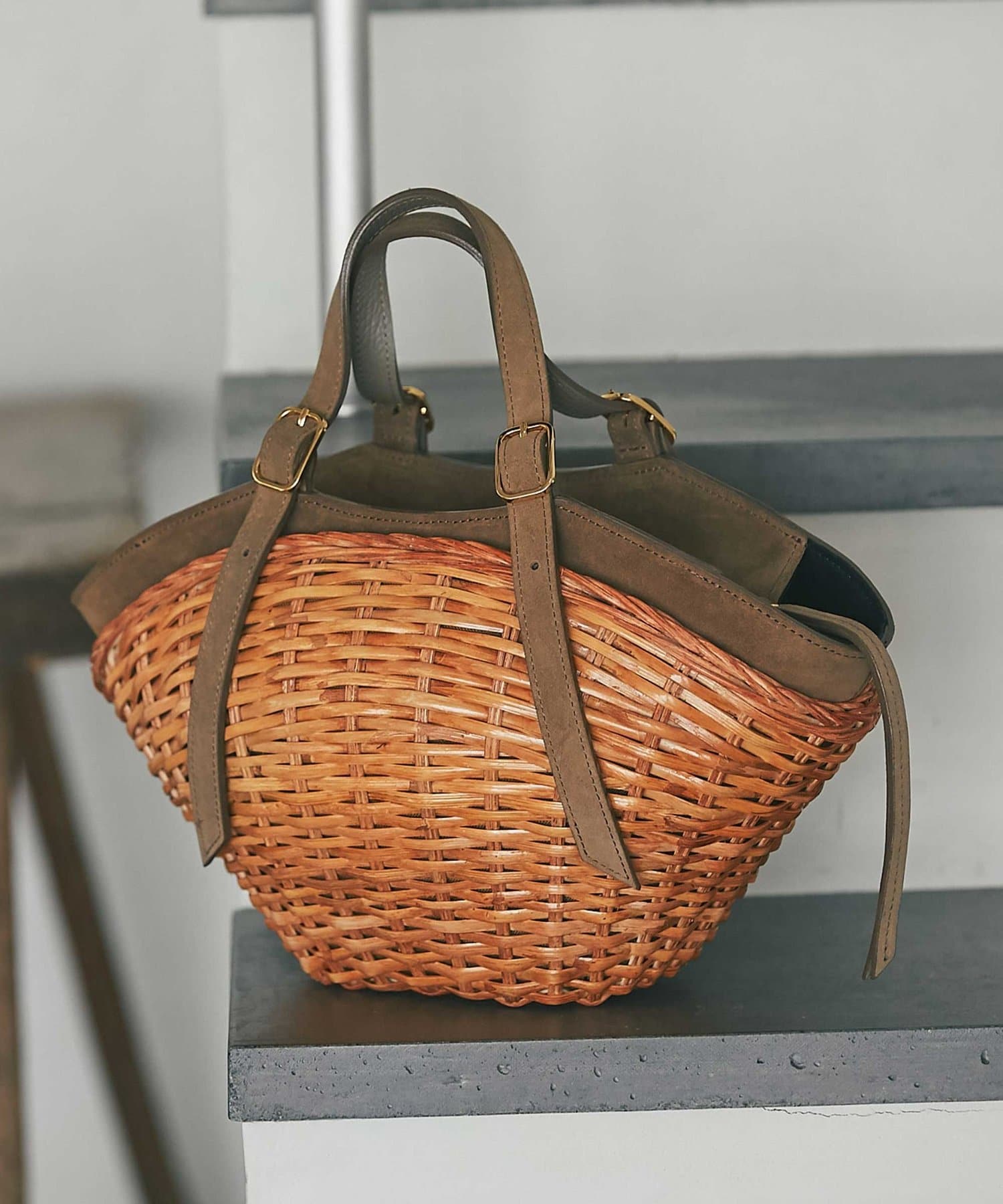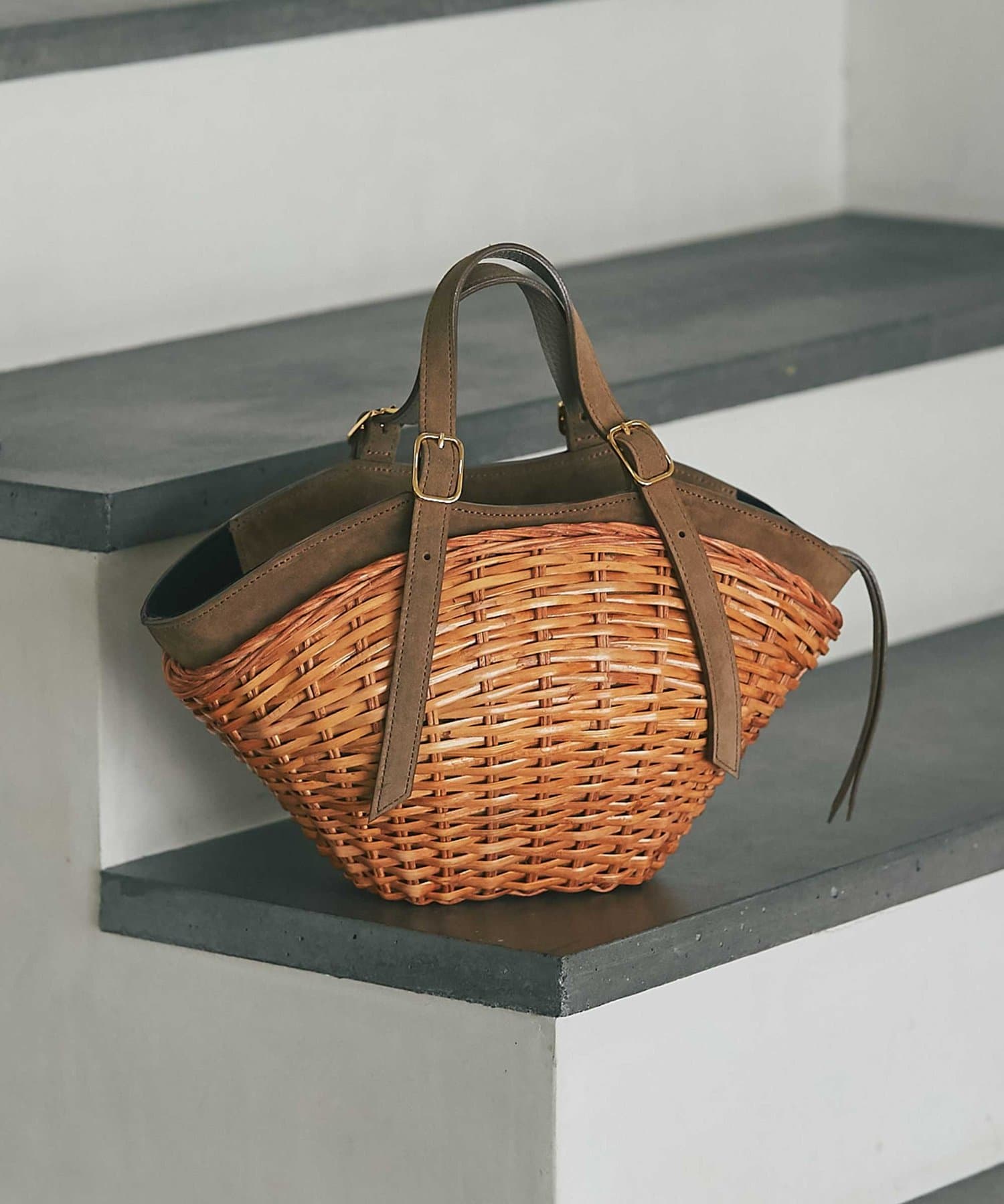 スエード使いを効かせたスプリットラタンのトートバッグ。