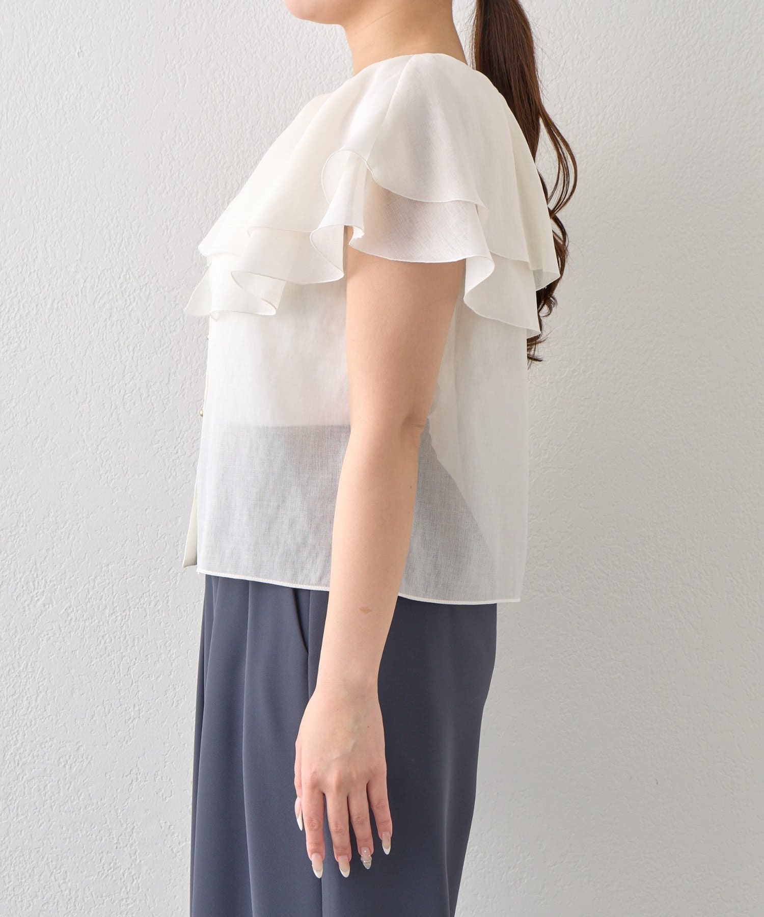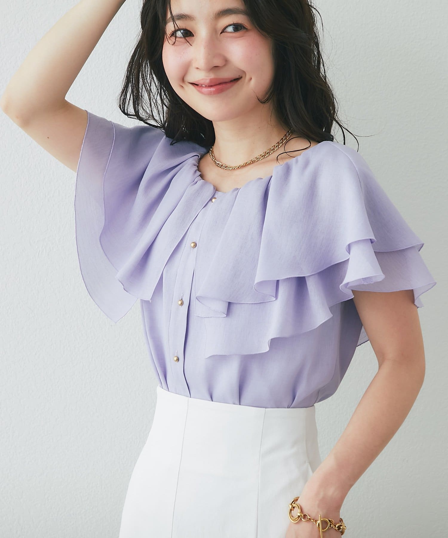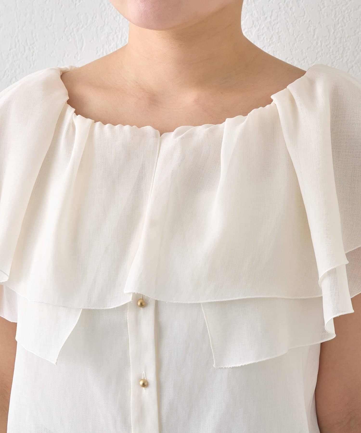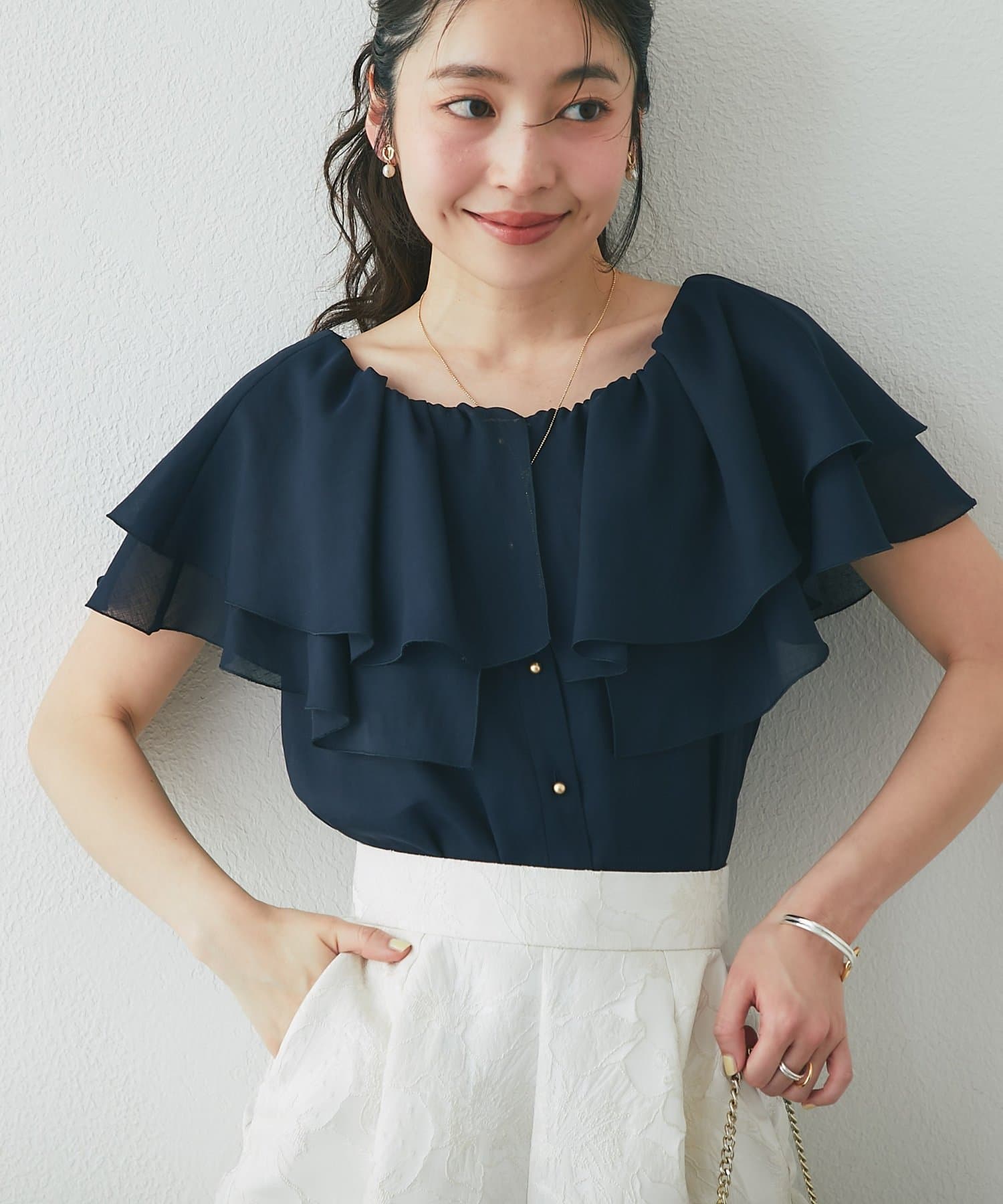 重なり合うフレアカラーが動くたびにふんわり揺れ、女性らしい印象を引き立てます。