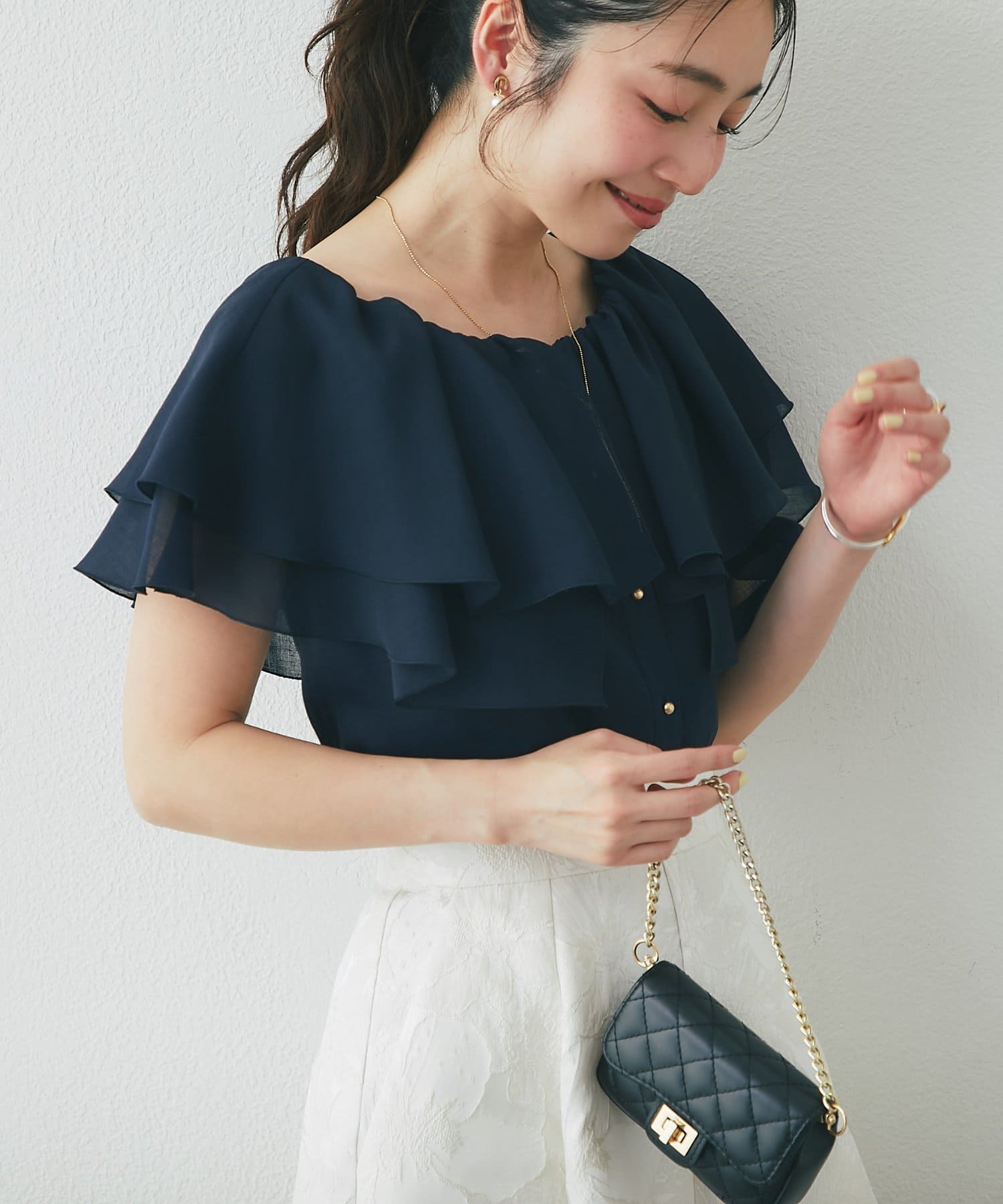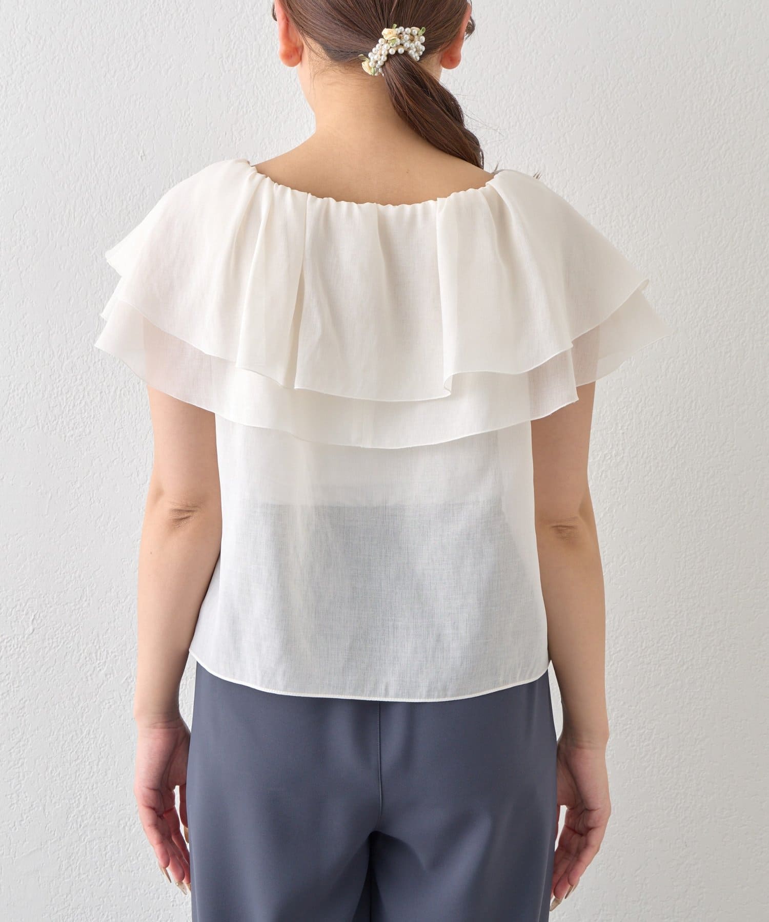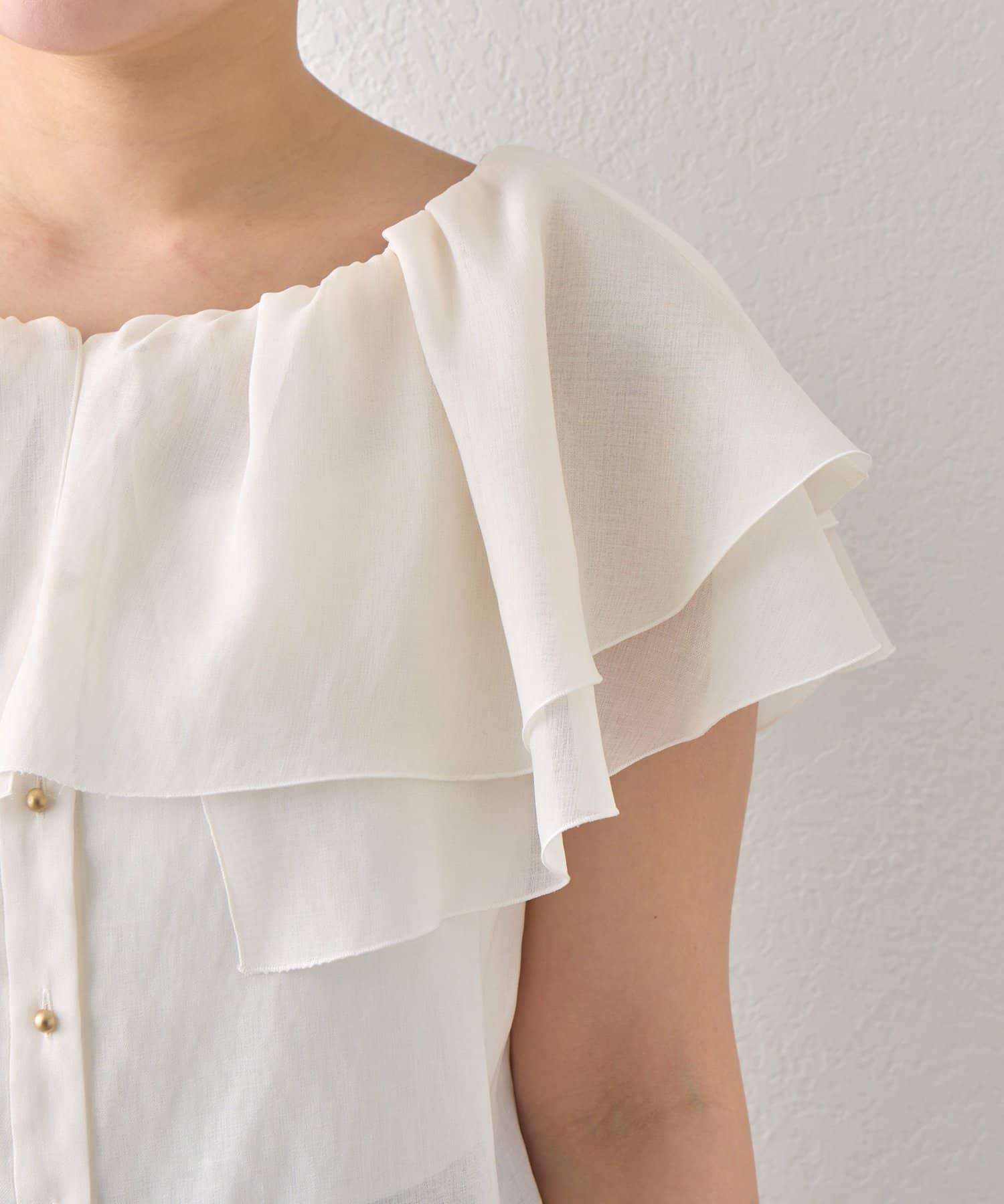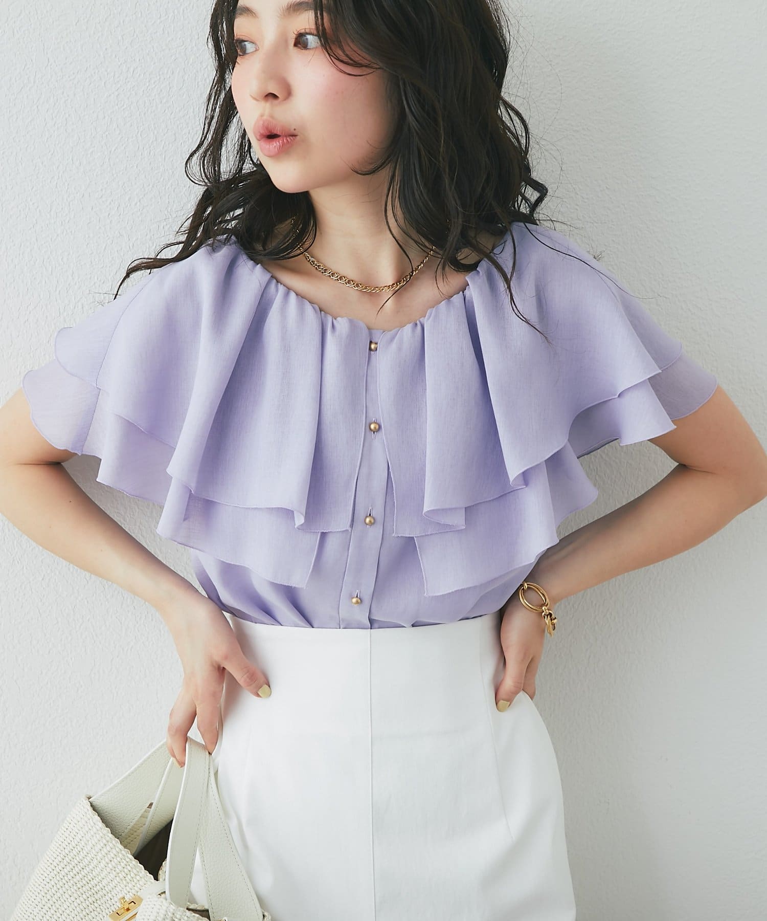 重なり合うフレアカラーが動くたびにふんわり揺れ、女性らしい印象を引き立てます。