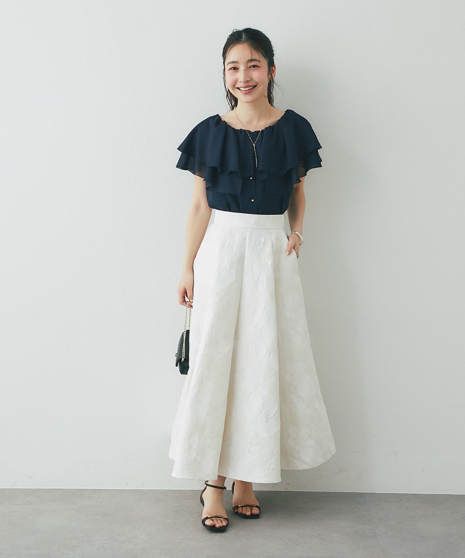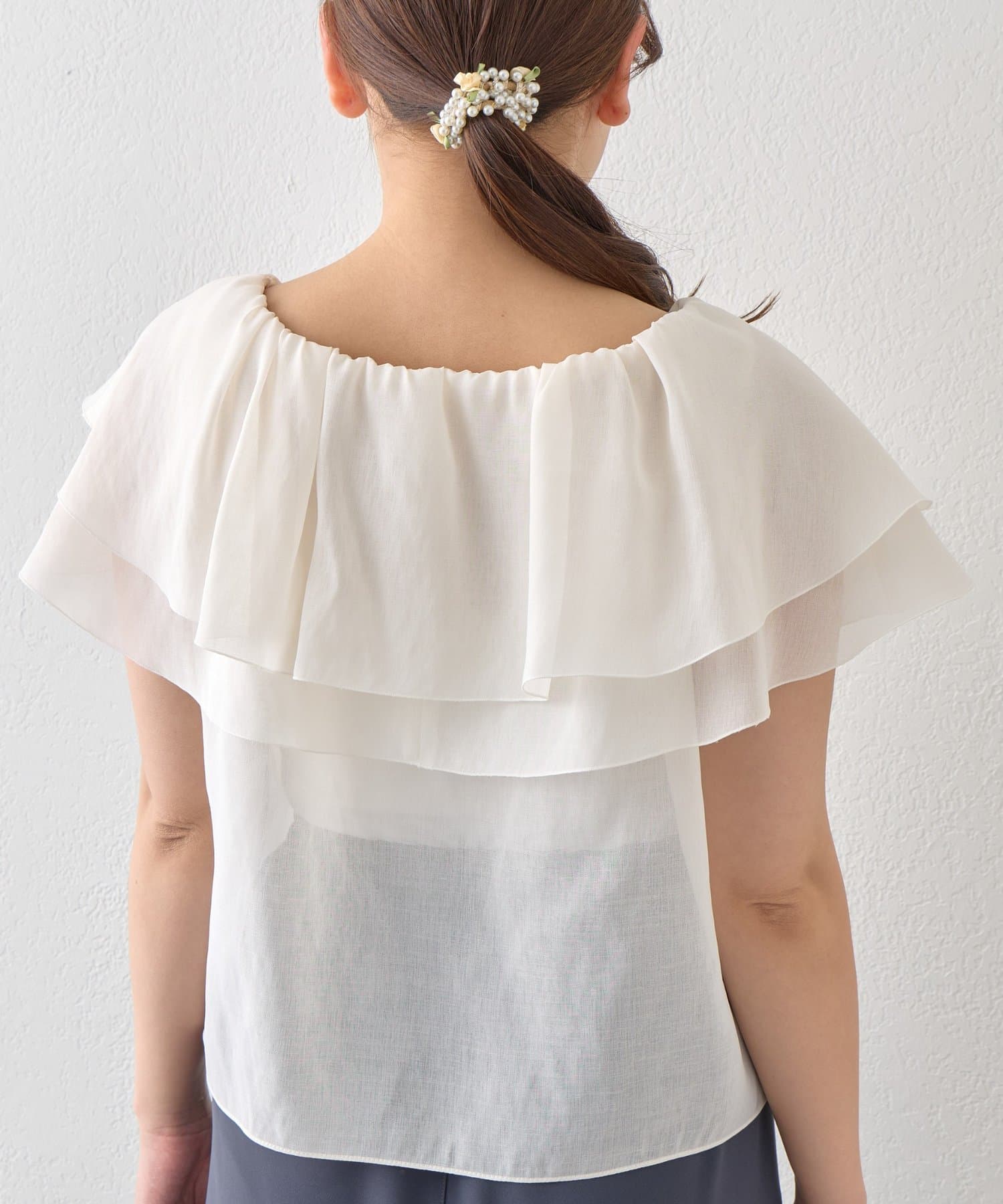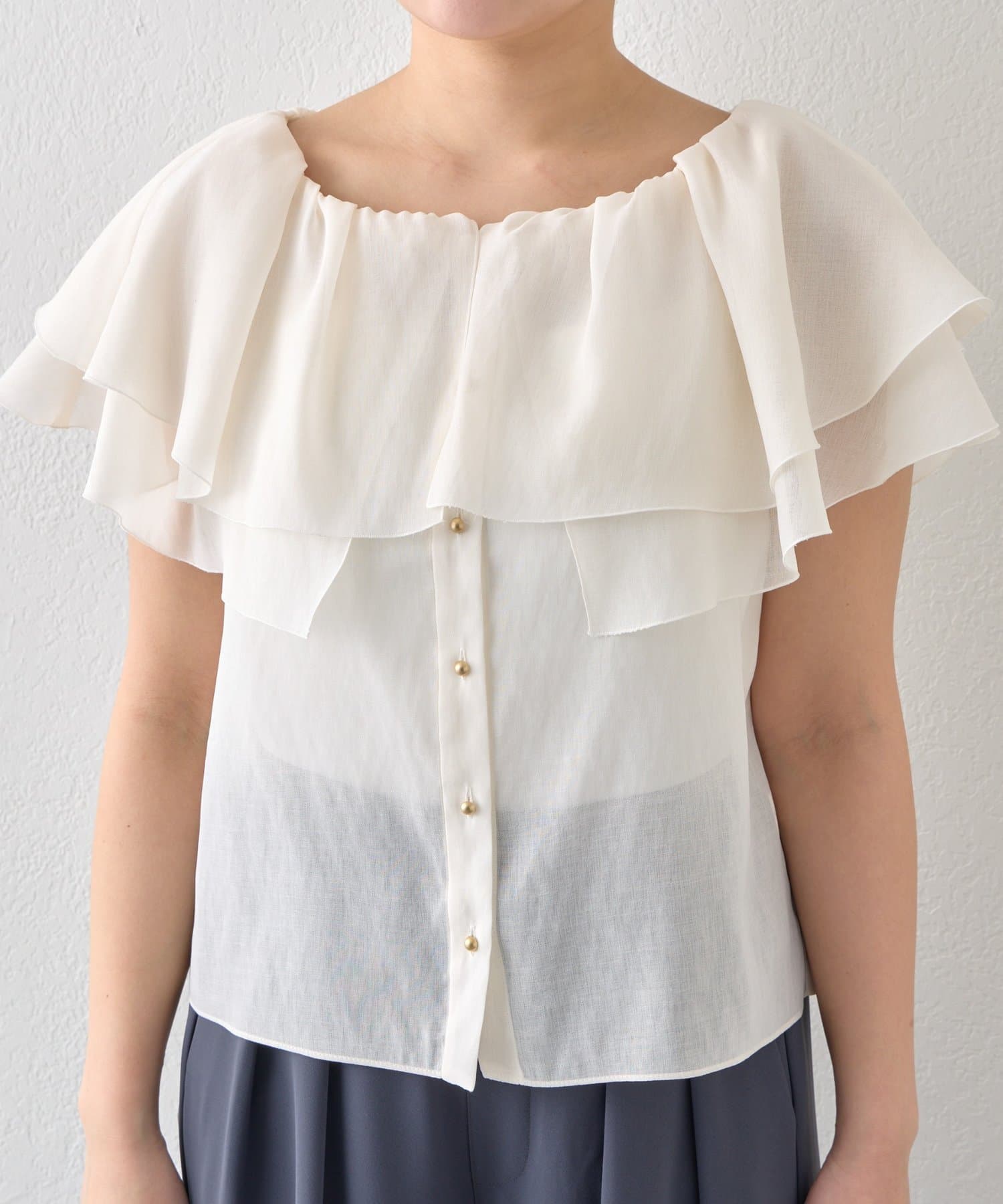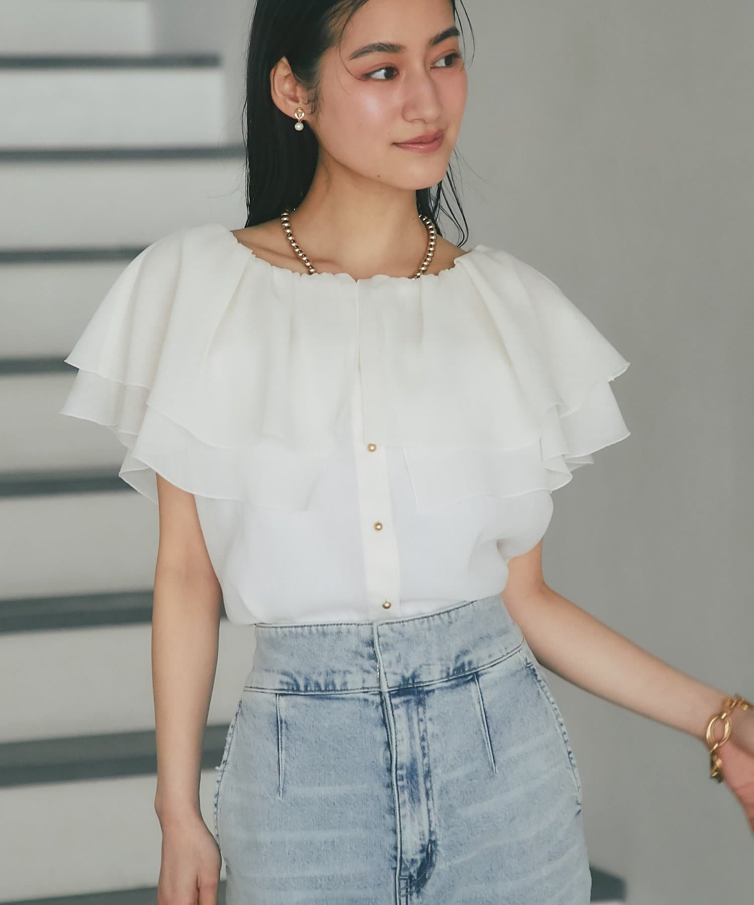 重なり合うフレアカラーが動くたびにふんわり揺れ、女性らしい印象を引き立てます。