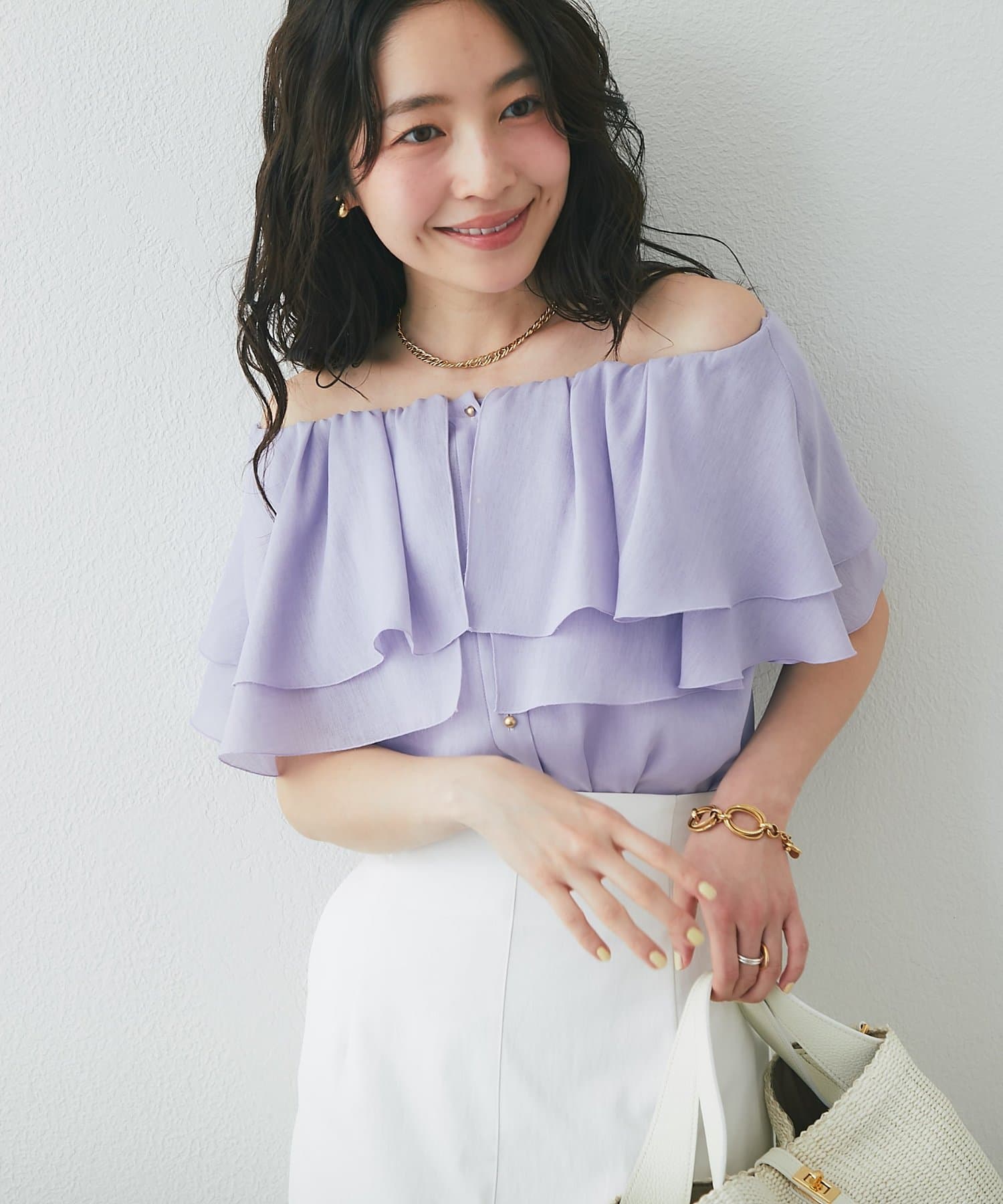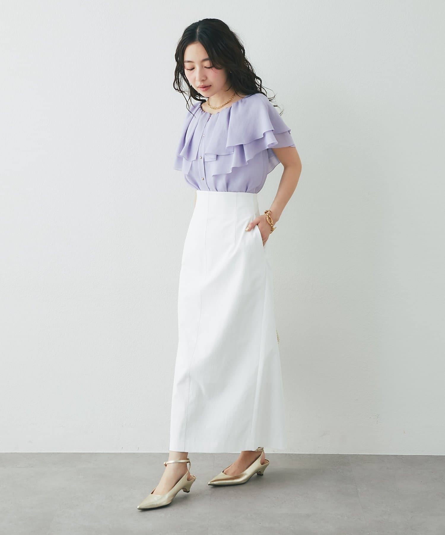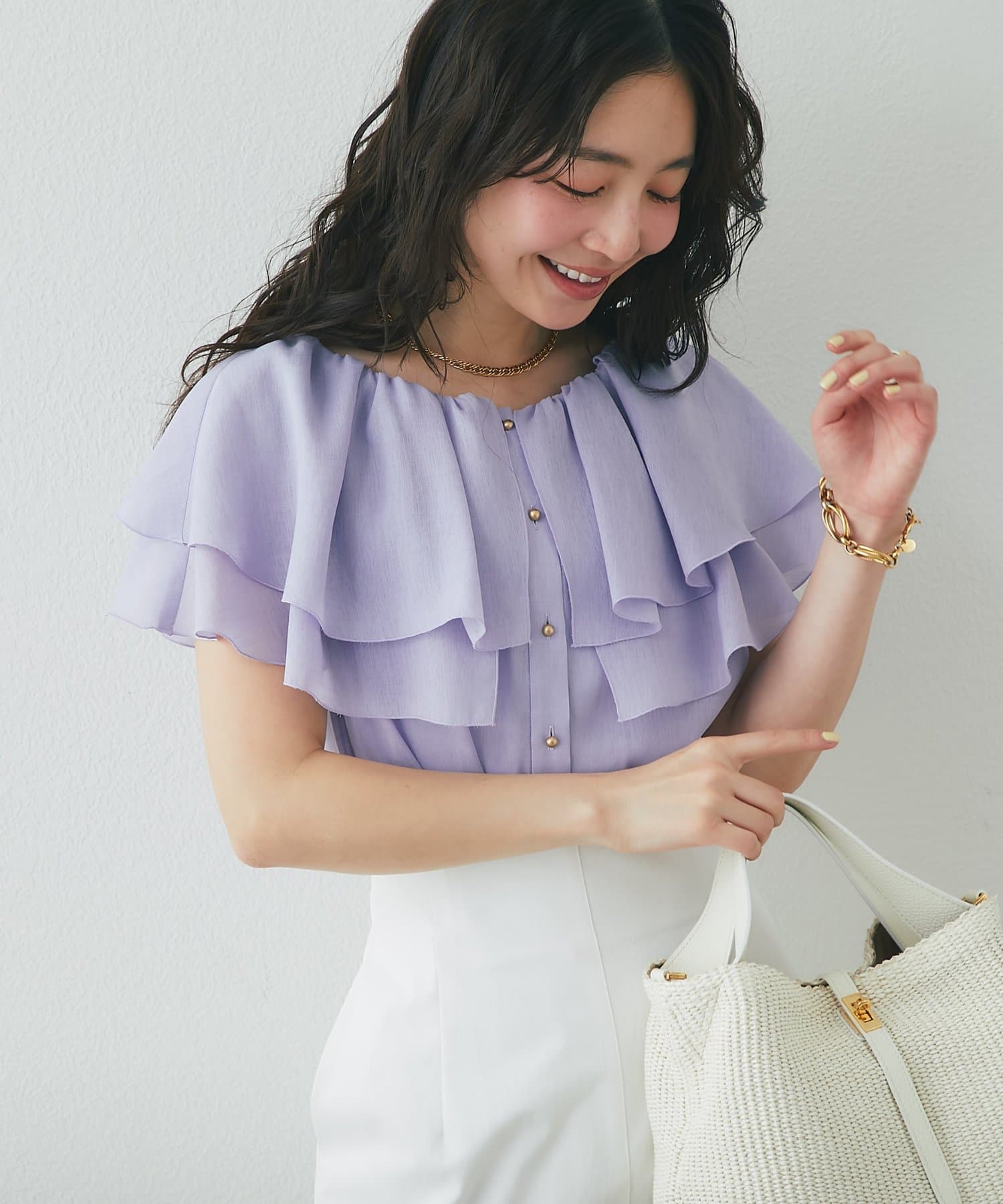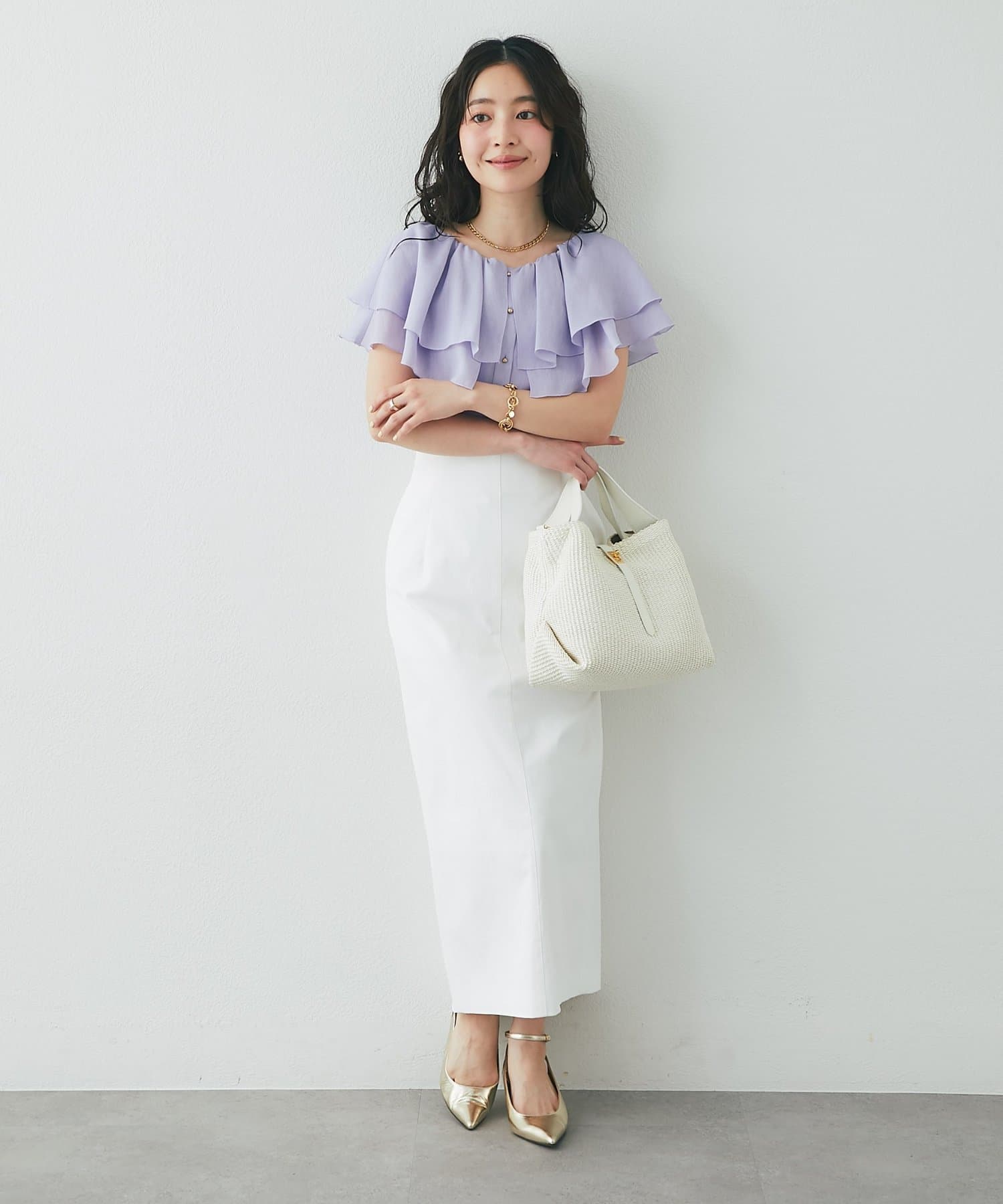 タイトスカートやきれいめパンツに合わせた、上品フェミニンな着こなしがおすすめ。