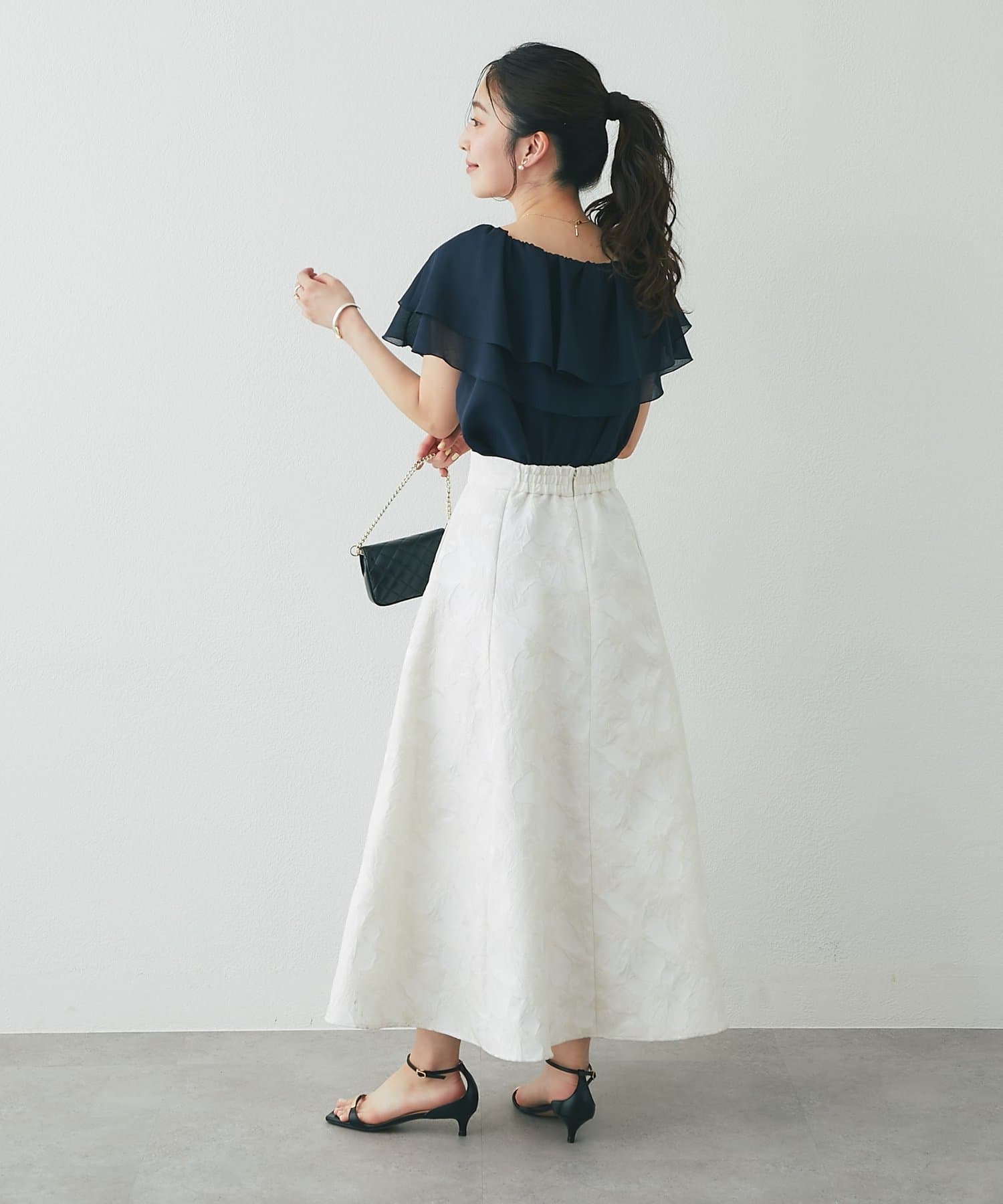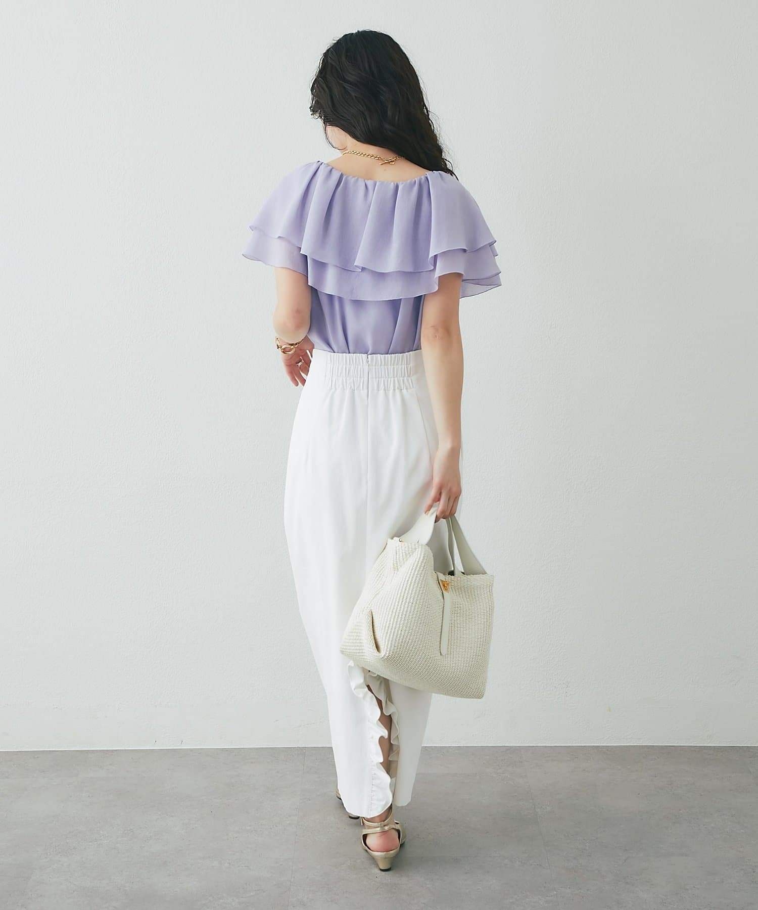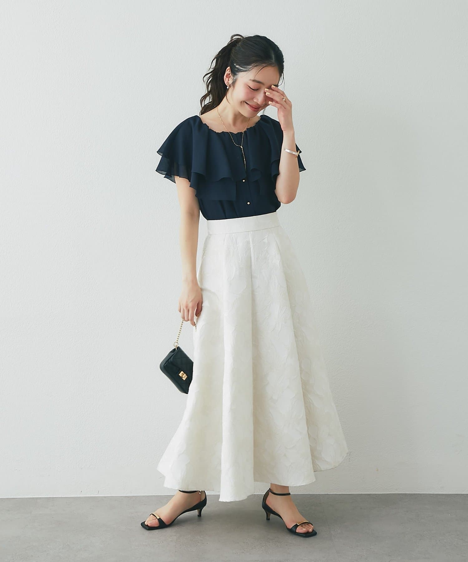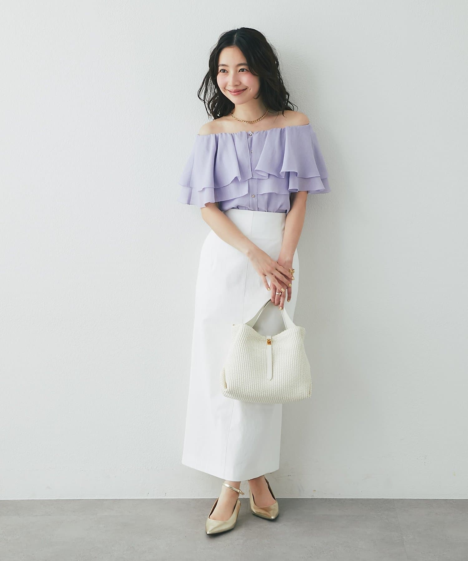 タイトスカートやきれいめパンツに合わせた、上品フェミニンな着こなしがおすすめ。