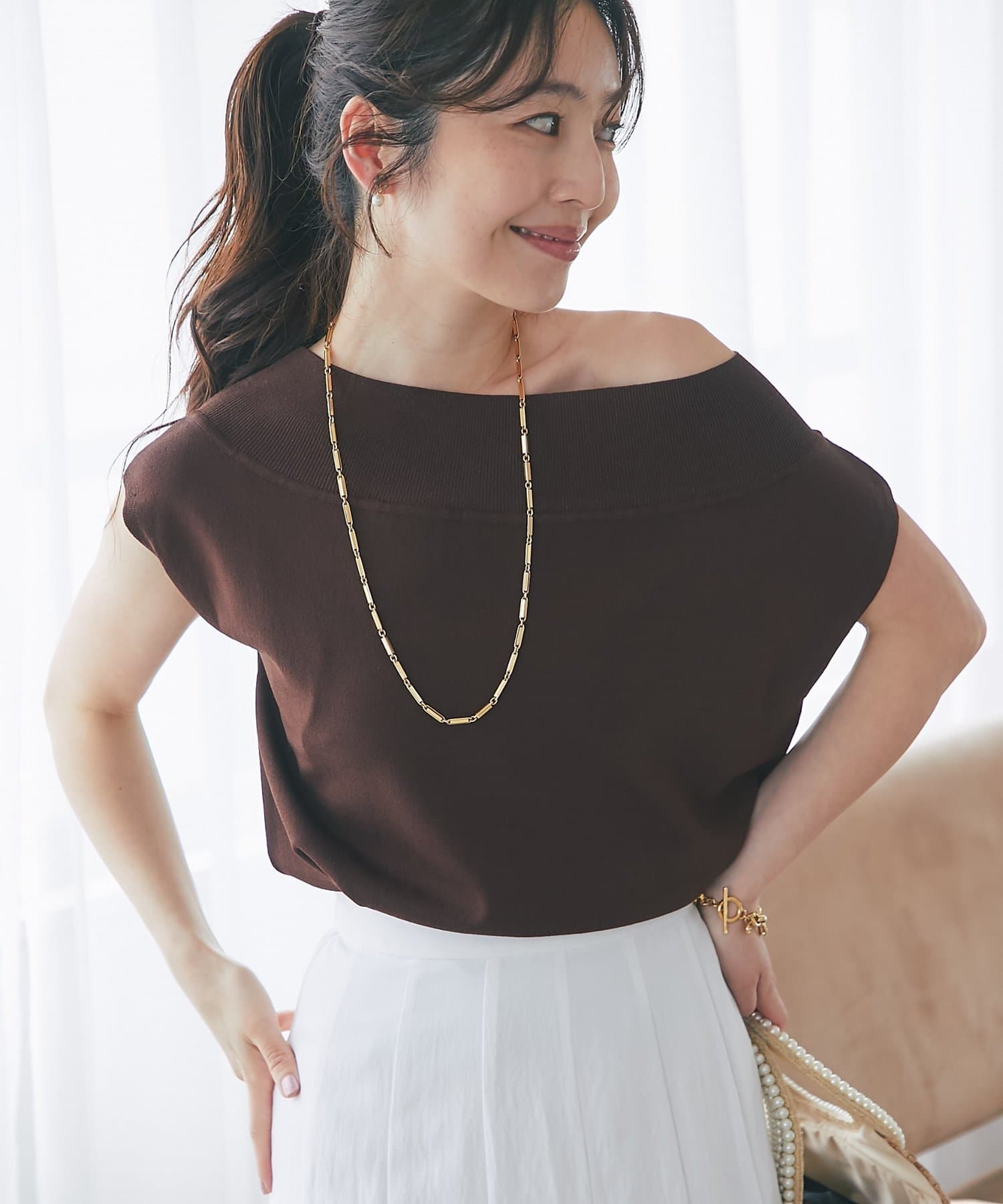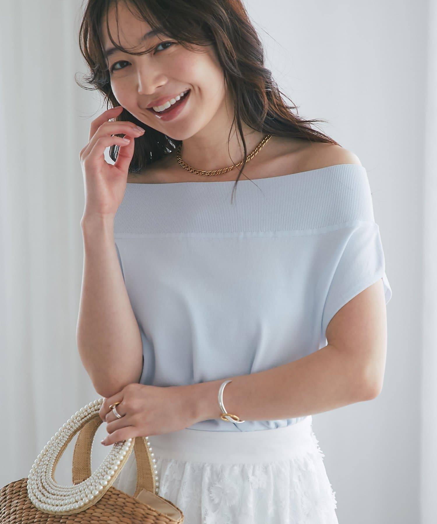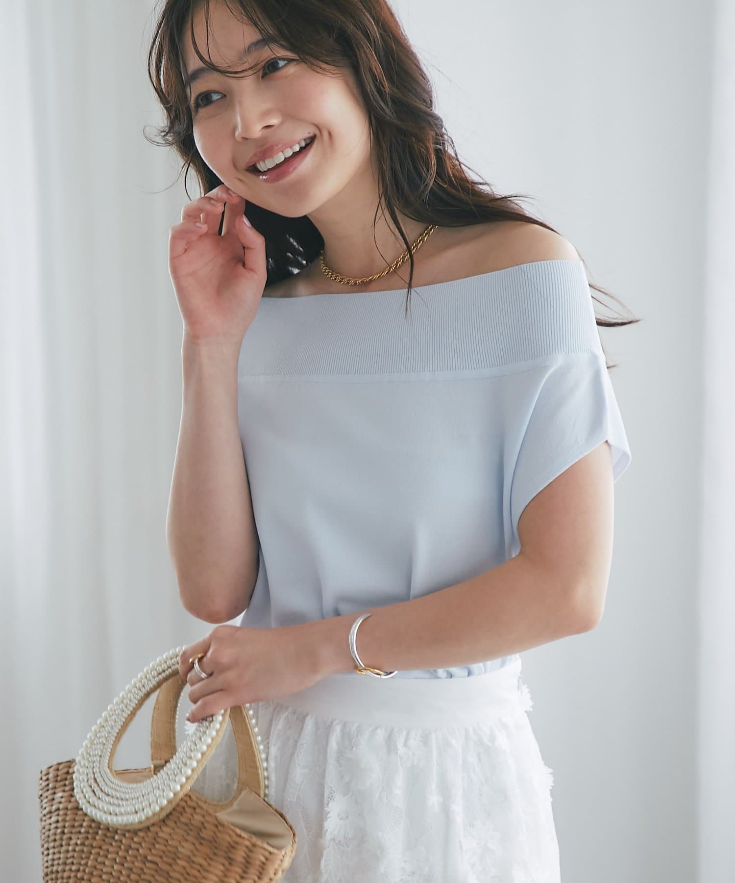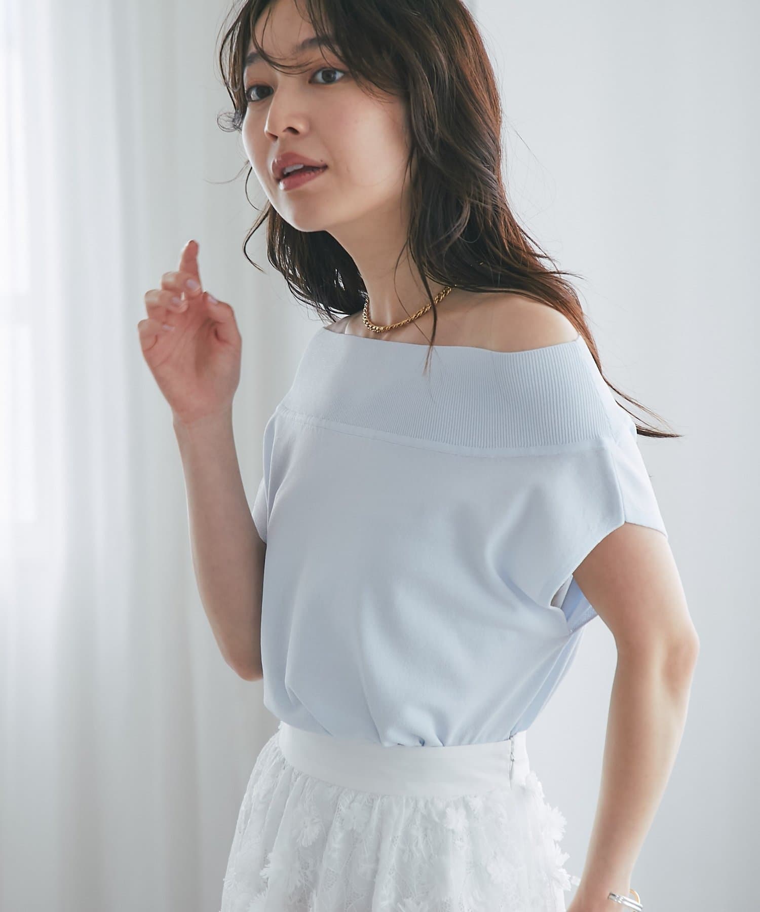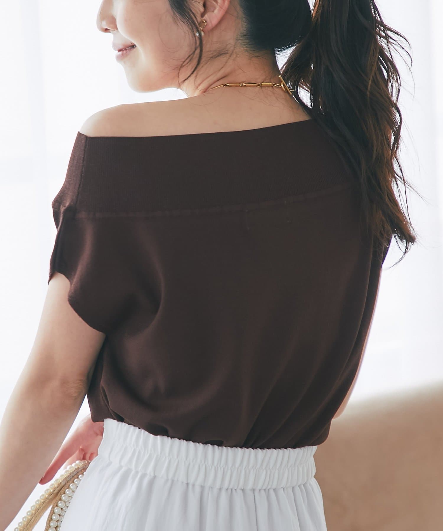 軽く肩を落とせばオフショルとしての着こなしも楽しめます。