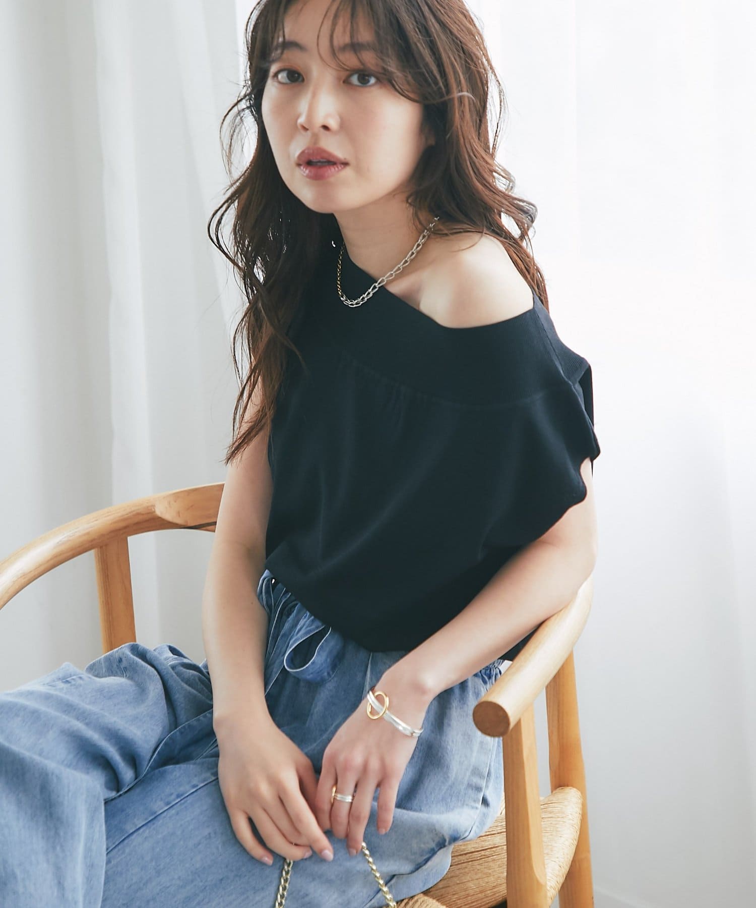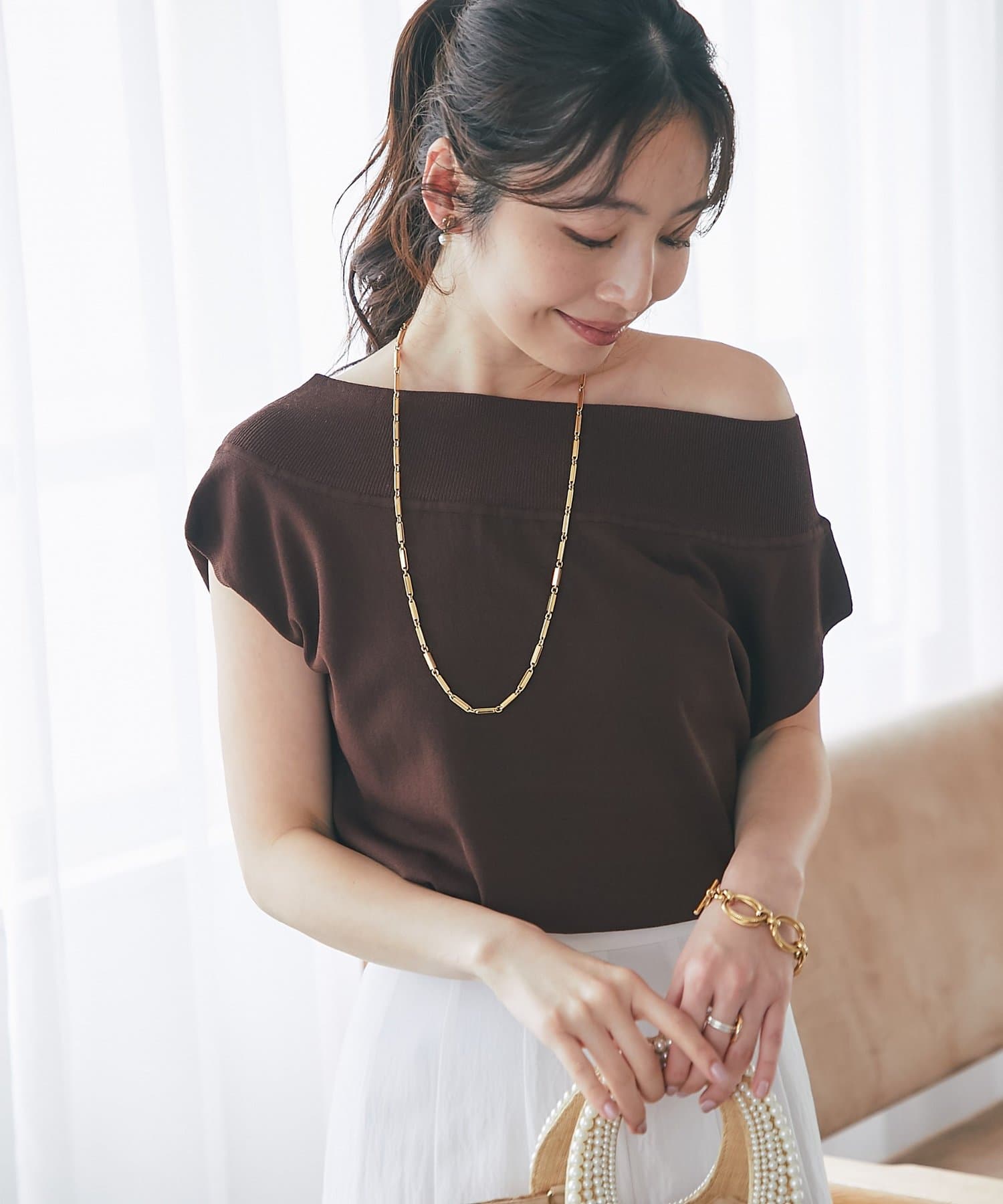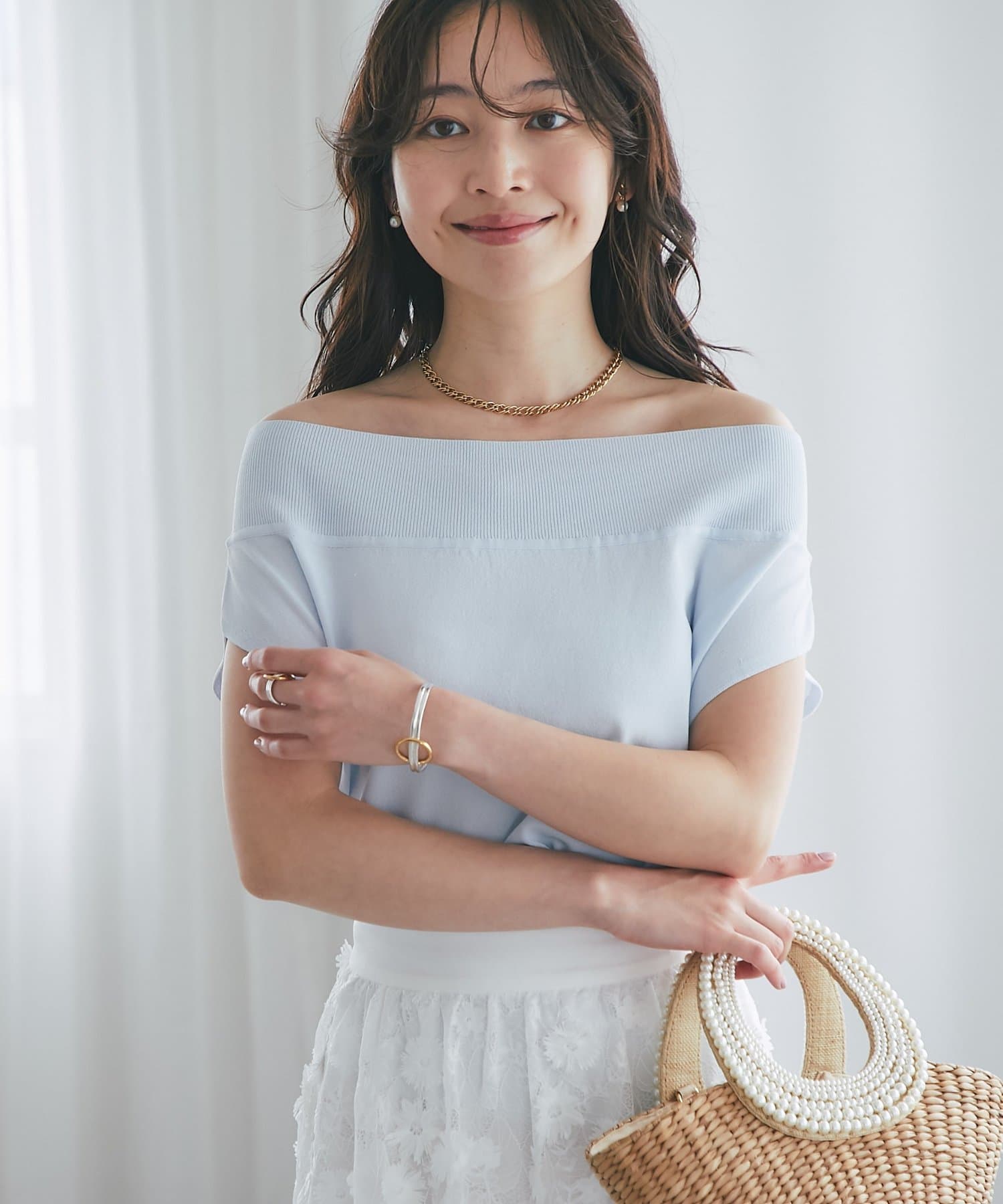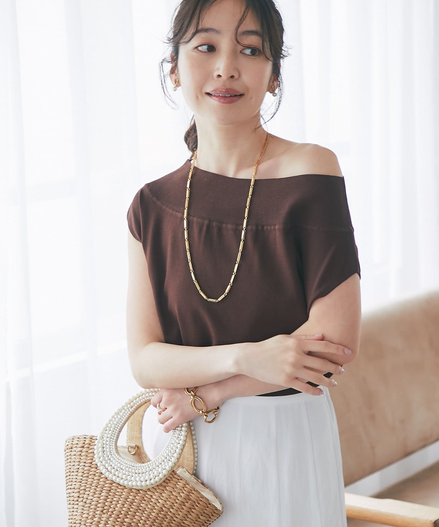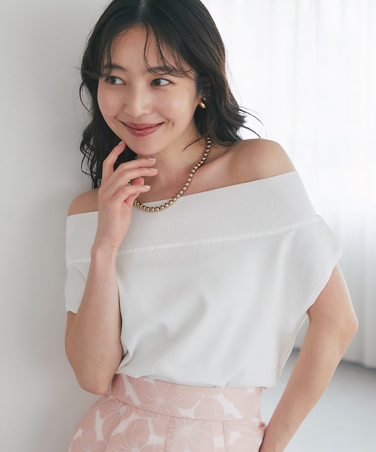 軽く肩を落とせばオフショルとしての着こなしも楽しめます。