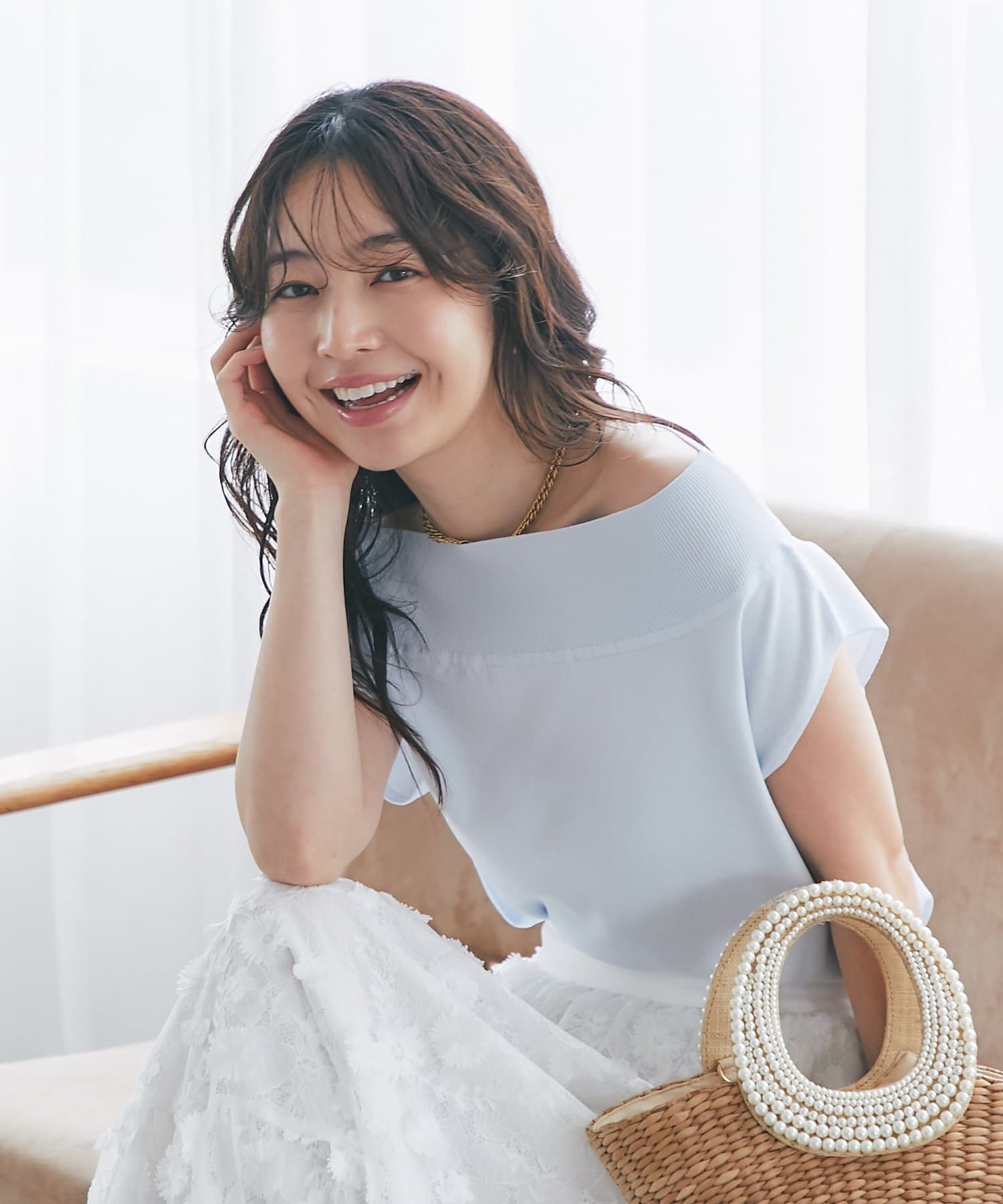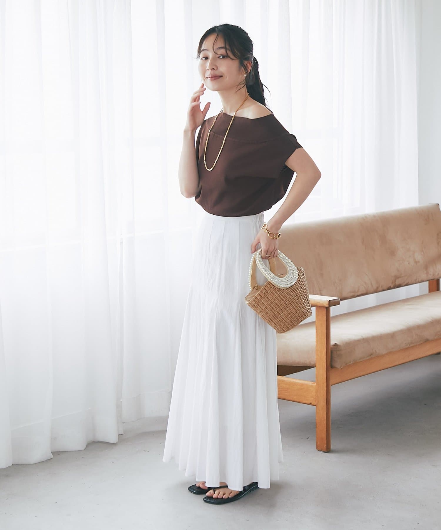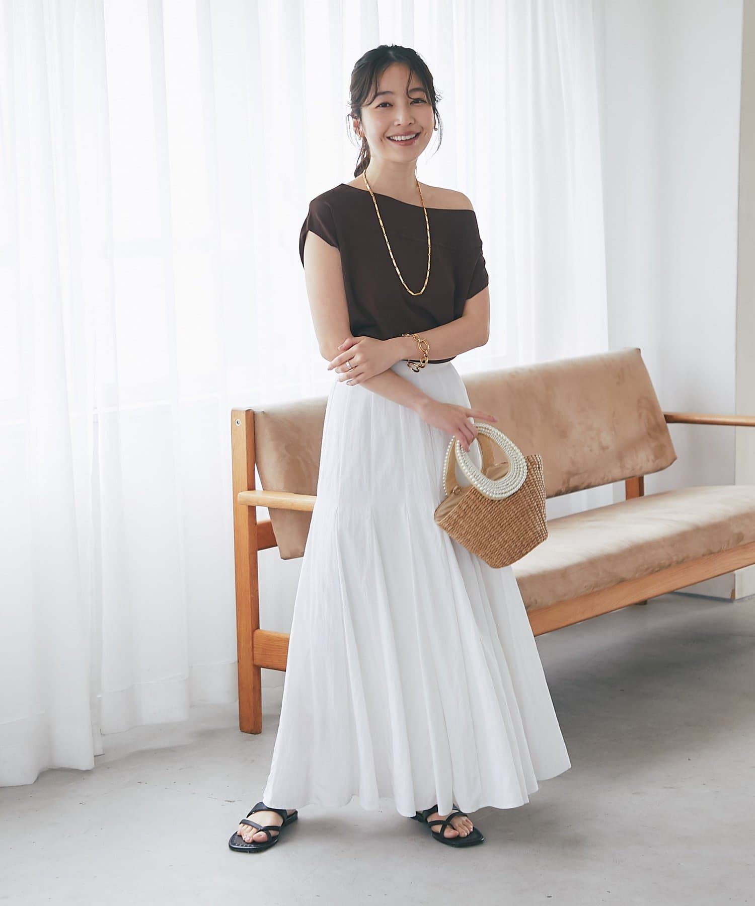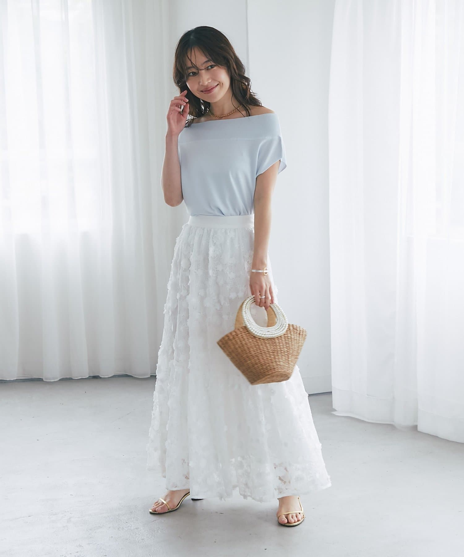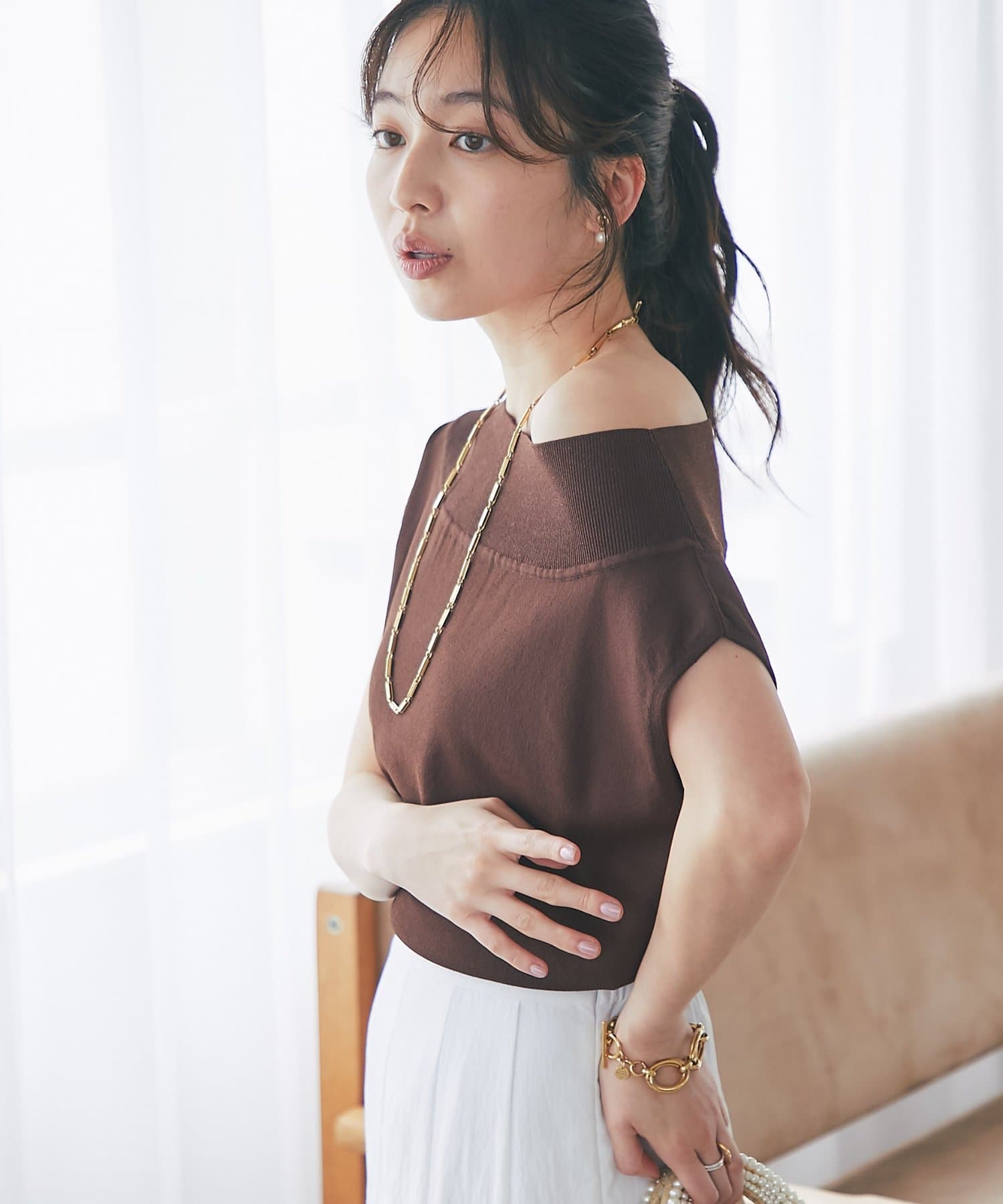 軽く肩を落とせばオフショルとしての着こなしも楽しめます。