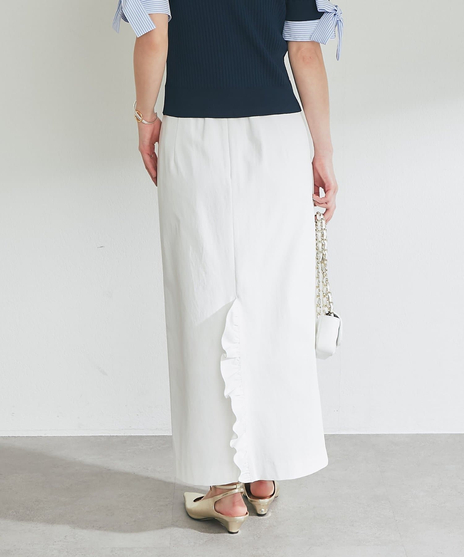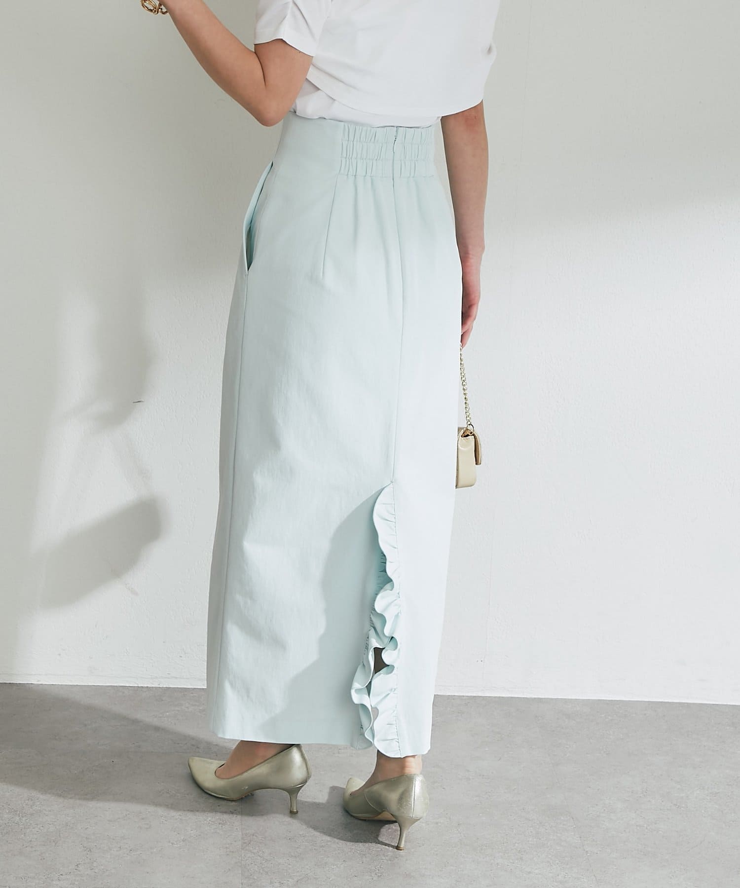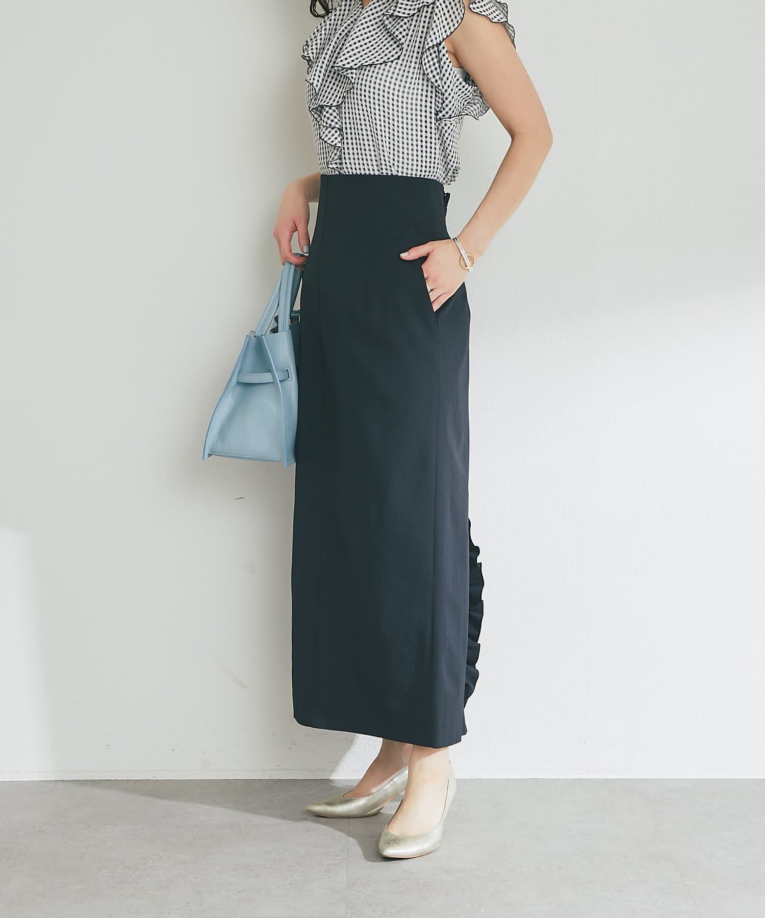 さりげなく差がつく、バックフリルが目を引くナロースカート。