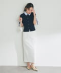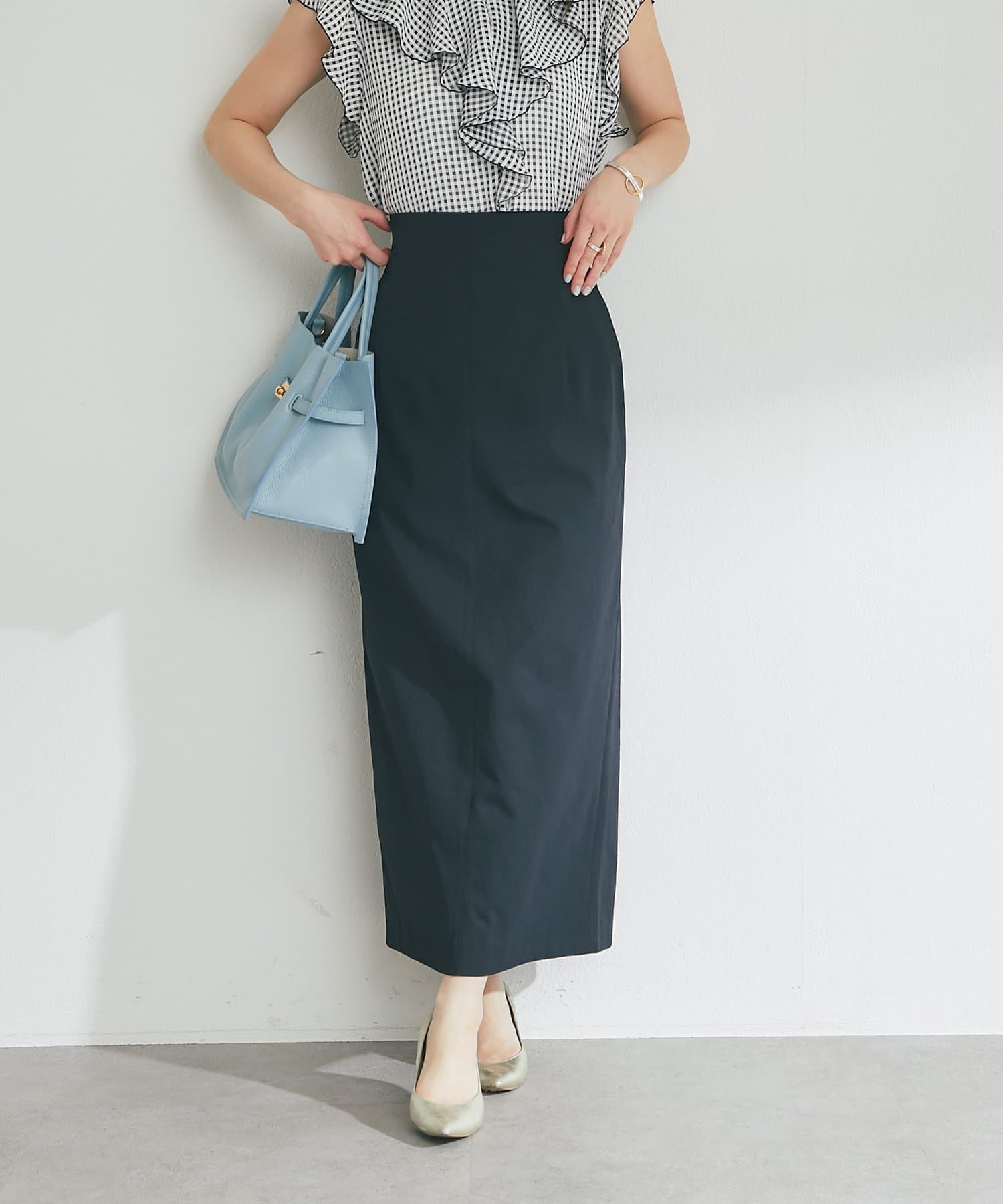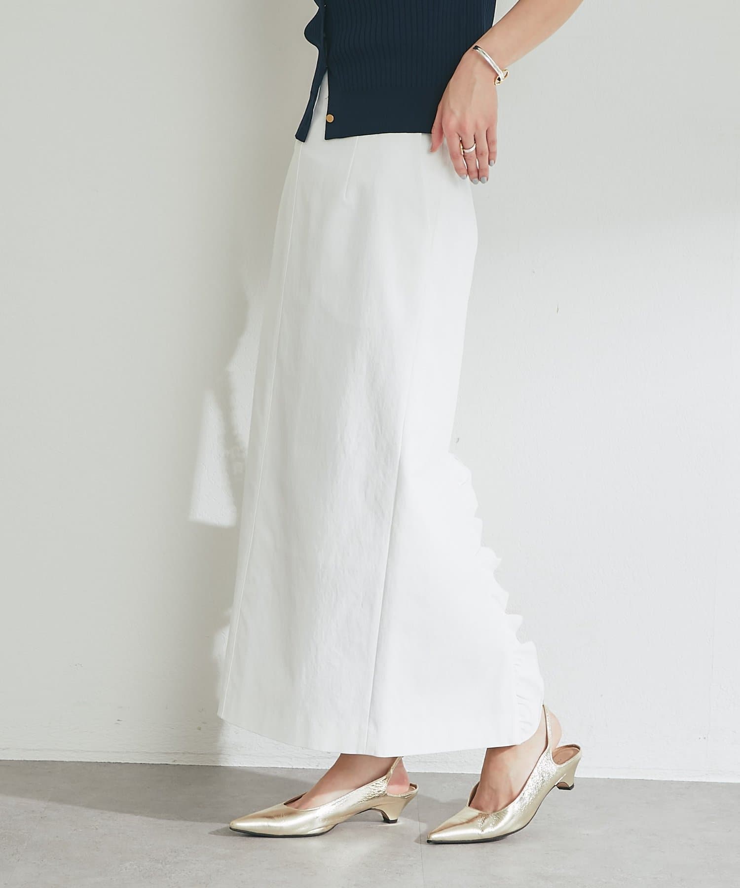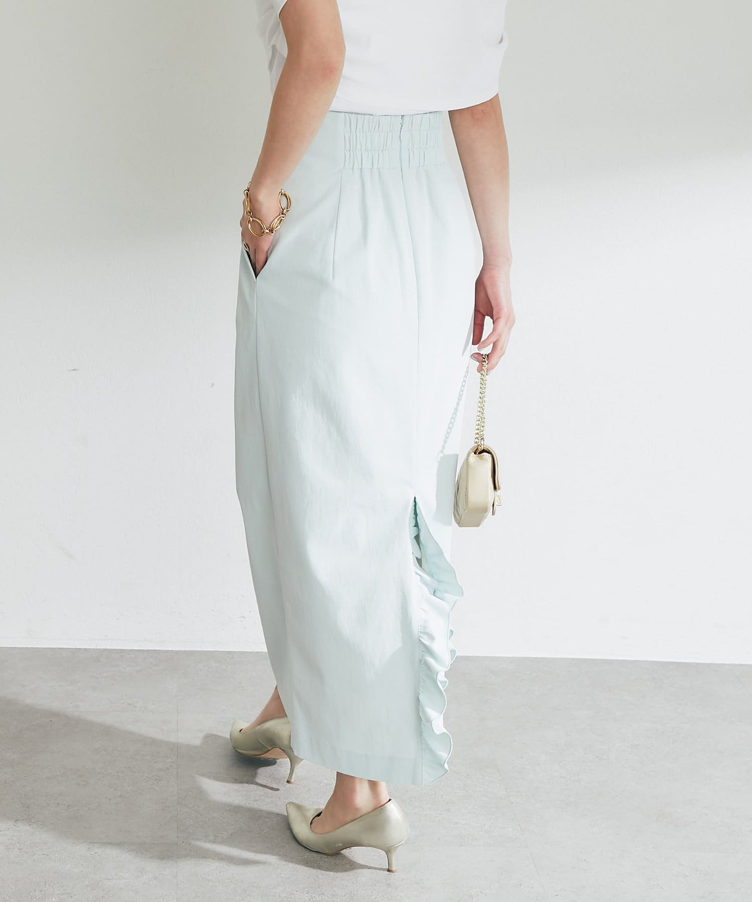 さりげなく差がつく、バックフリルが目を引くナロースカート。