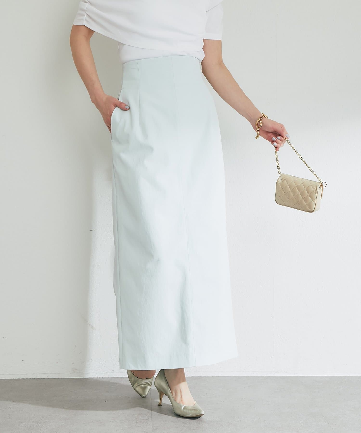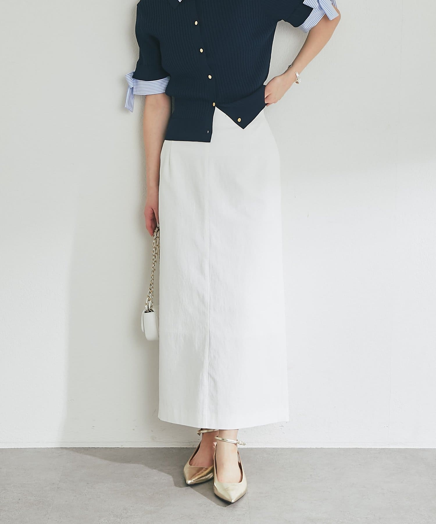 ハイウエストとマキシ丈でスタイルアップを叶えつつ、