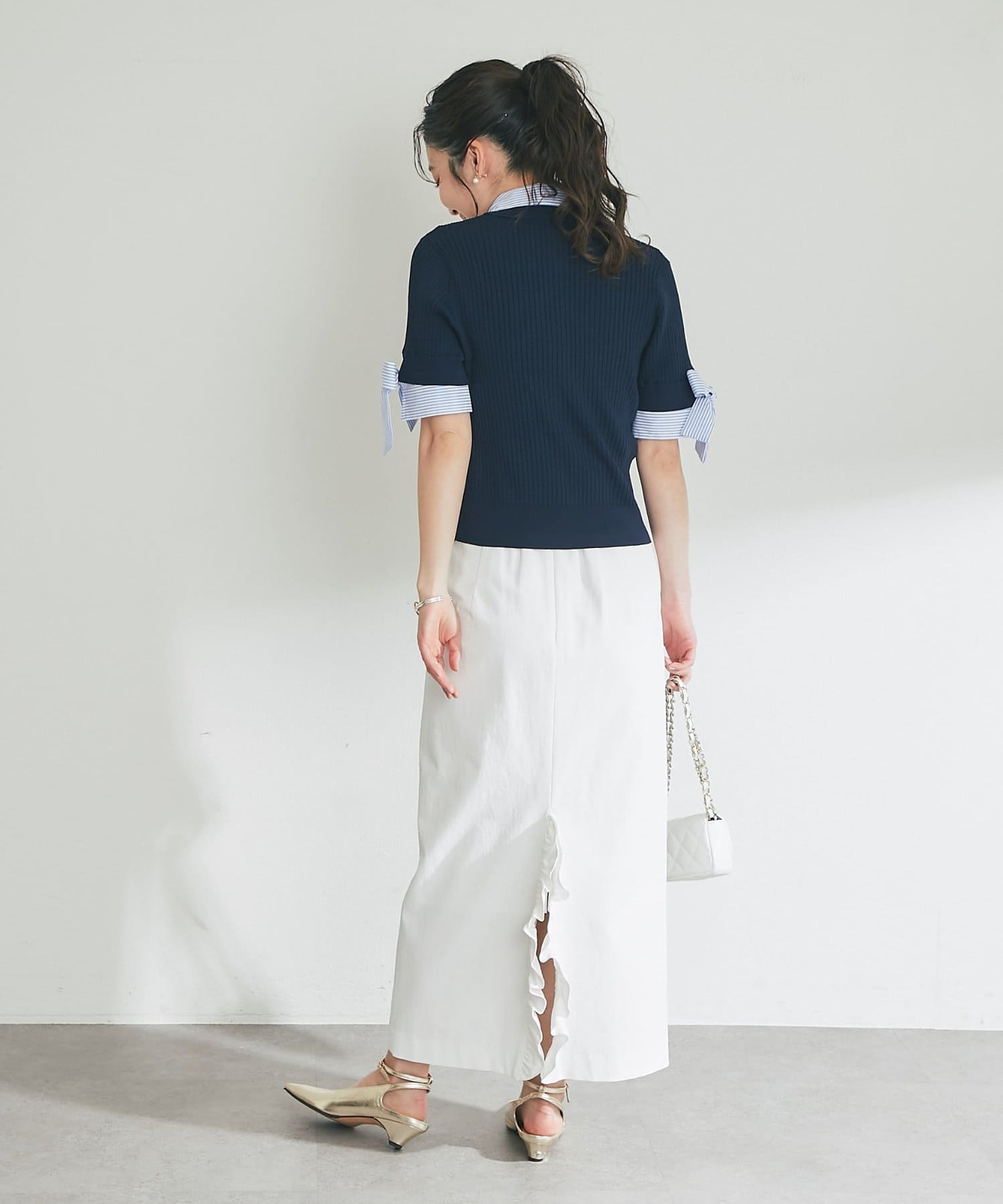 シンプルなニットやブラウスを合わせて、バックフリルを主役にした着こなしがおすすめ。