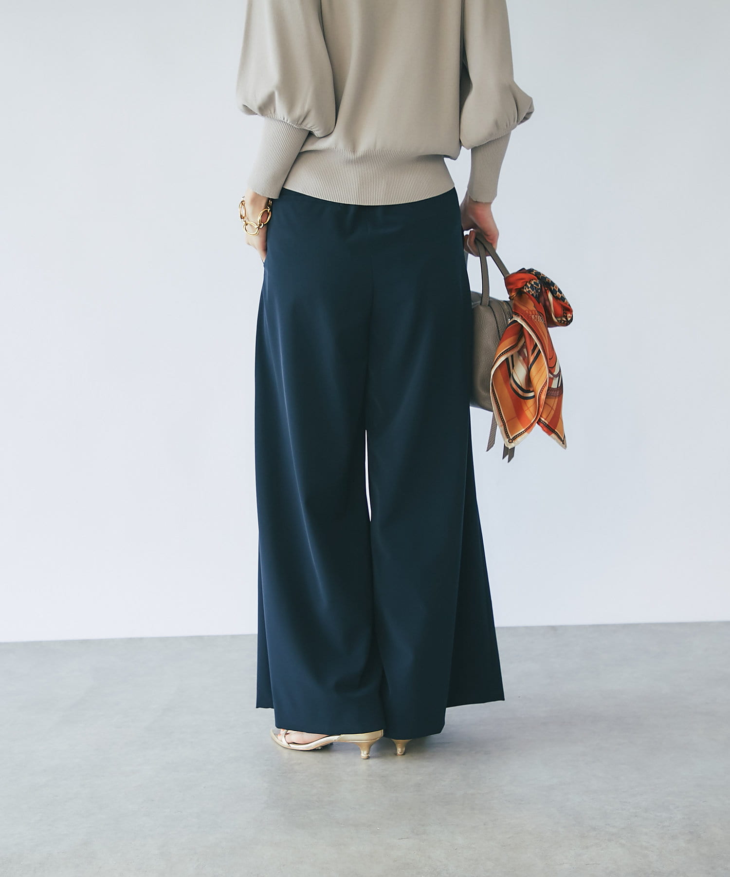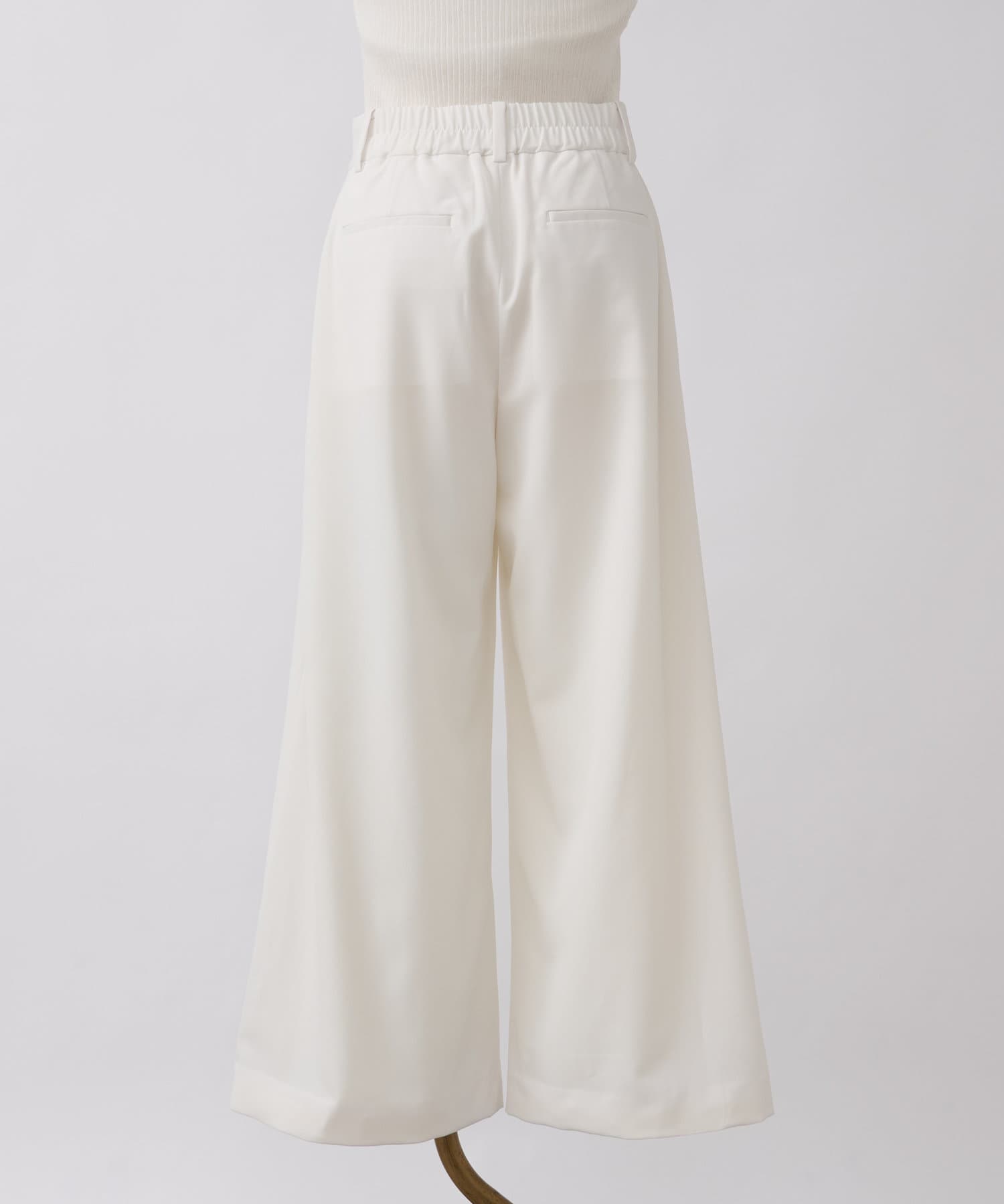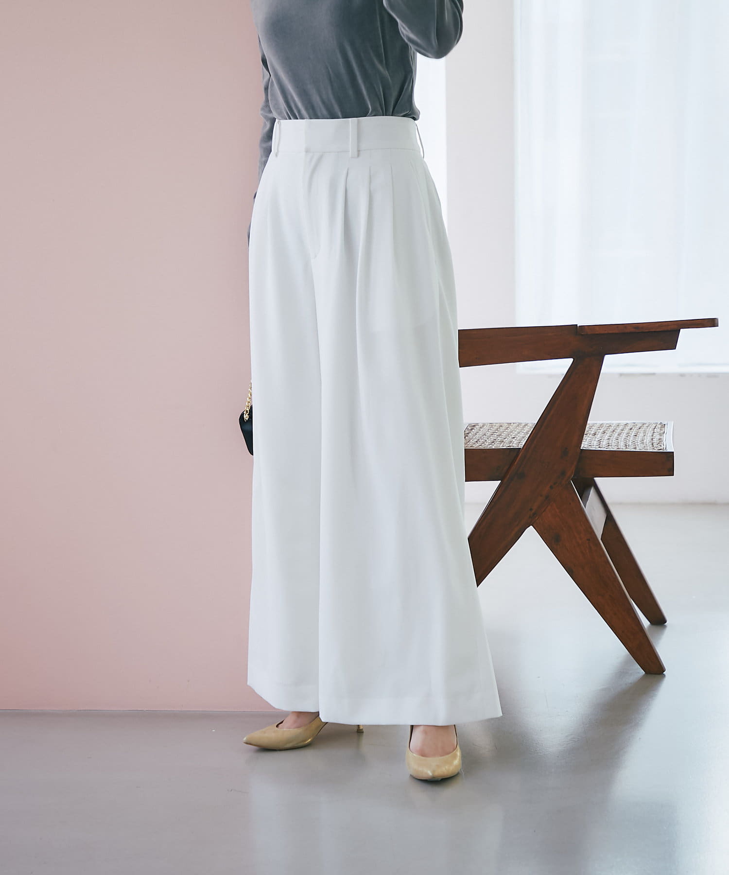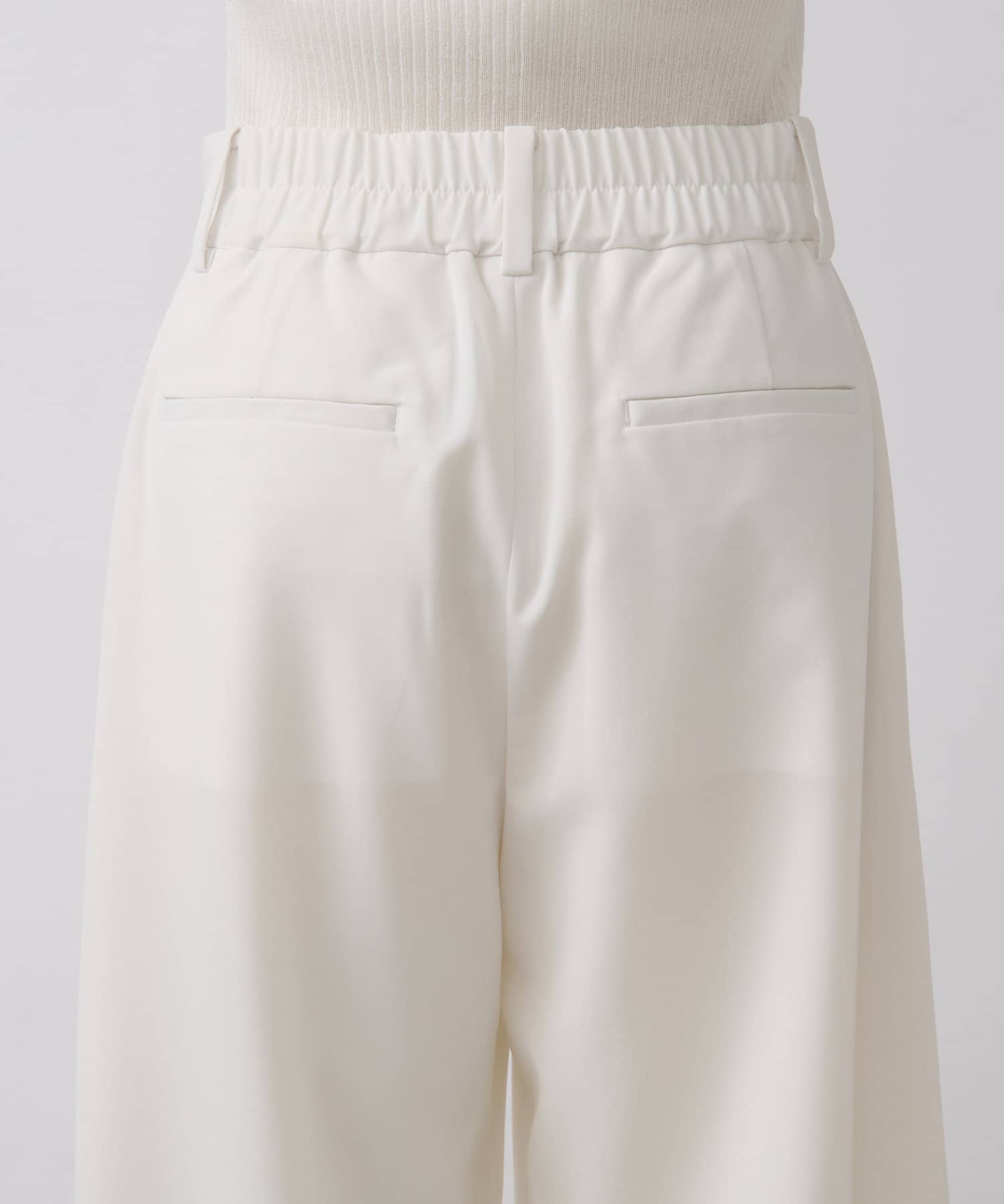 さらっとした表面感のダブルクロスに近いツイルを使用し、薄手で柔らかく落ち感のある素材感のワイドパンツ。