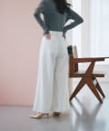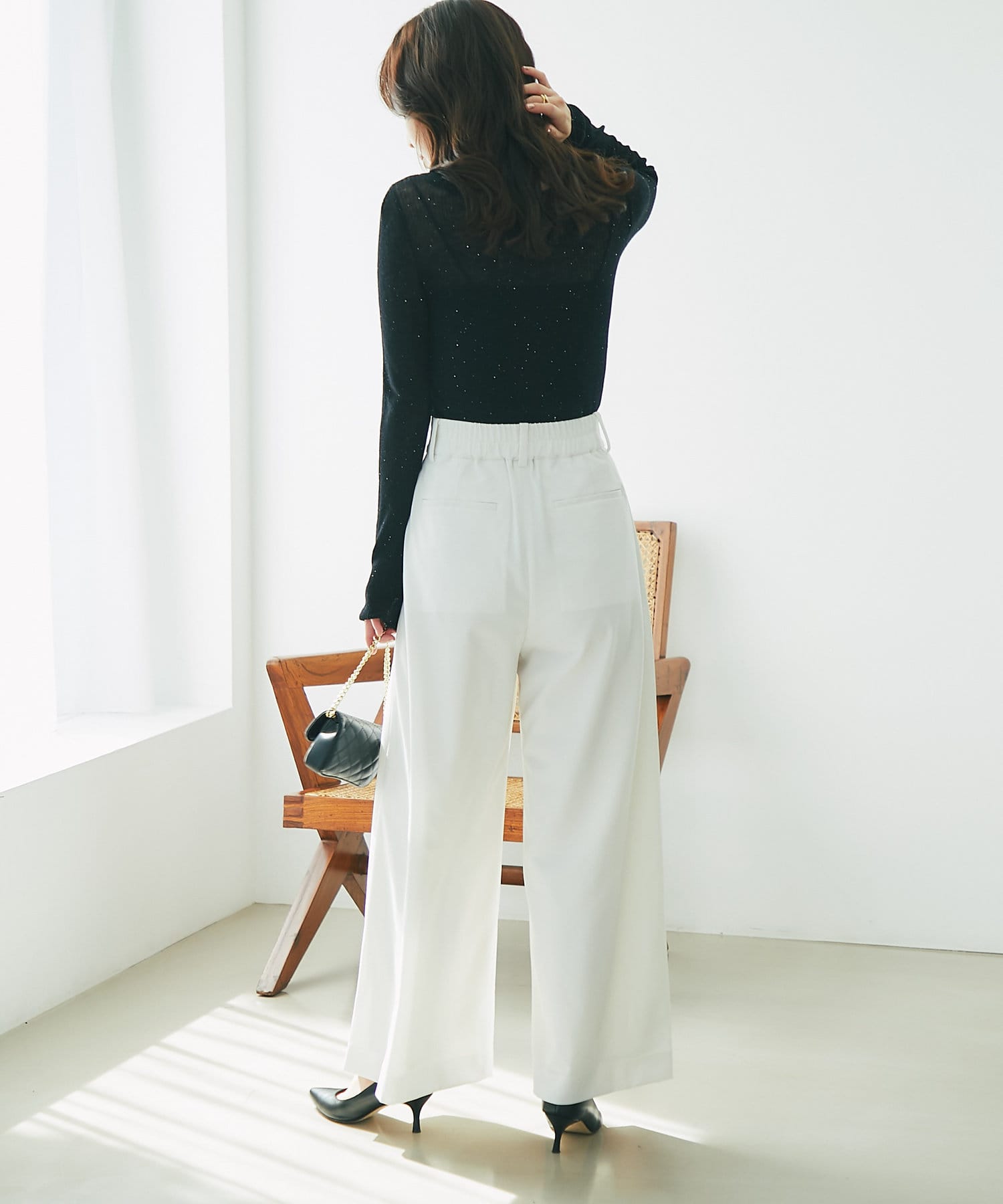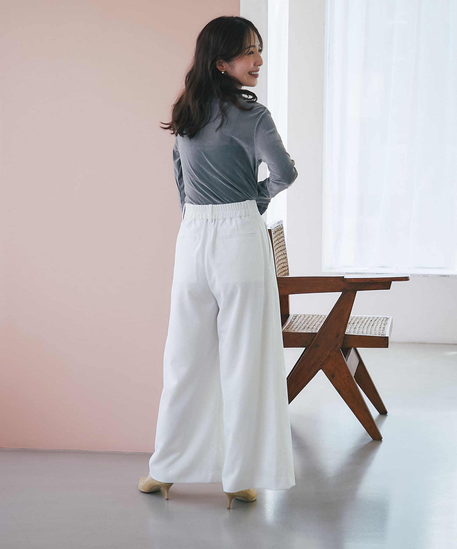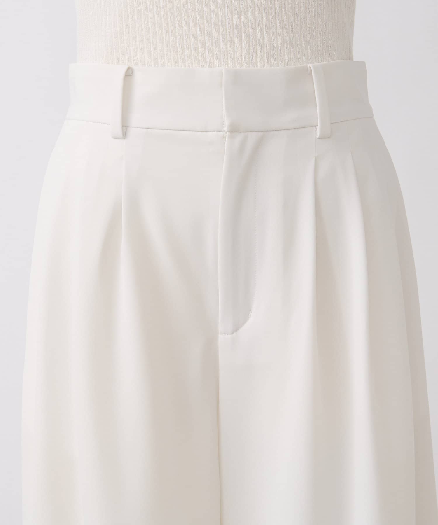 さらっとした表面感のダブルクロスに近いツイルを使用し、薄手で柔らかく落ち感のある素材感のワイドパンツ。