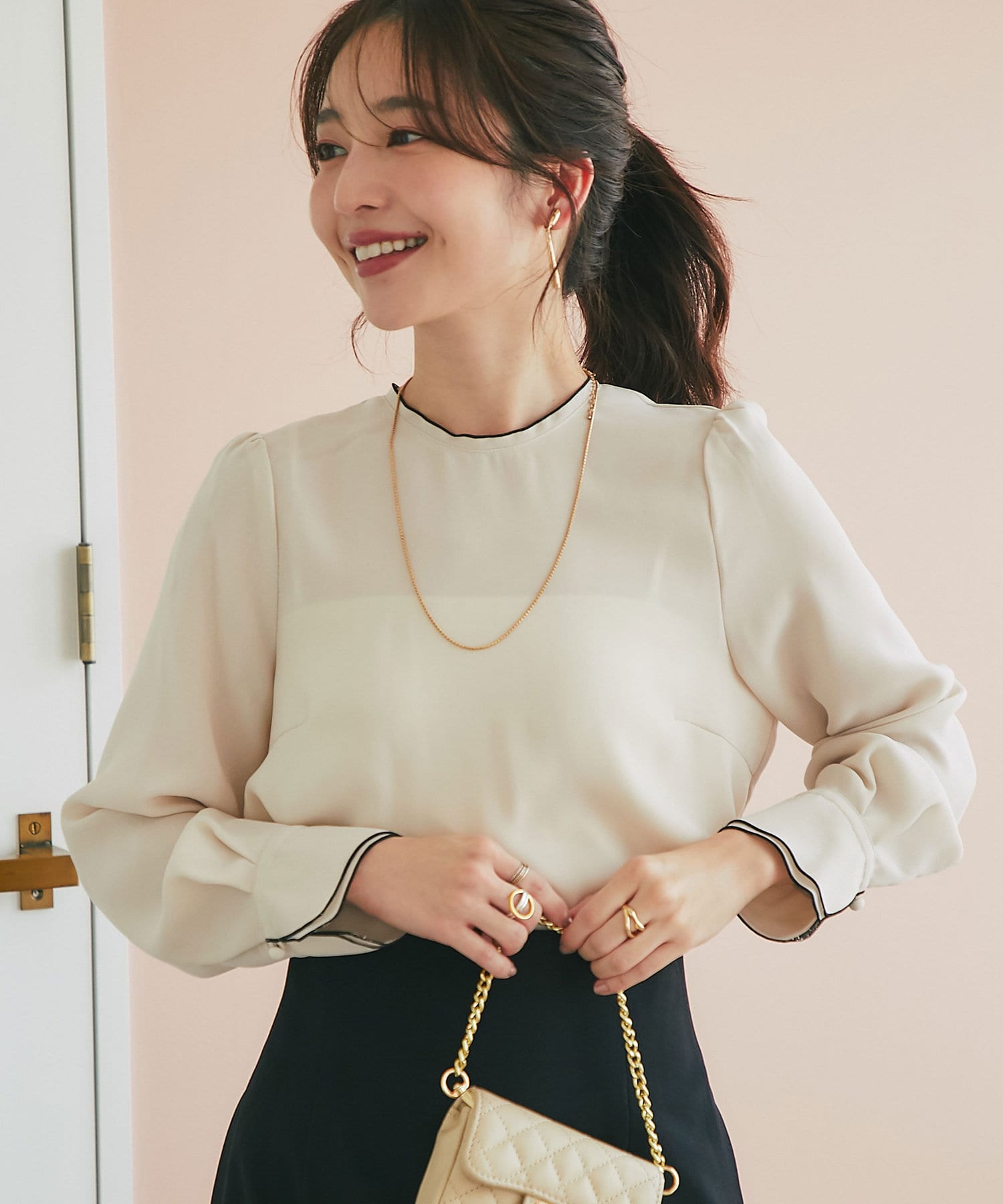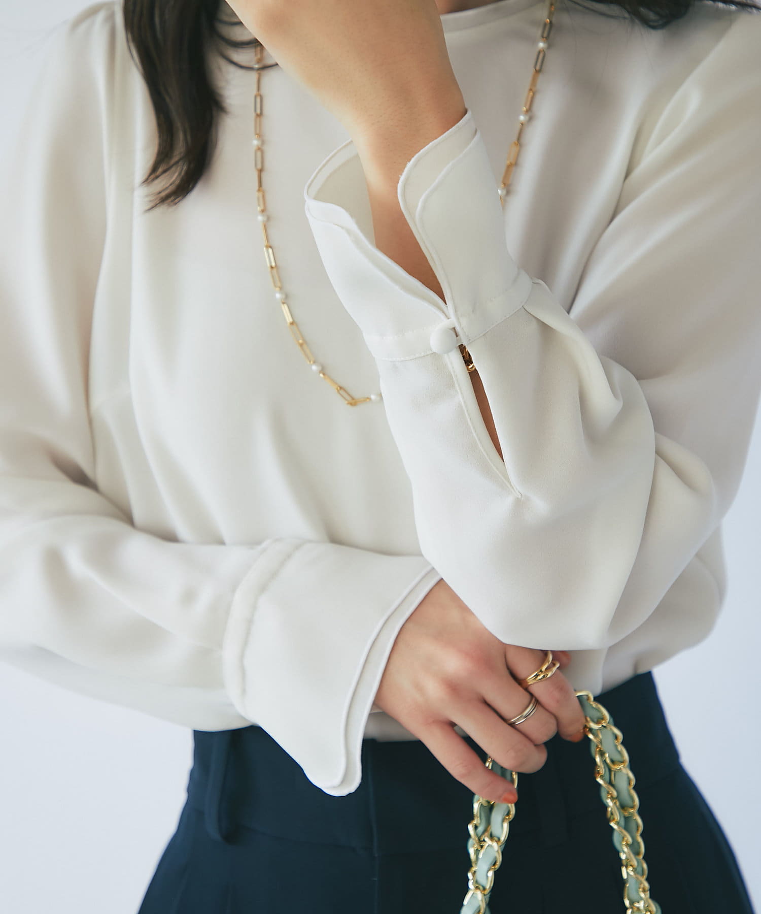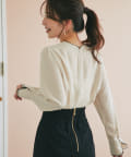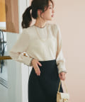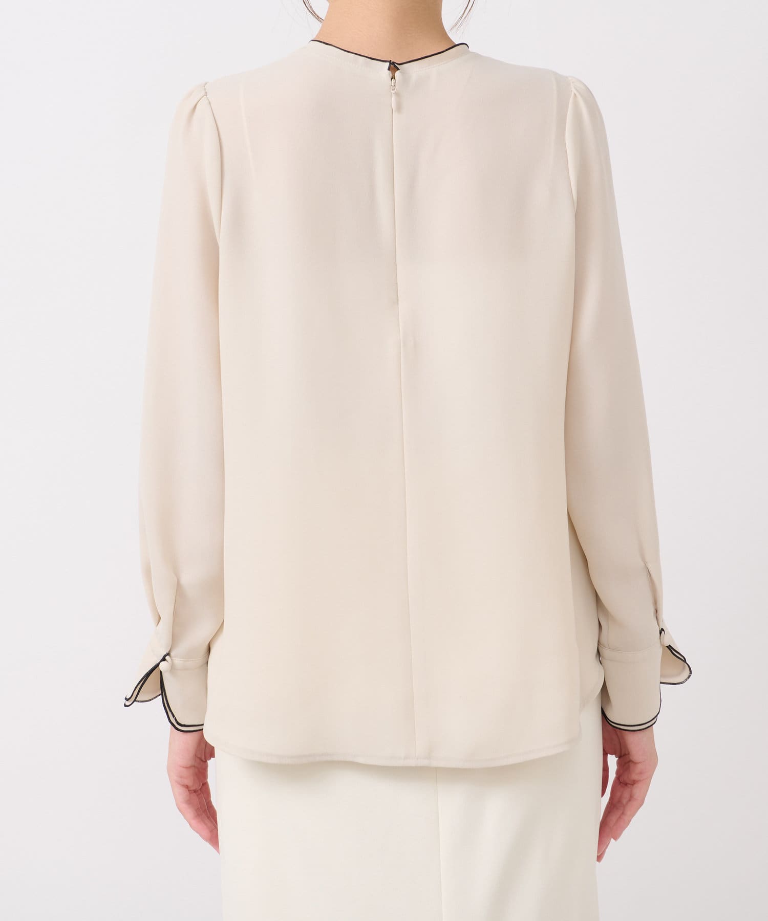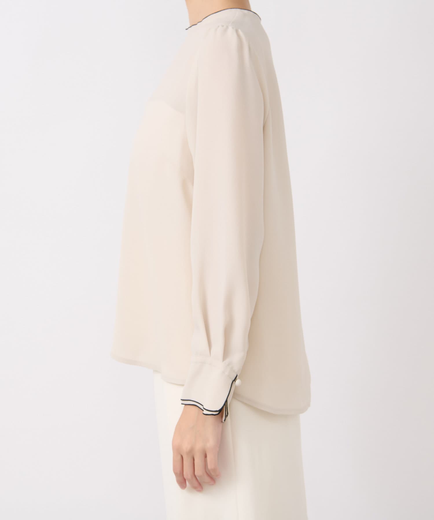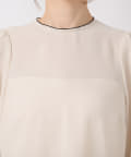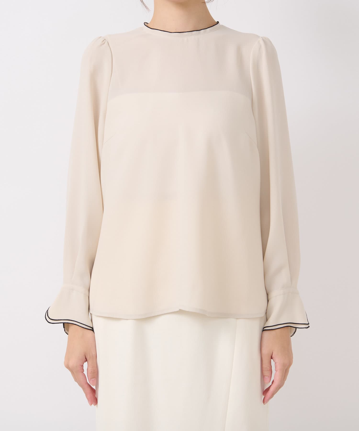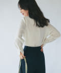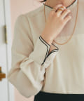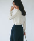 襟ぐりとカフスのメローが新鮮なデザインの上品なブラウス。