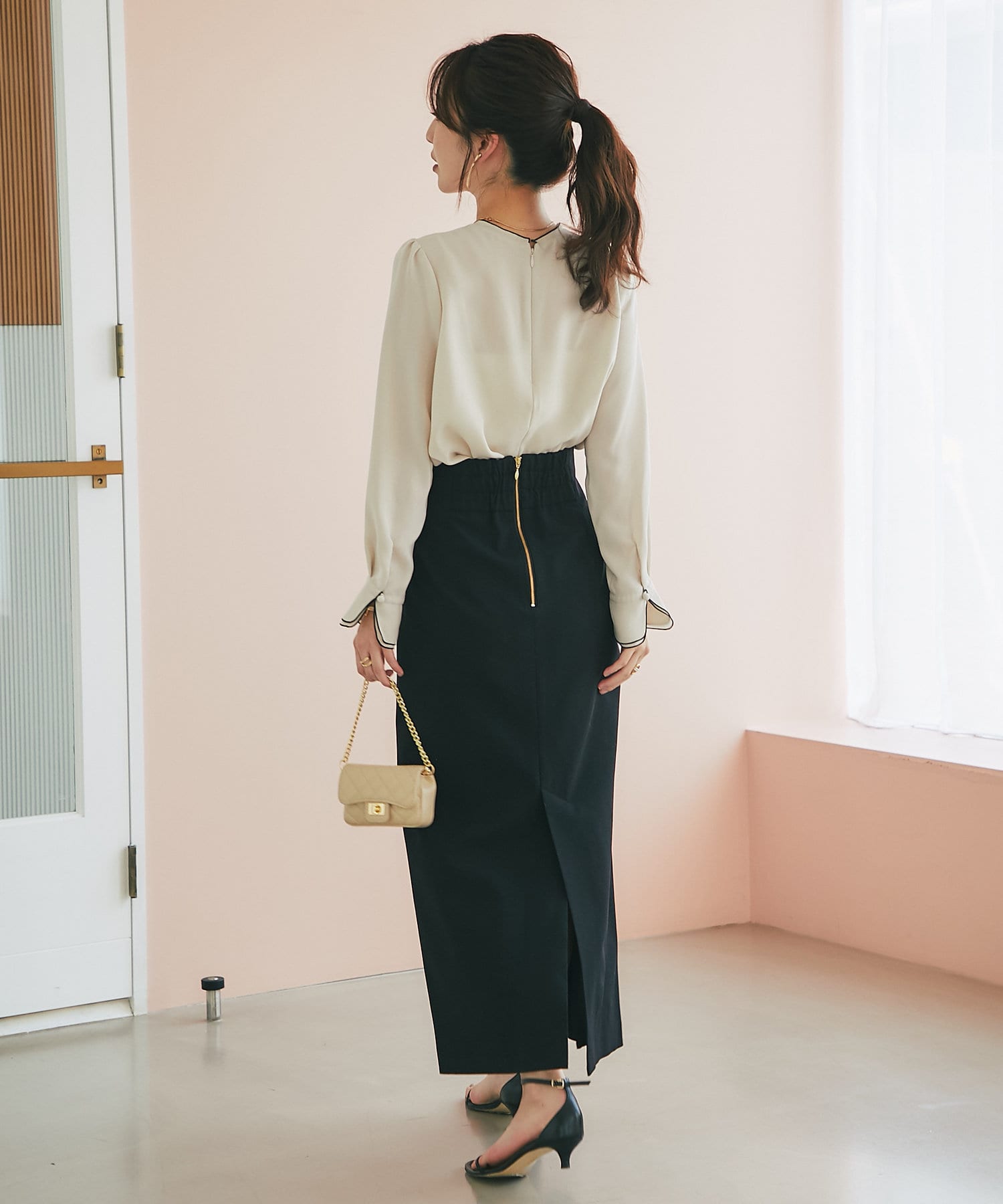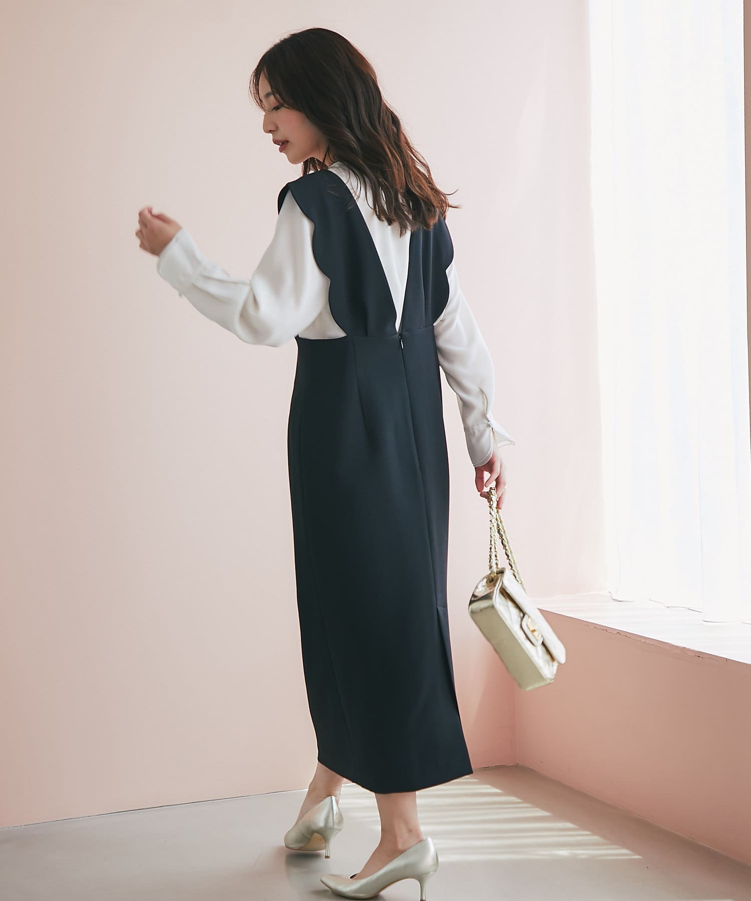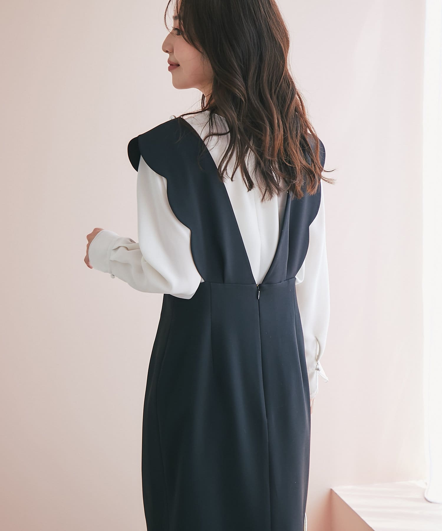 後ろファスナー開きで、お化粧も気にせず着脱ができます。