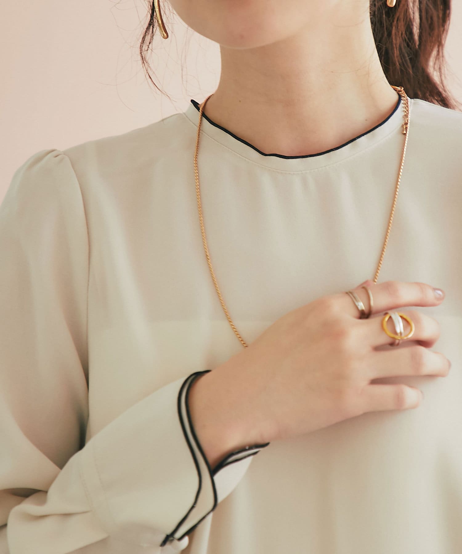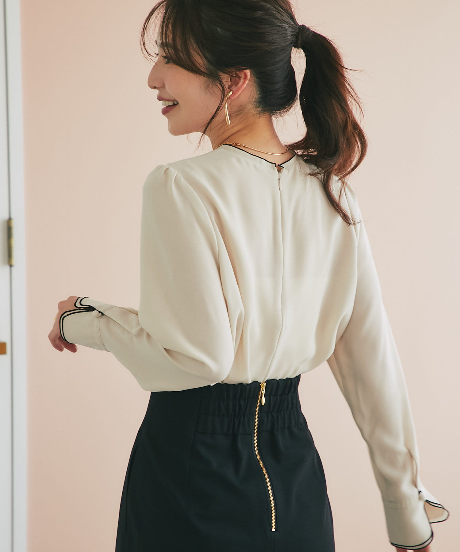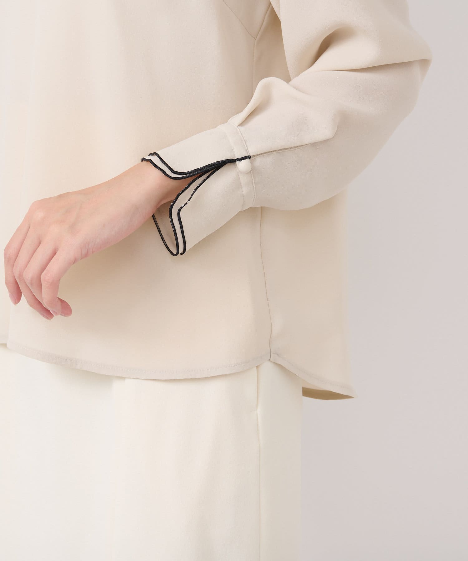 ☑襟ぐりとカフスのメローが新鮮なデザイン