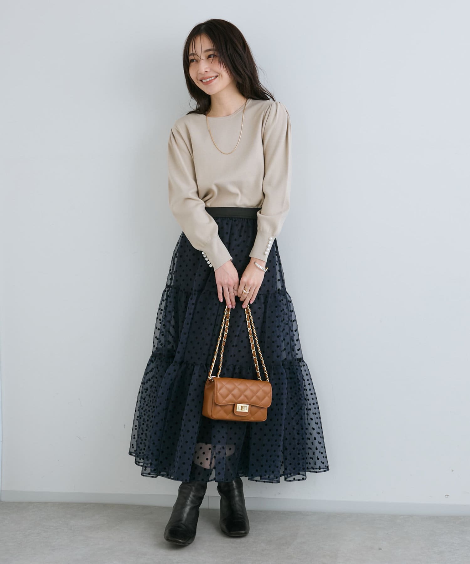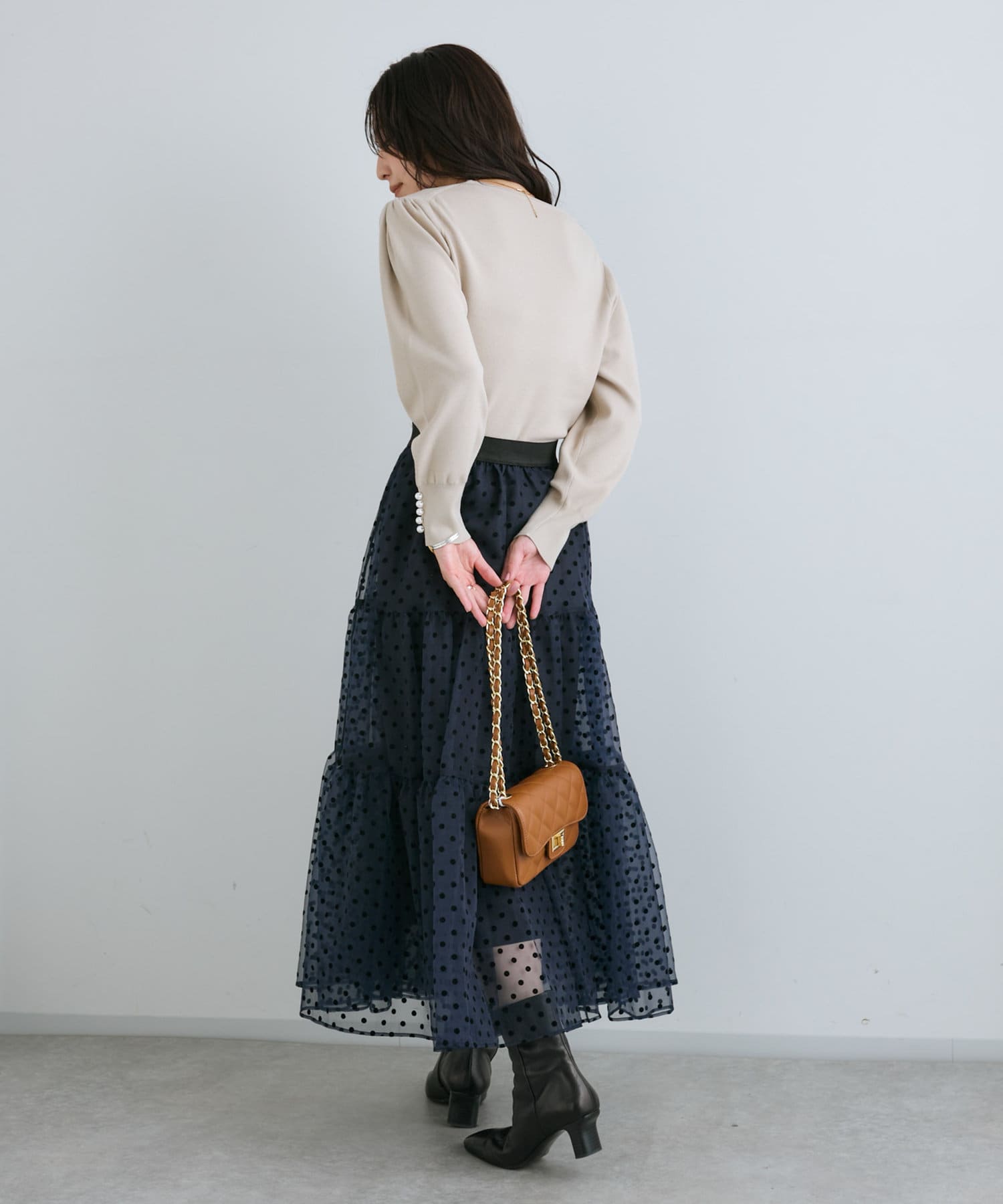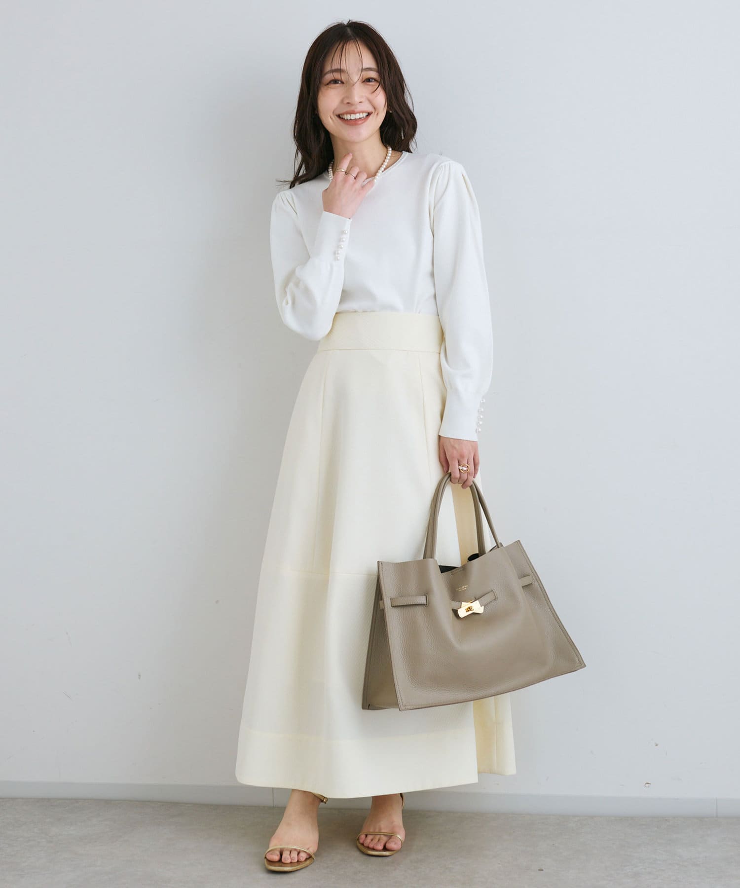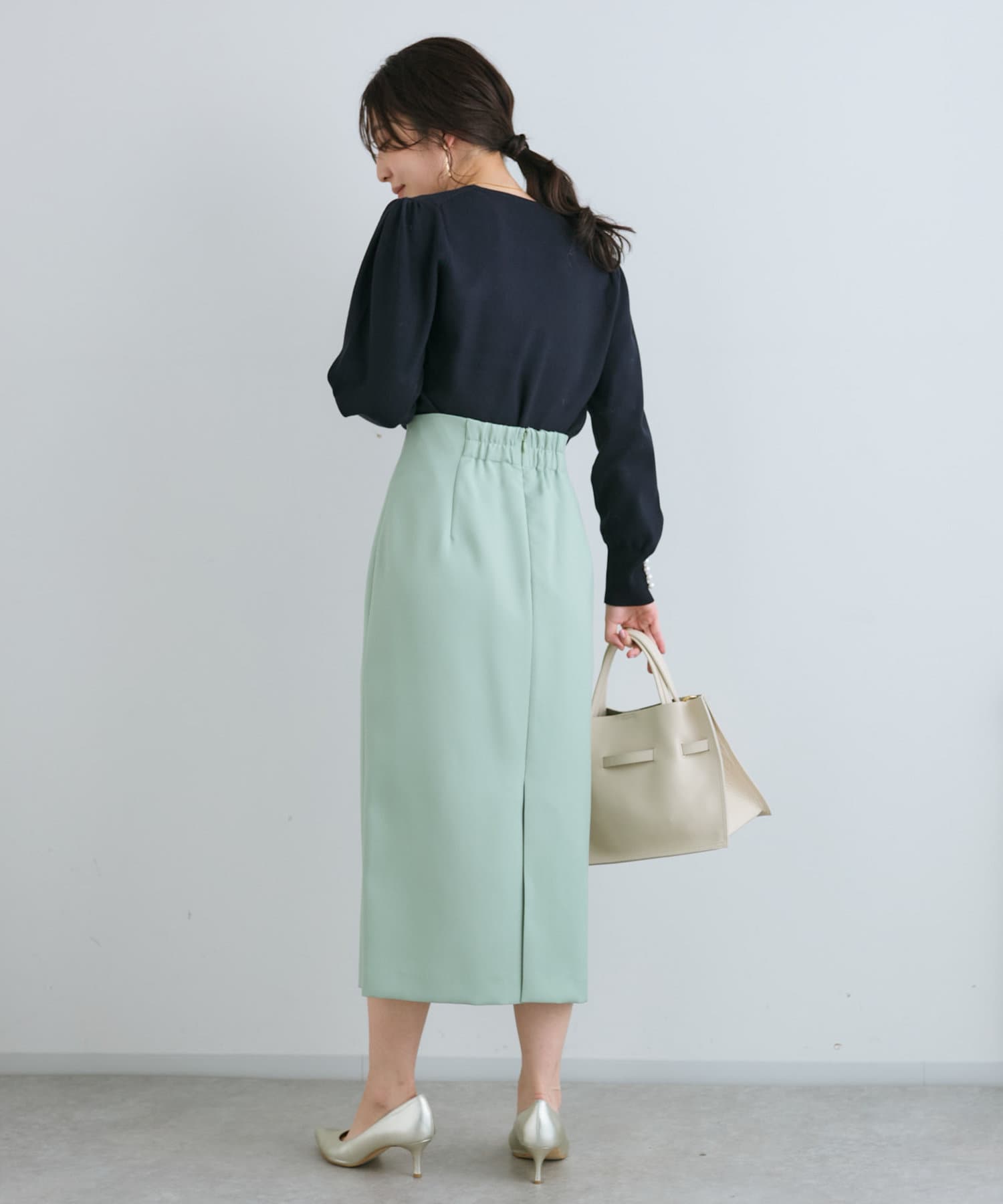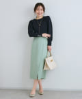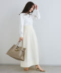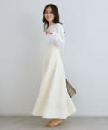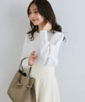身頃のコンパクトなシルエットとの対比が華奢見え効果を与えてくれます。