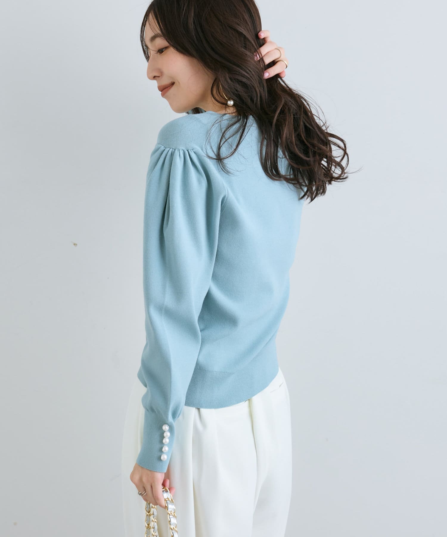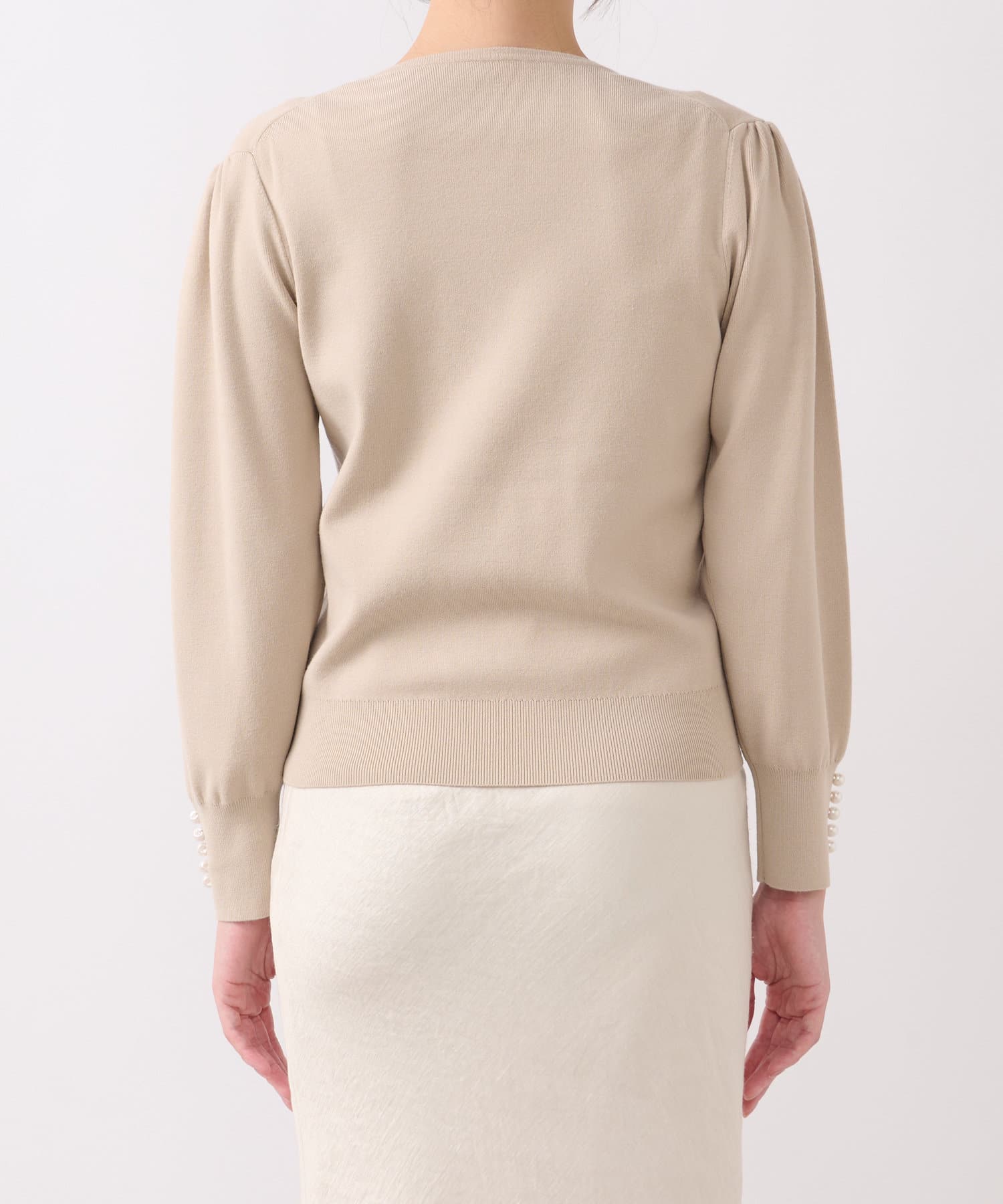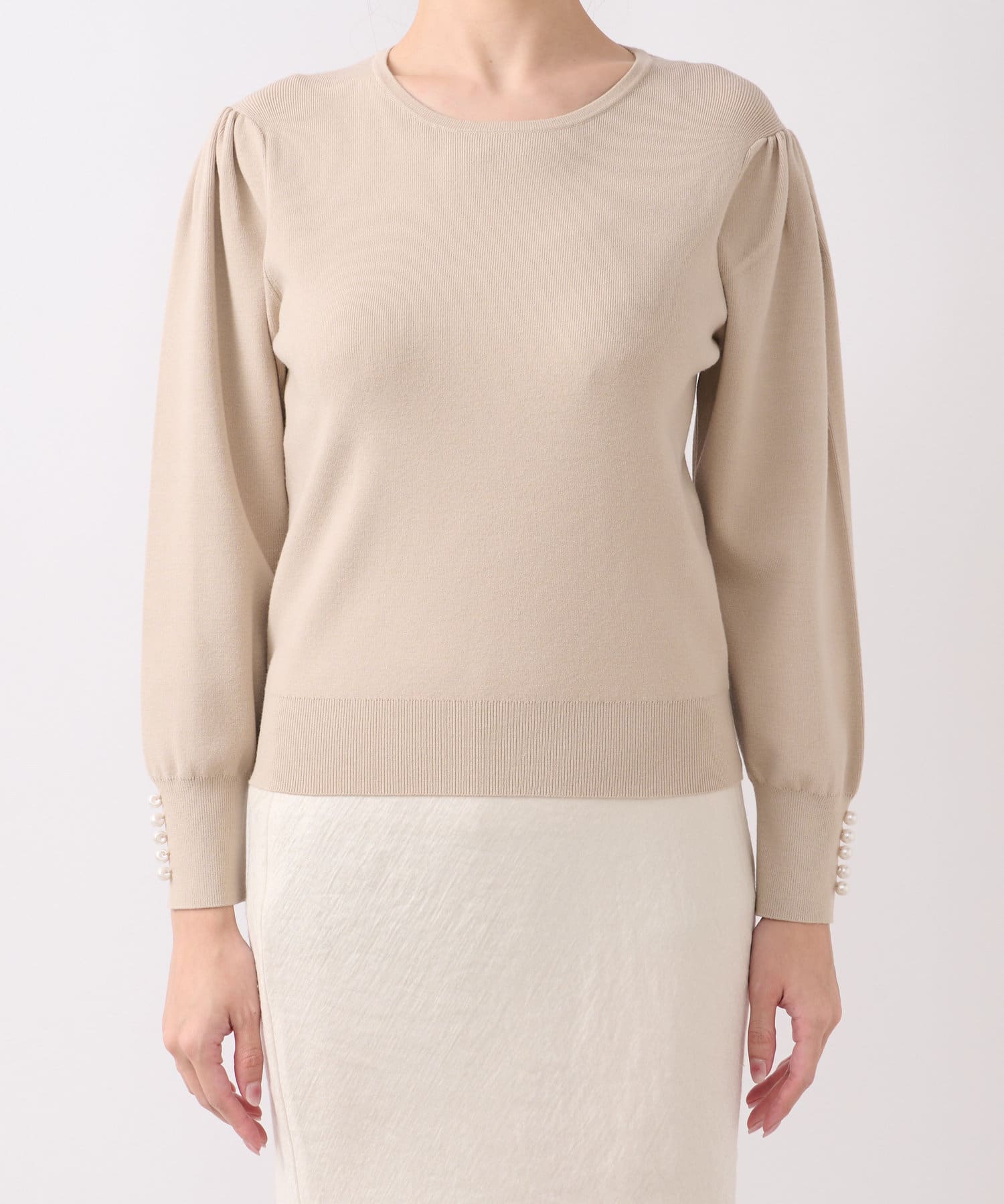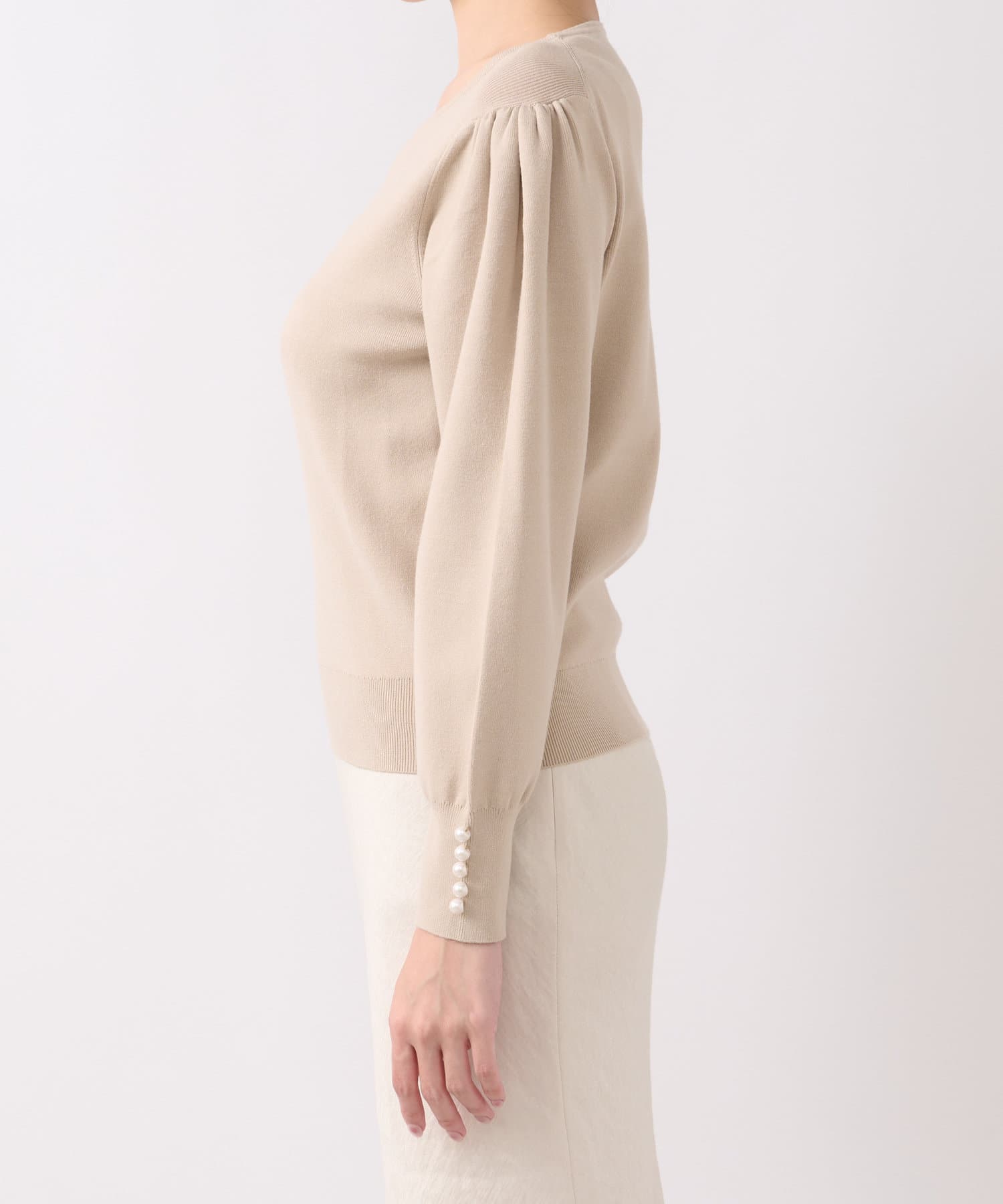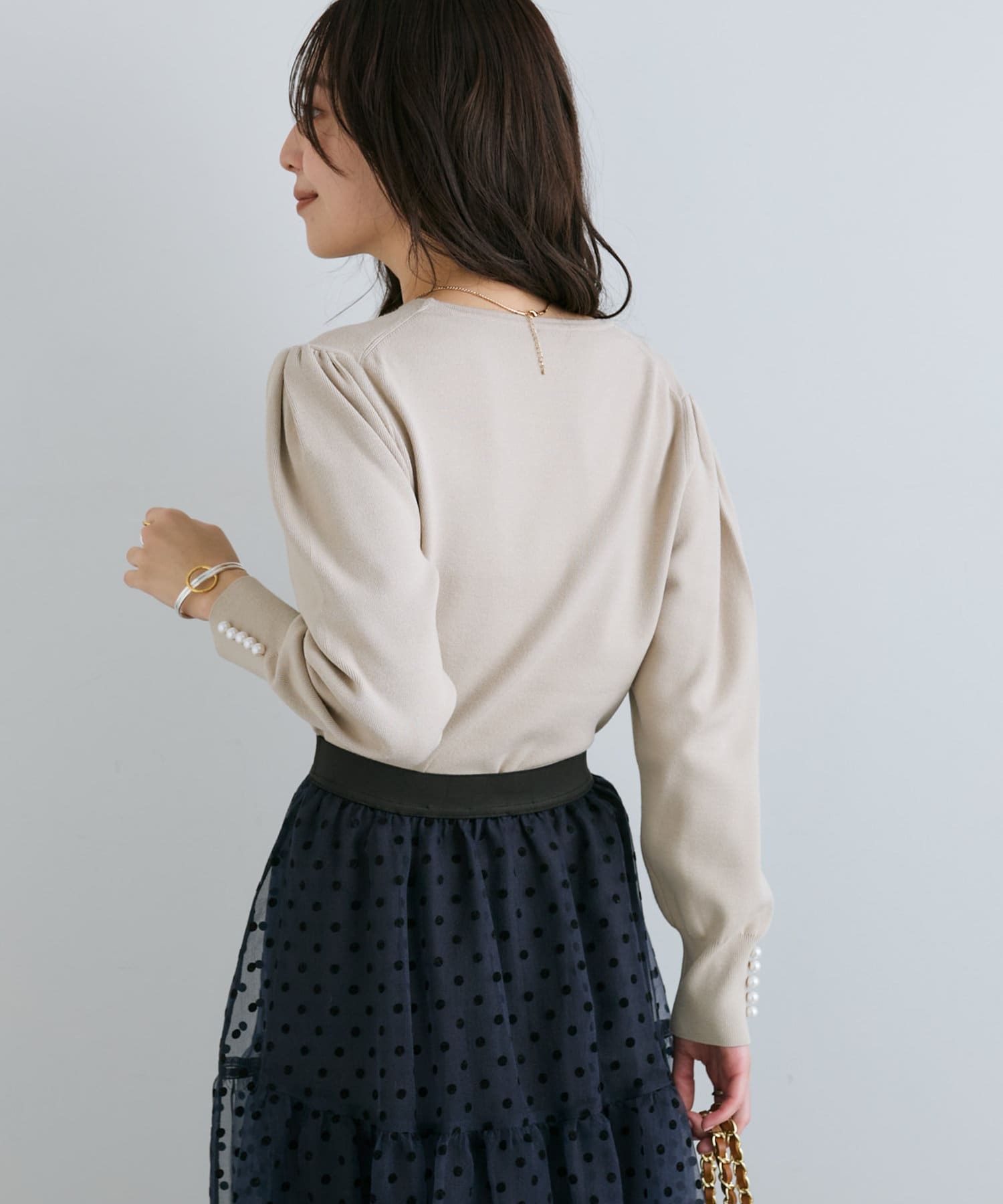 膨らんだ袖のフォルムが特徴。袖口のパールもさりげなくポイントになっています。