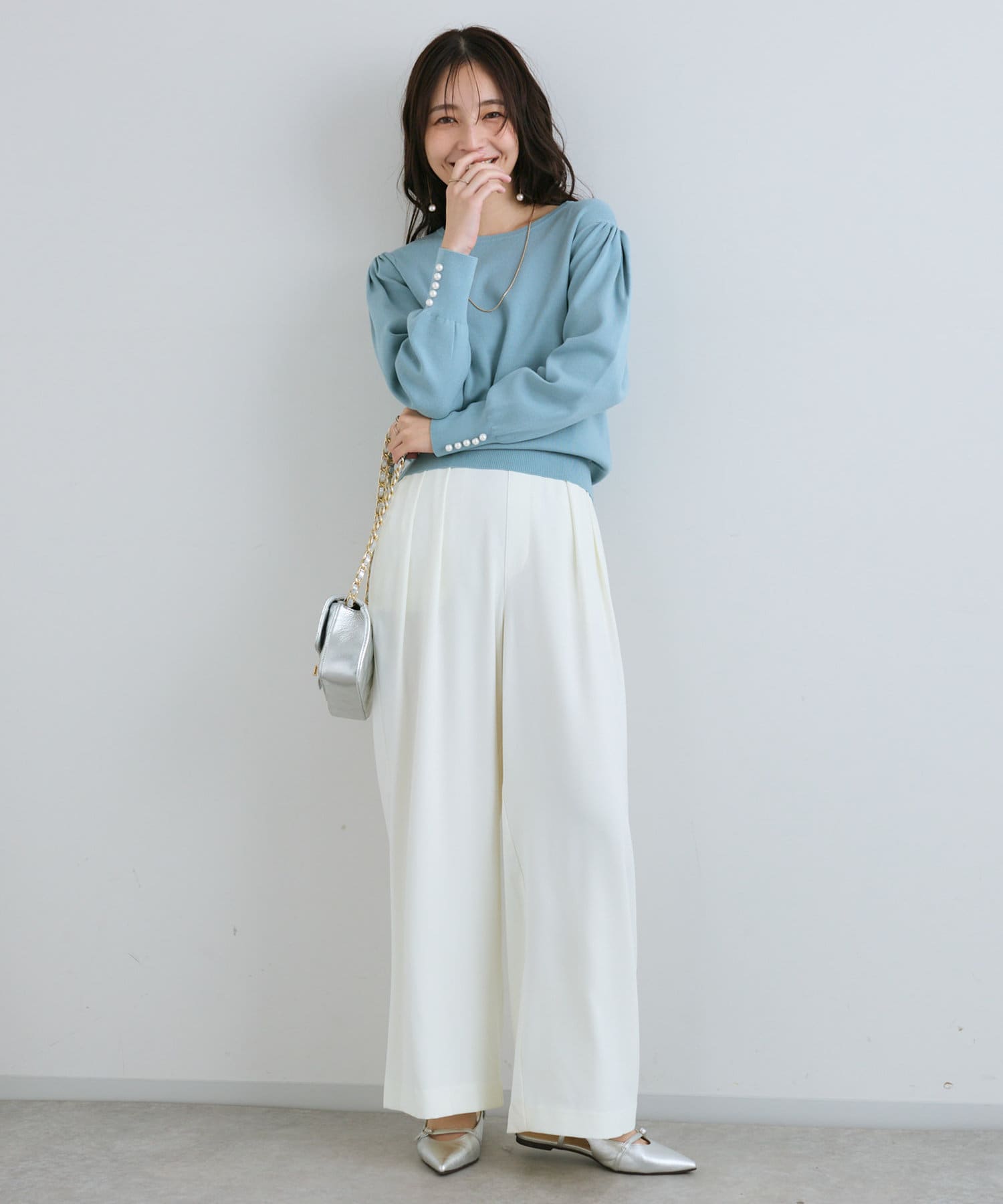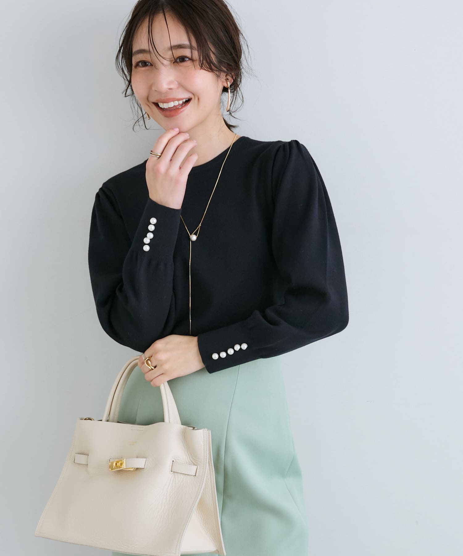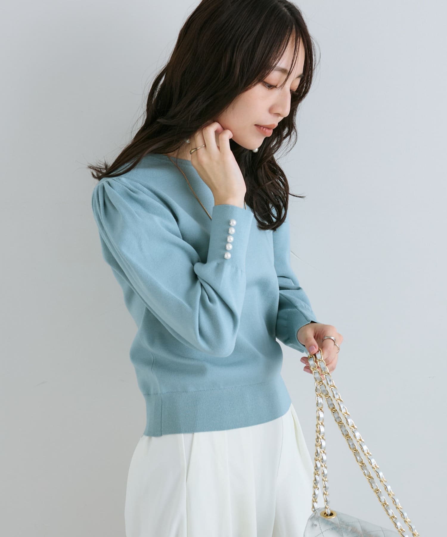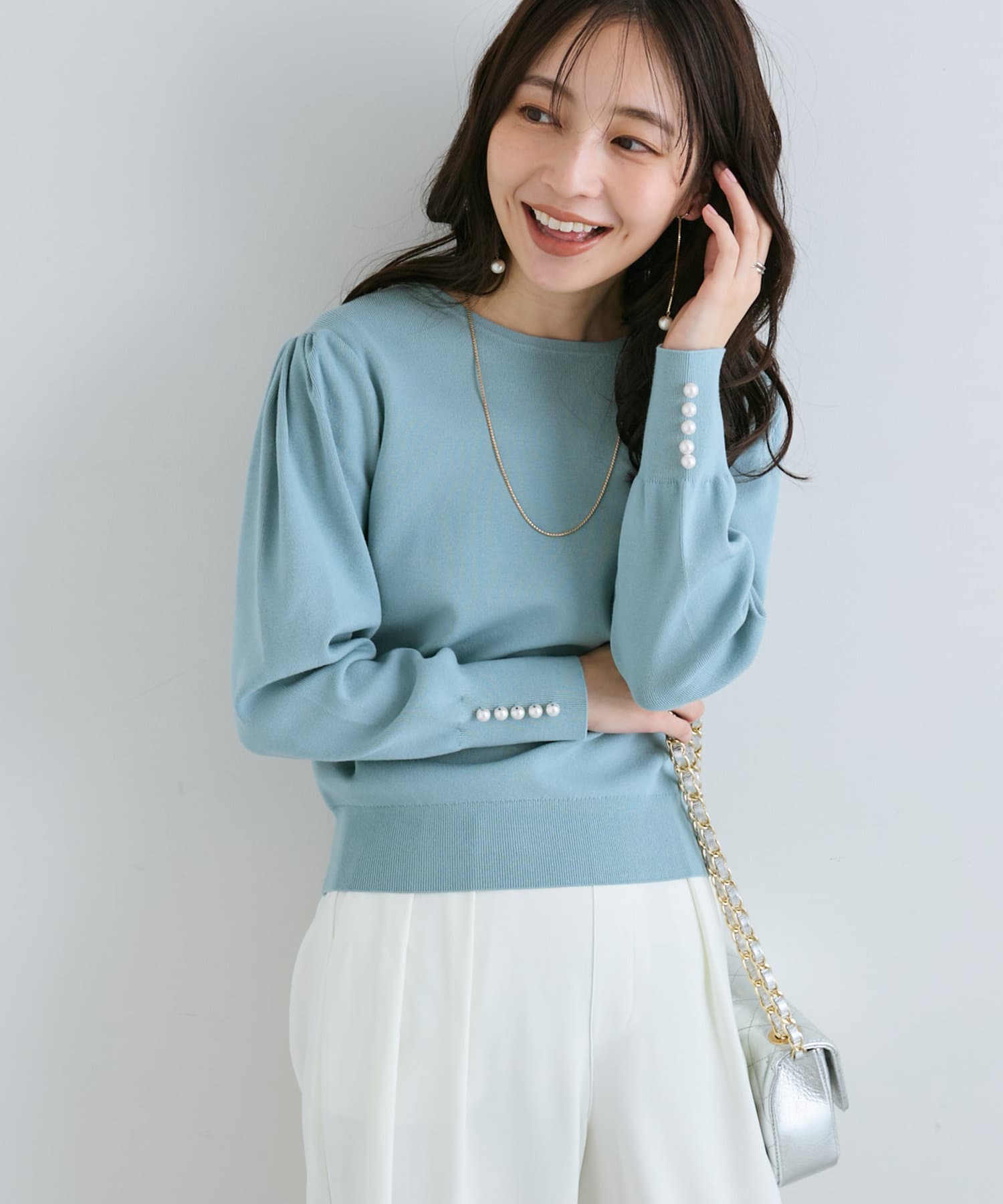 膨らんだ袖のフォルムが特徴。袖口のパールもさりげなくポイントになっています。