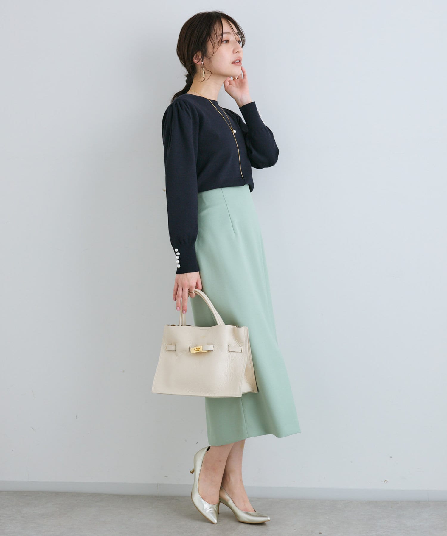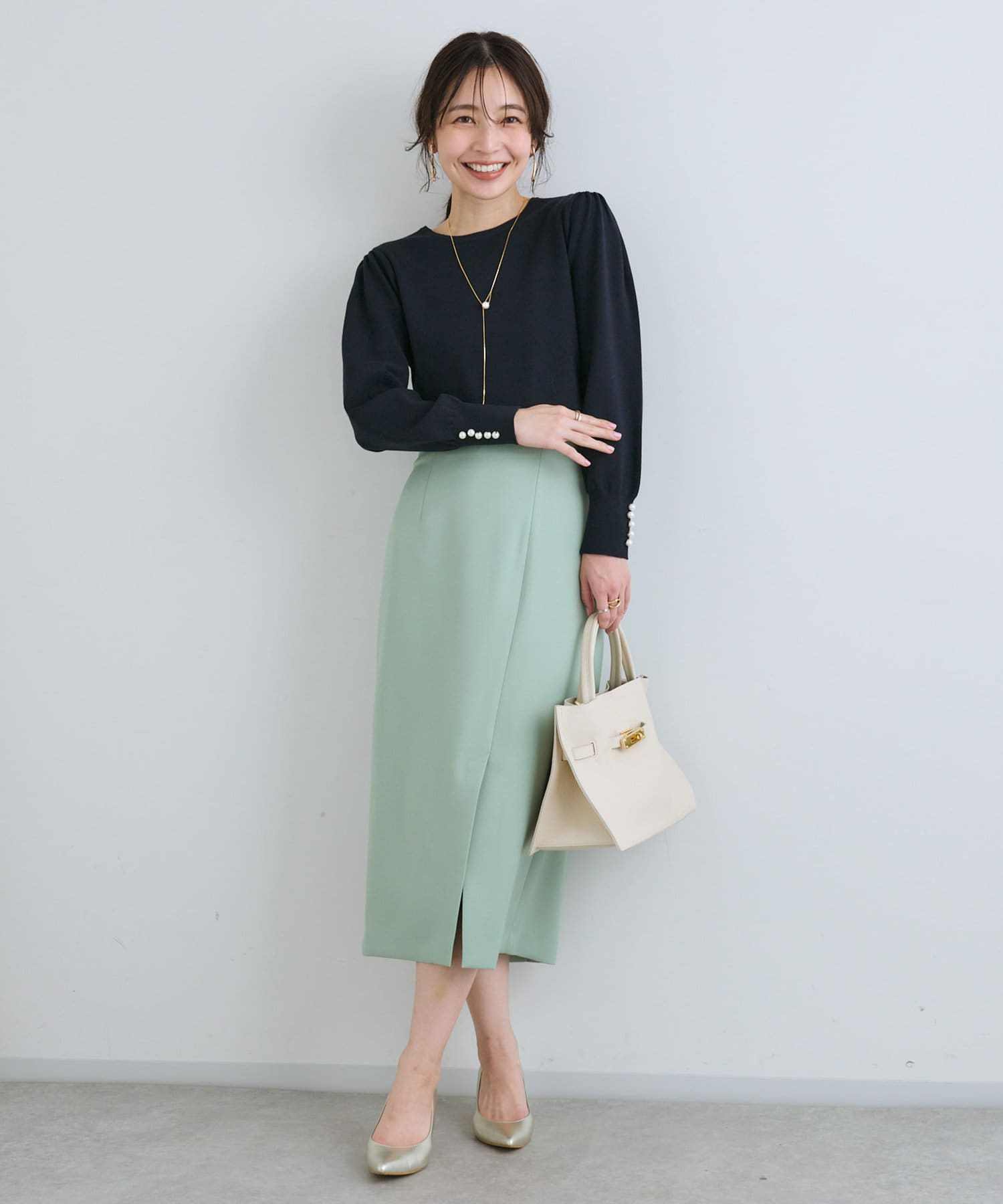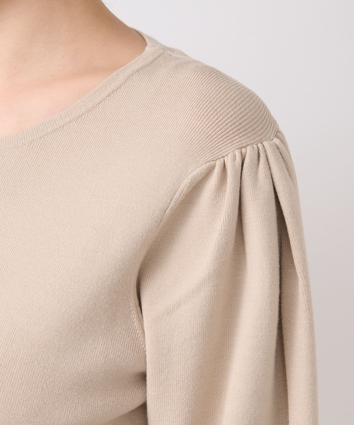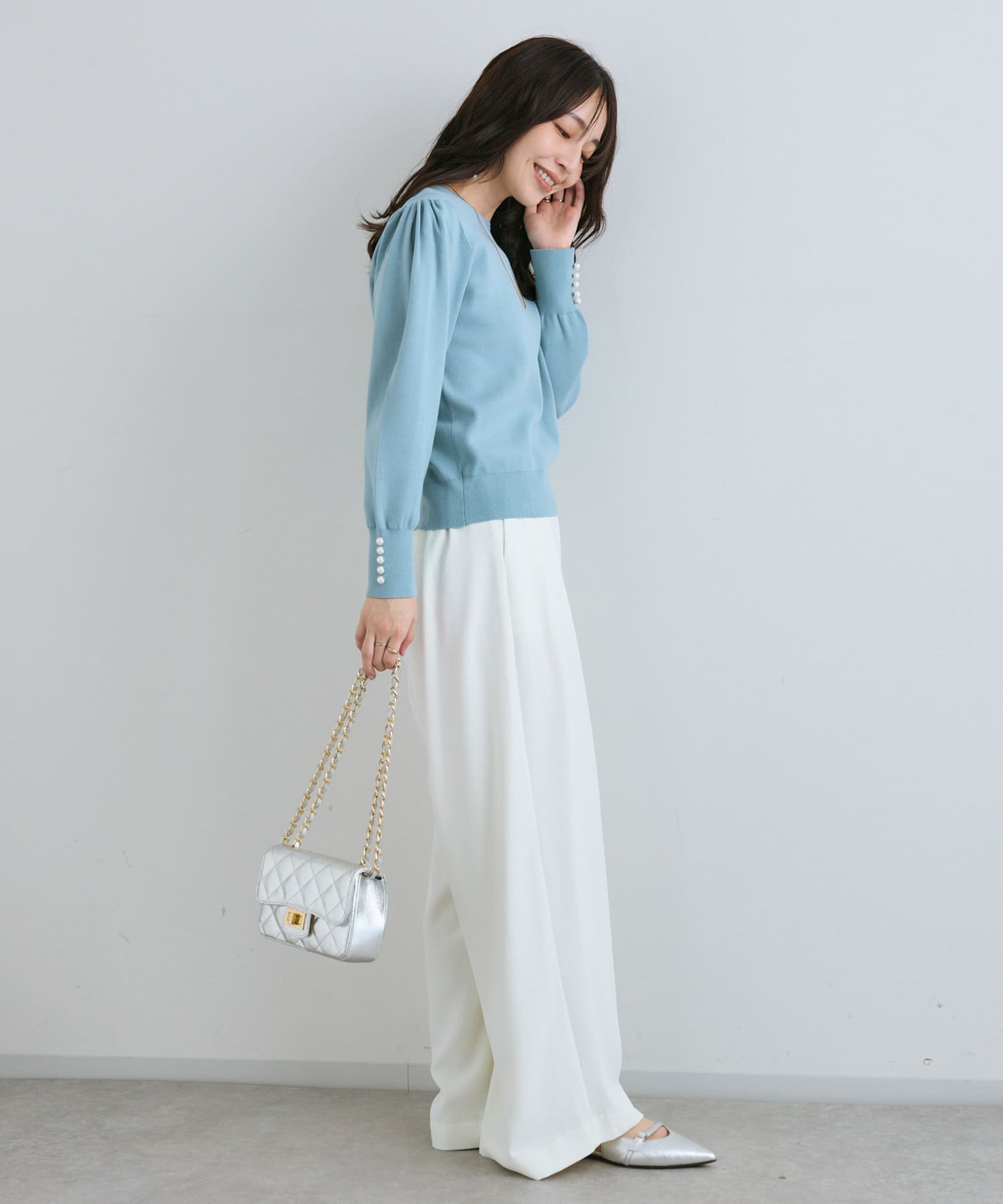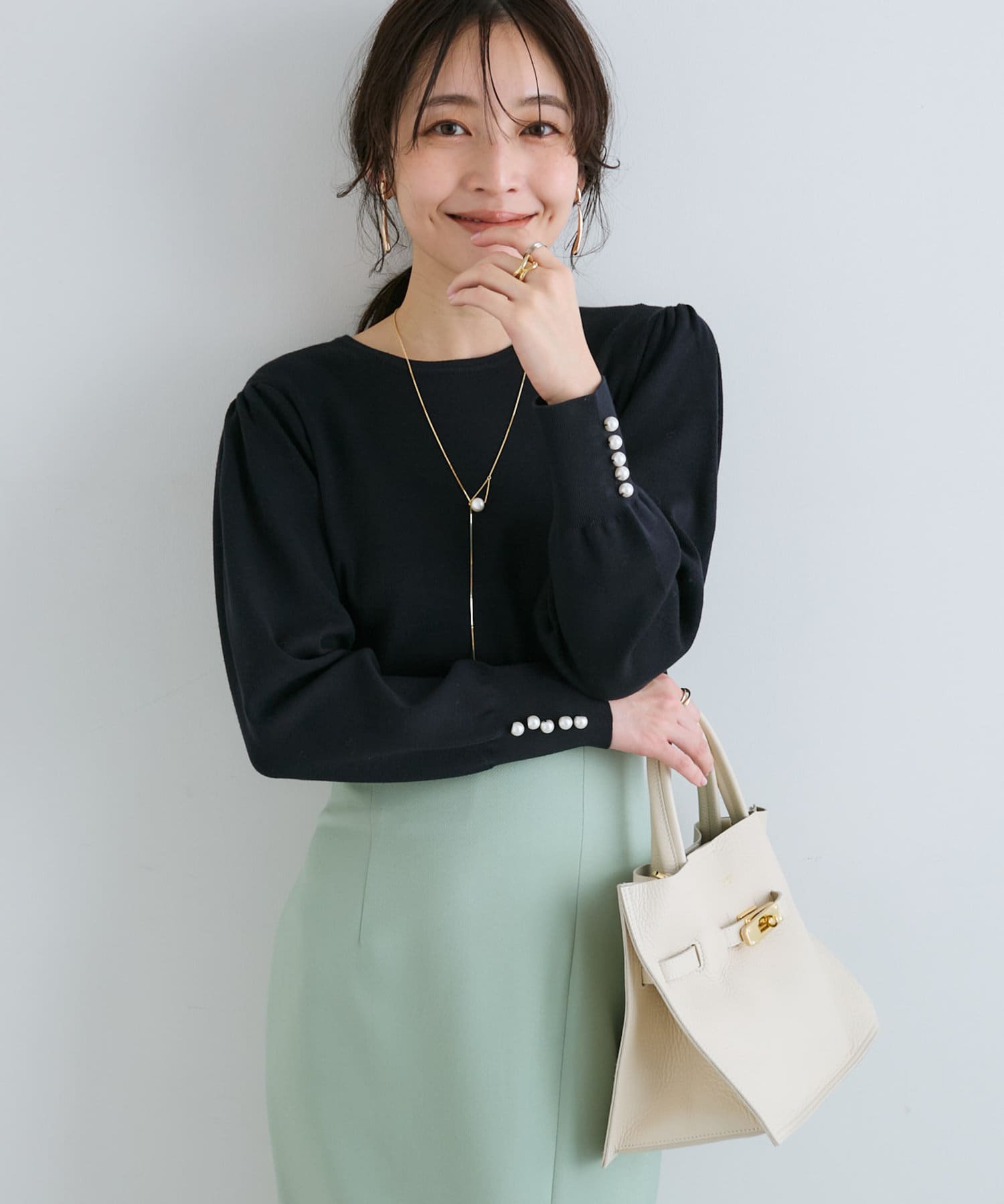 膨らんだ袖のフォルムが特徴。袖口のパールもさりげなくポイントになっています。