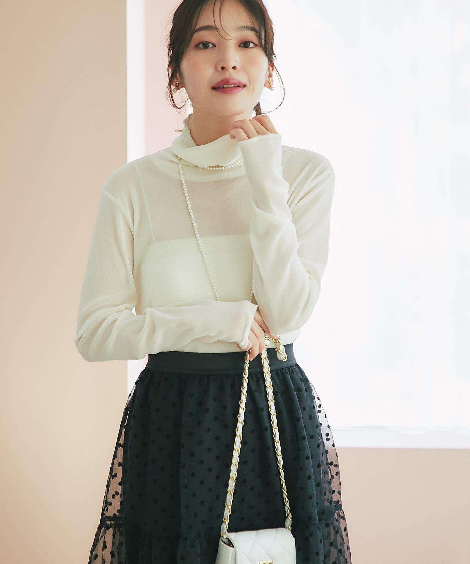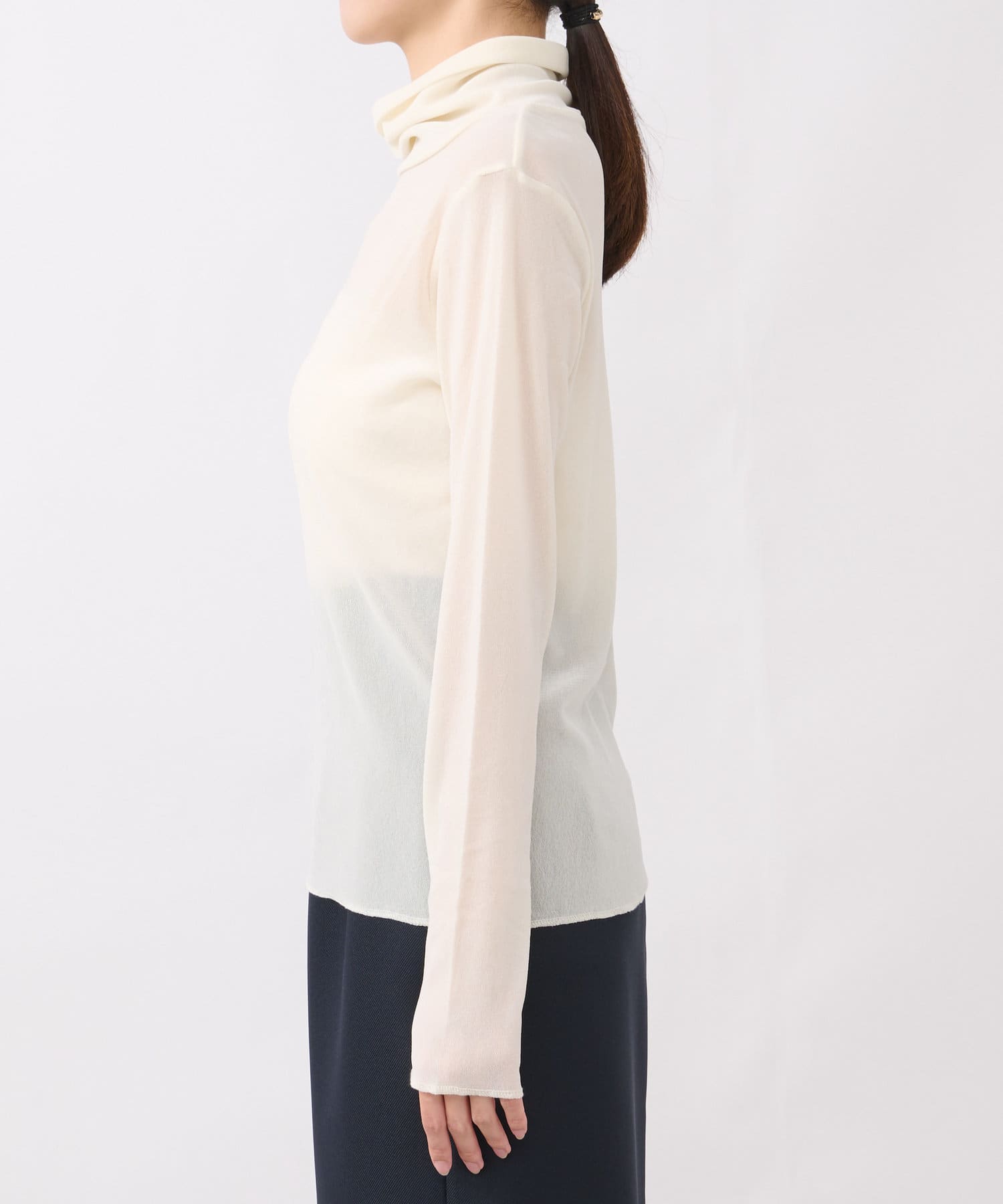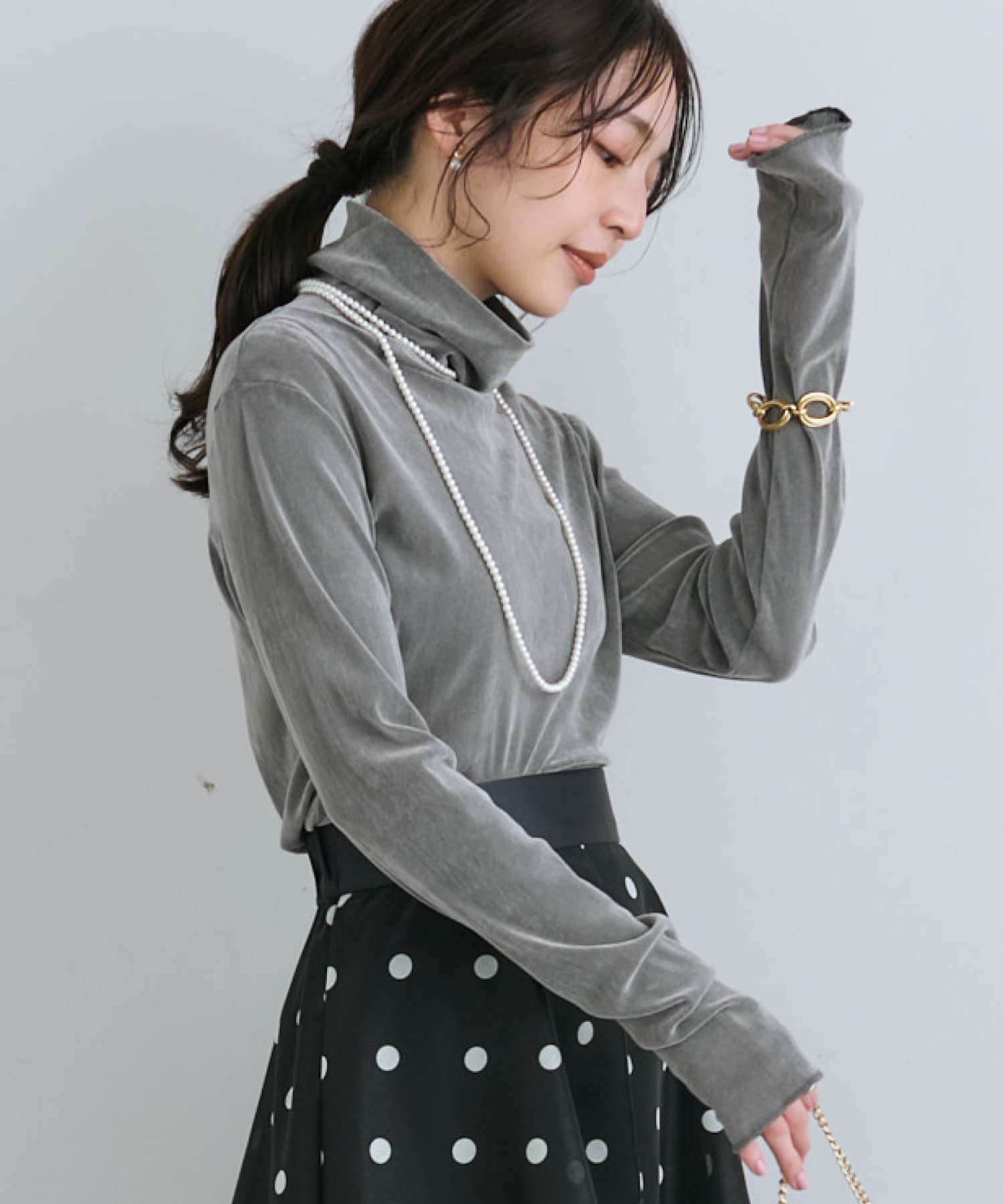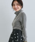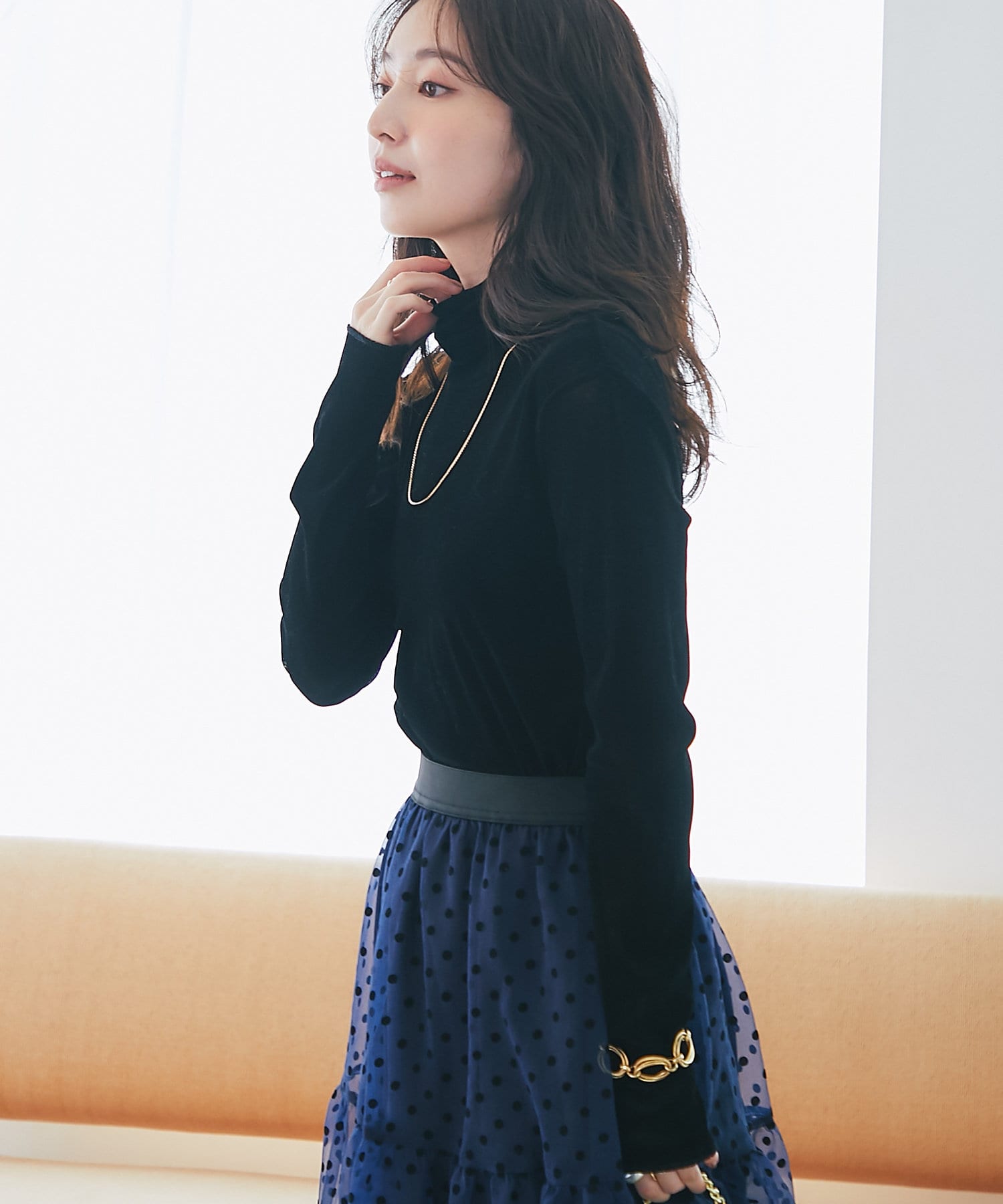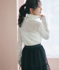 タートルネックのシンプルなボデイに程よいフィット感で、少し長い袖もポイント。