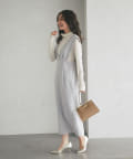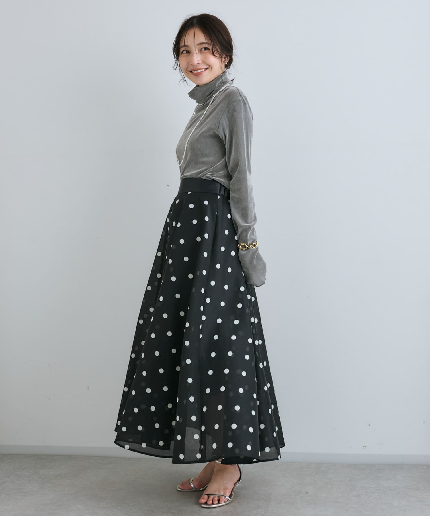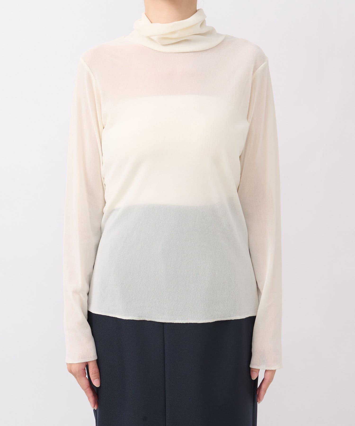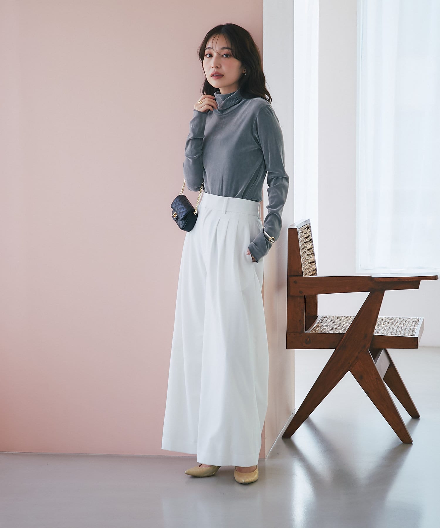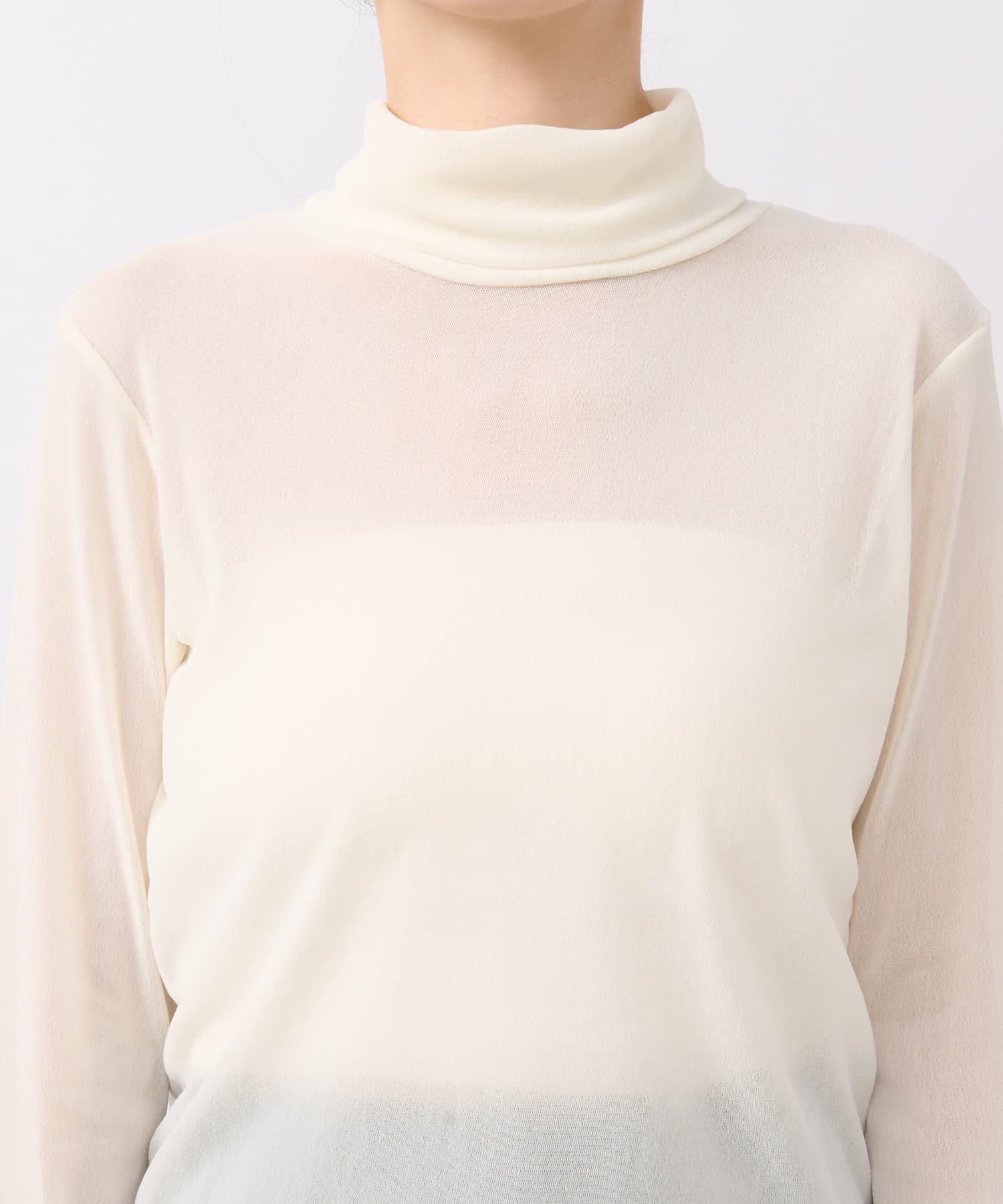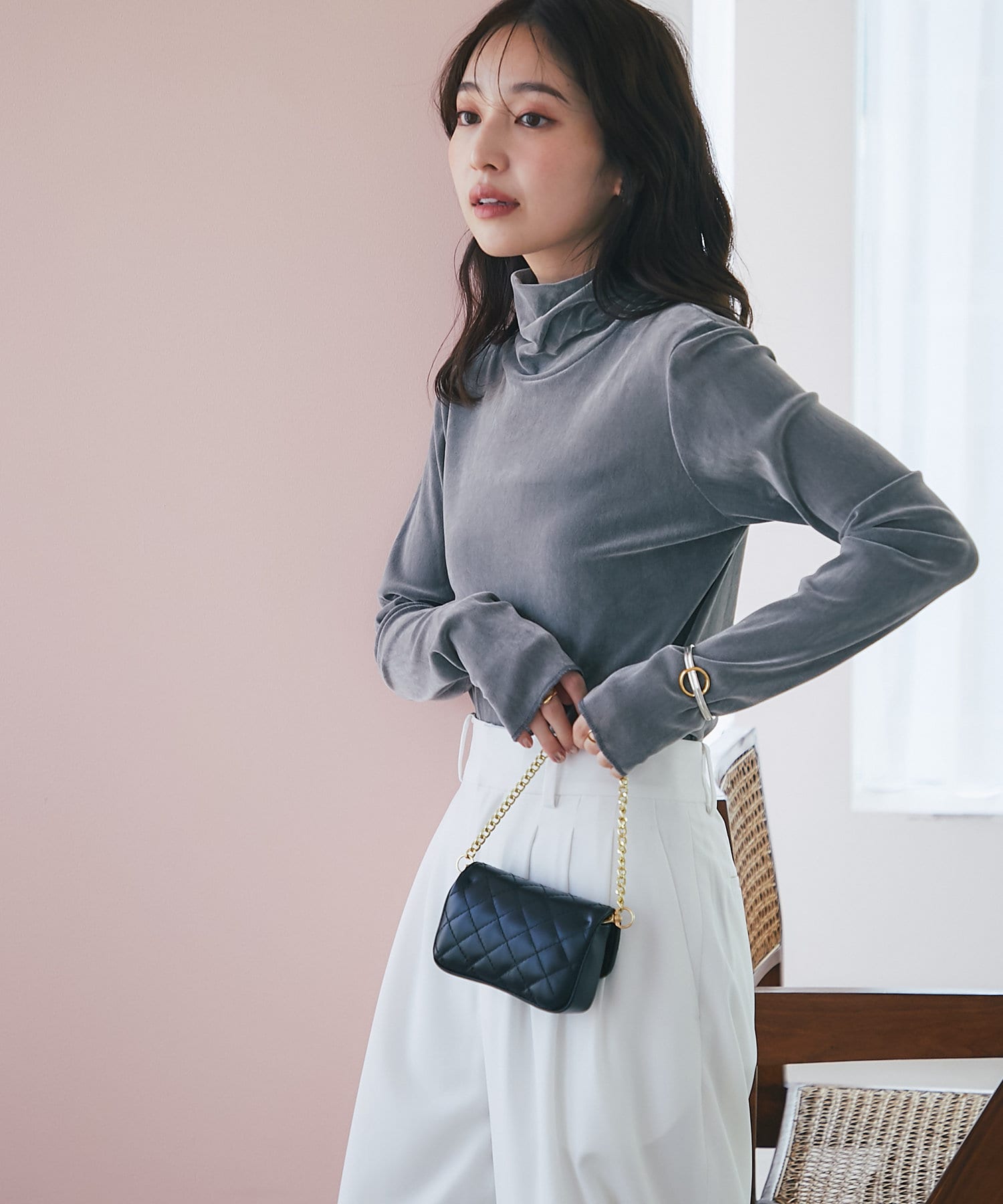 タートルネックのシンプルなボデイに程よいフィット感で、少し長い袖もポイント。