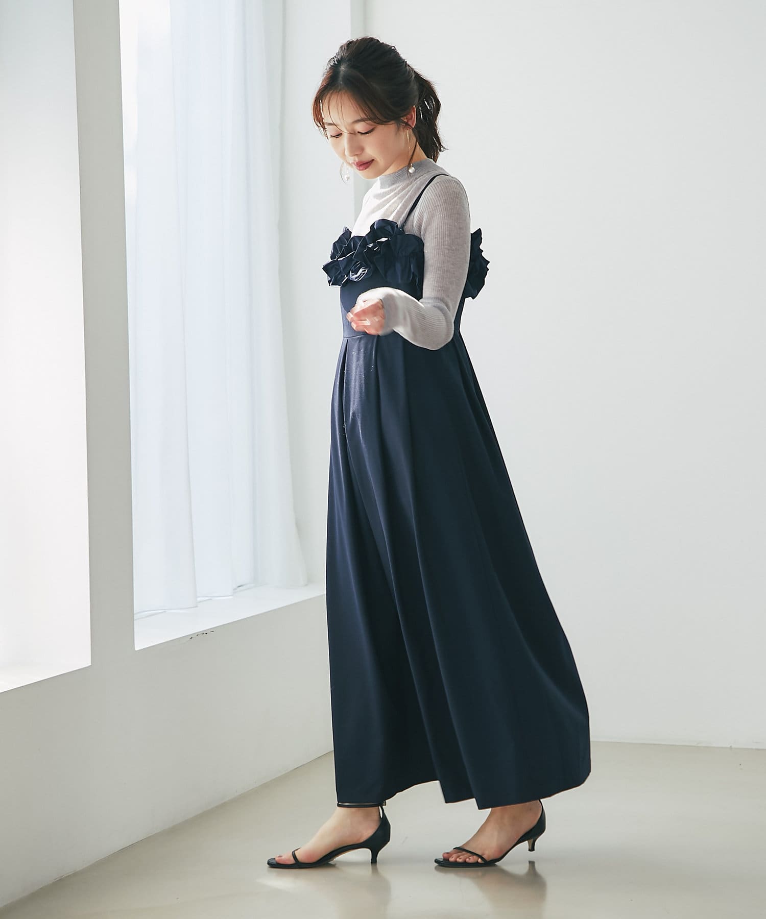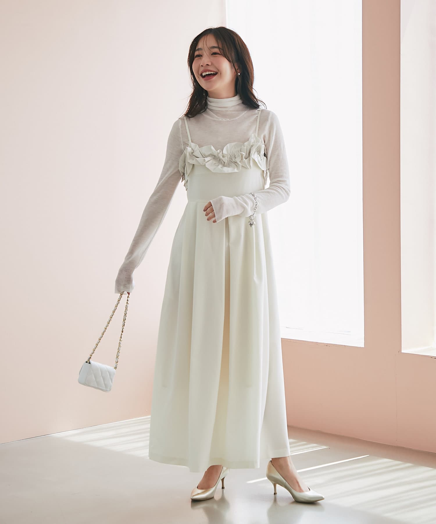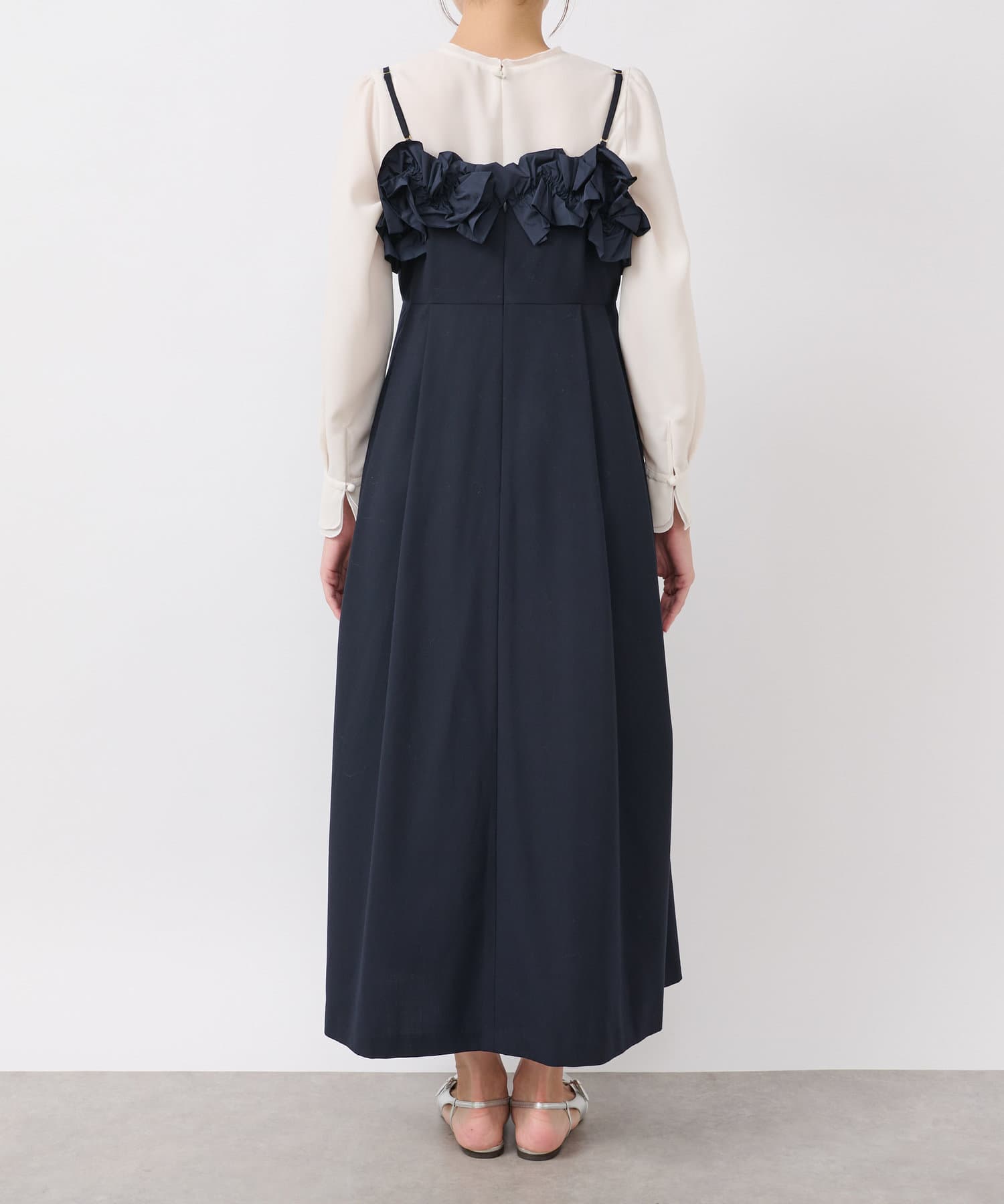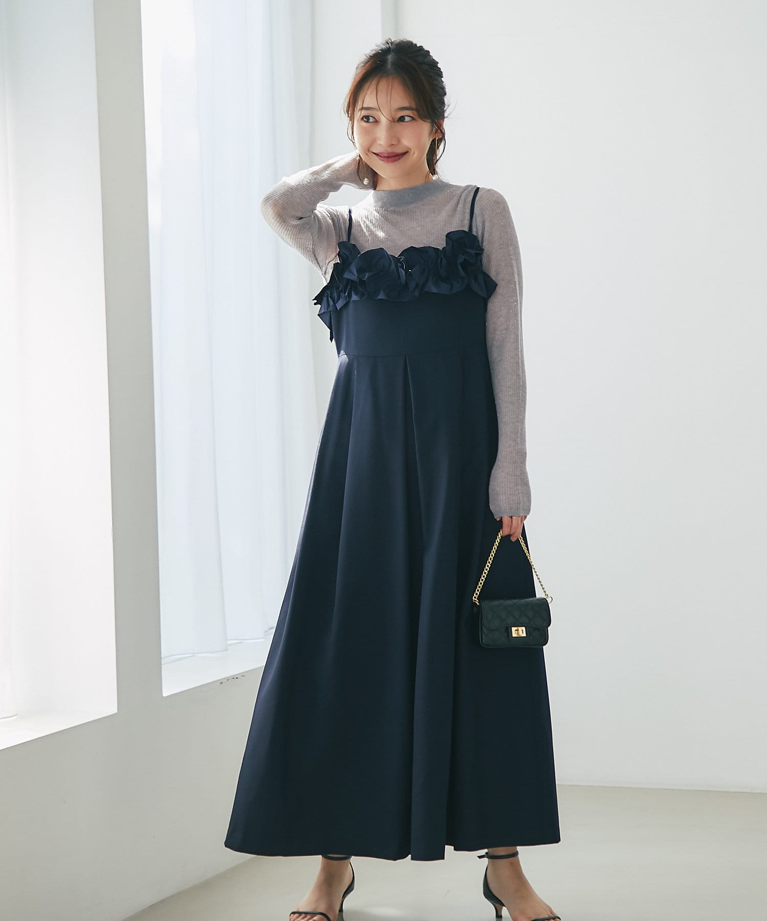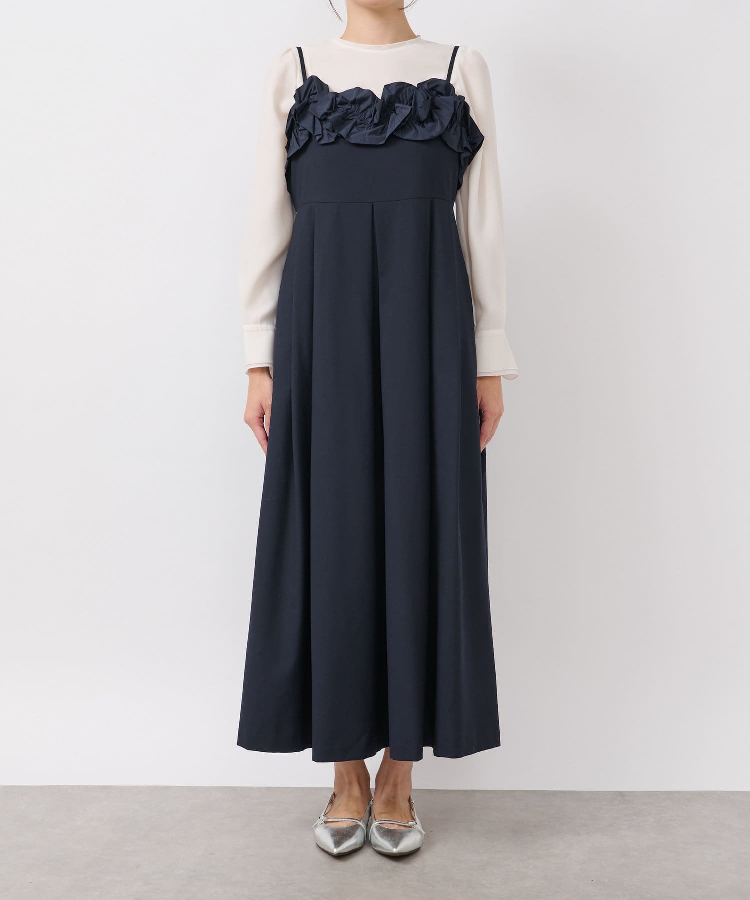胸元に華やかなフリルをあしらったマキシキャミワンピース。