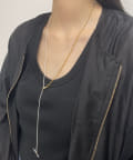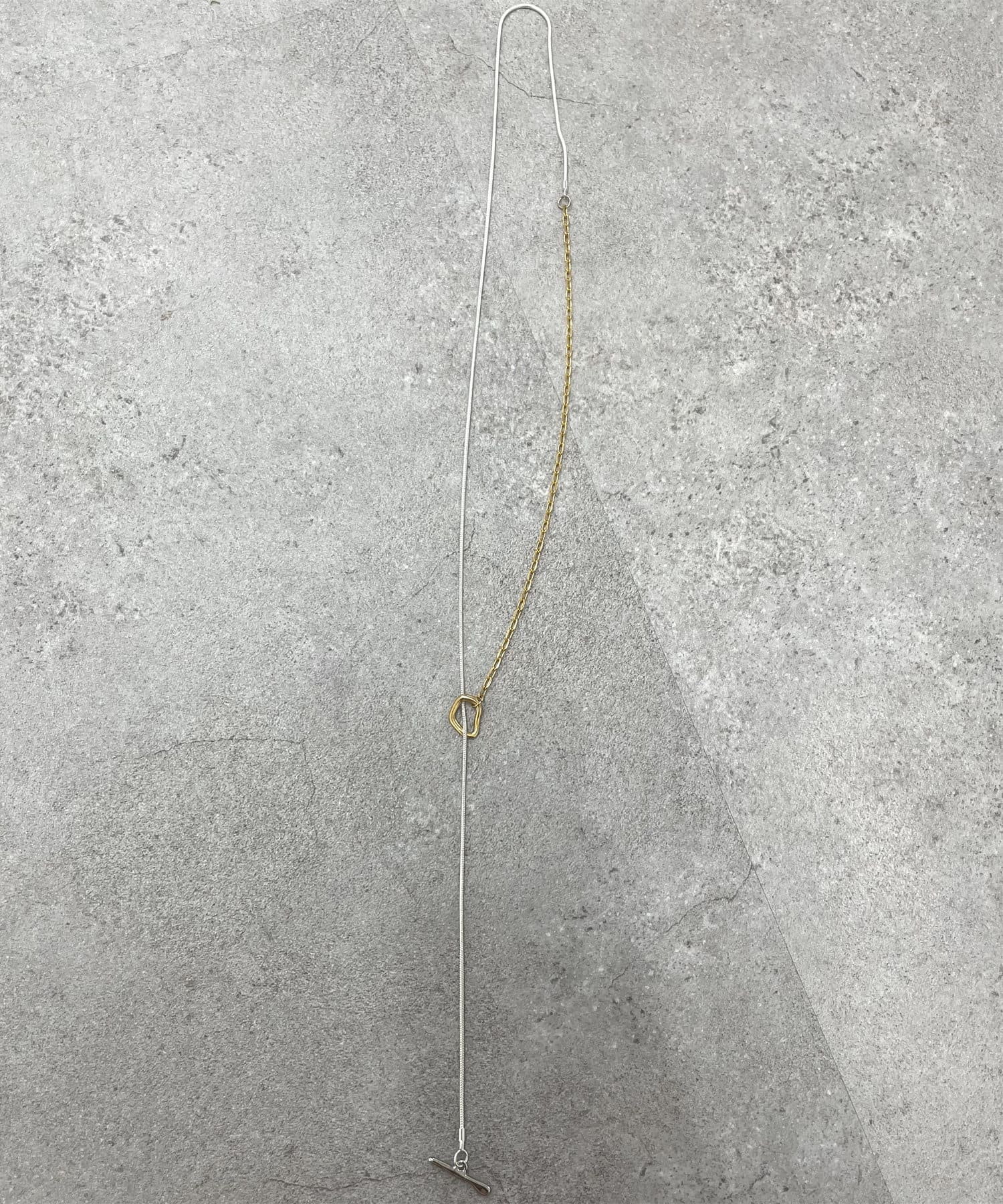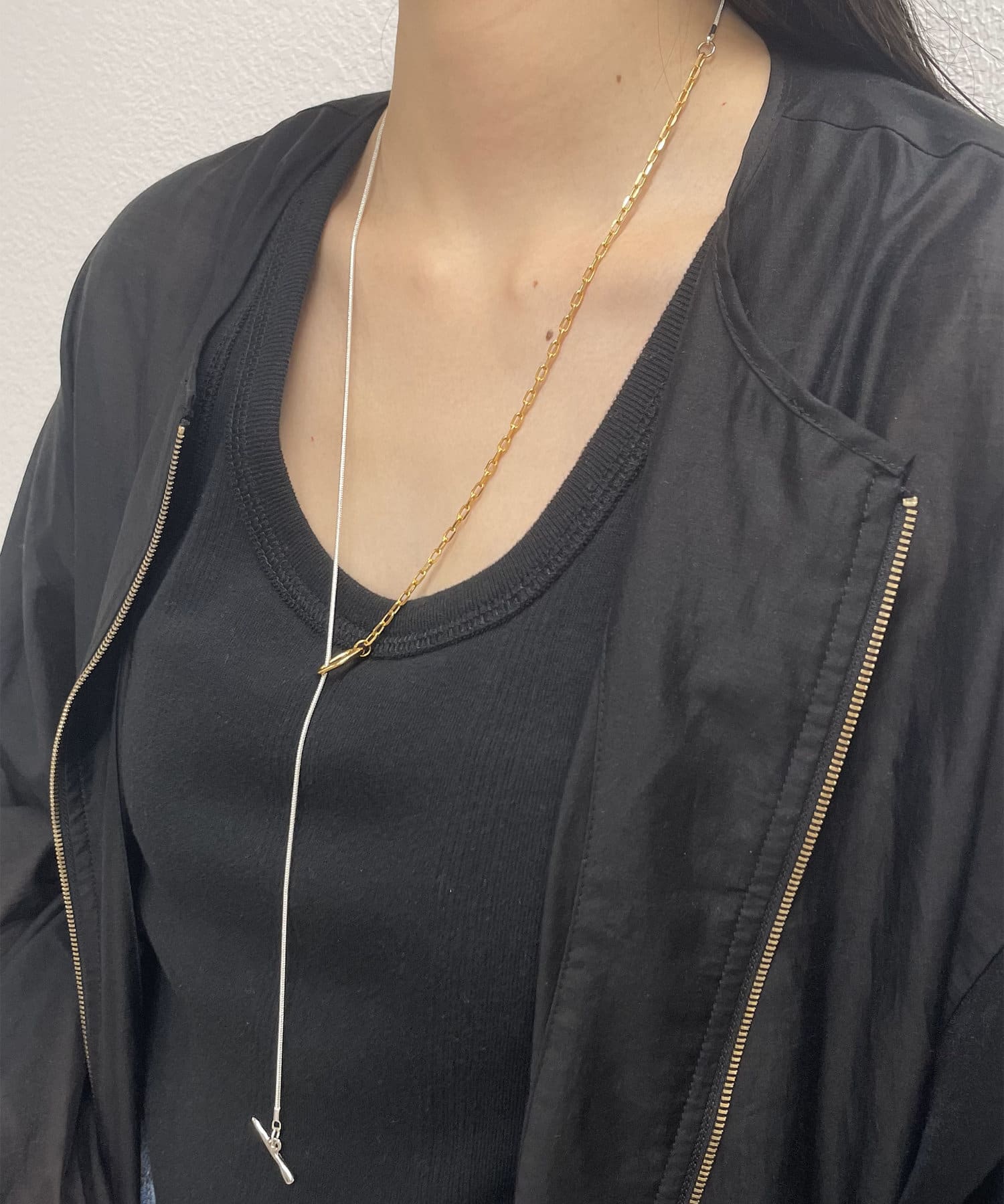 シルバーとゴールドのコンビネーションが目を引く、スタイリッシュなY字型ネックレス