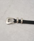 シルバーカラーのバックルが、ブラックレザーに映え、程よい存在感がコーディネートのアクセントに。