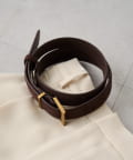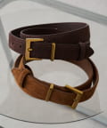 使い込むほどに手に馴染み、あなただけの風合いへと育っていくため、まるで長い年月を共に重ねるように自然と愛着が深まります。さらに、バックルとベルトを繋ぐ金具にはゴールドカラーを採用し、落ち着いた色味がスウェードの素材感を引き立て、上品で洗練された印象をプラス。シンプルなデザインだからこそ、素材とディテールへのこだわりが際立つ仕上がりとなっています。