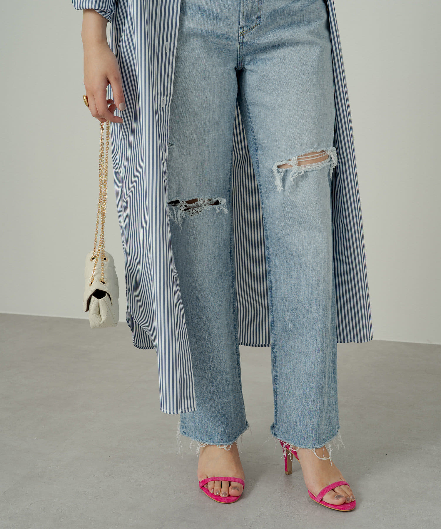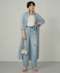 前を開けてシャツを羽織にして使ったり、レイヤードスタイルとしてデニムやジョーゼットパンツを忍ばせても可愛く着て頂けます。
