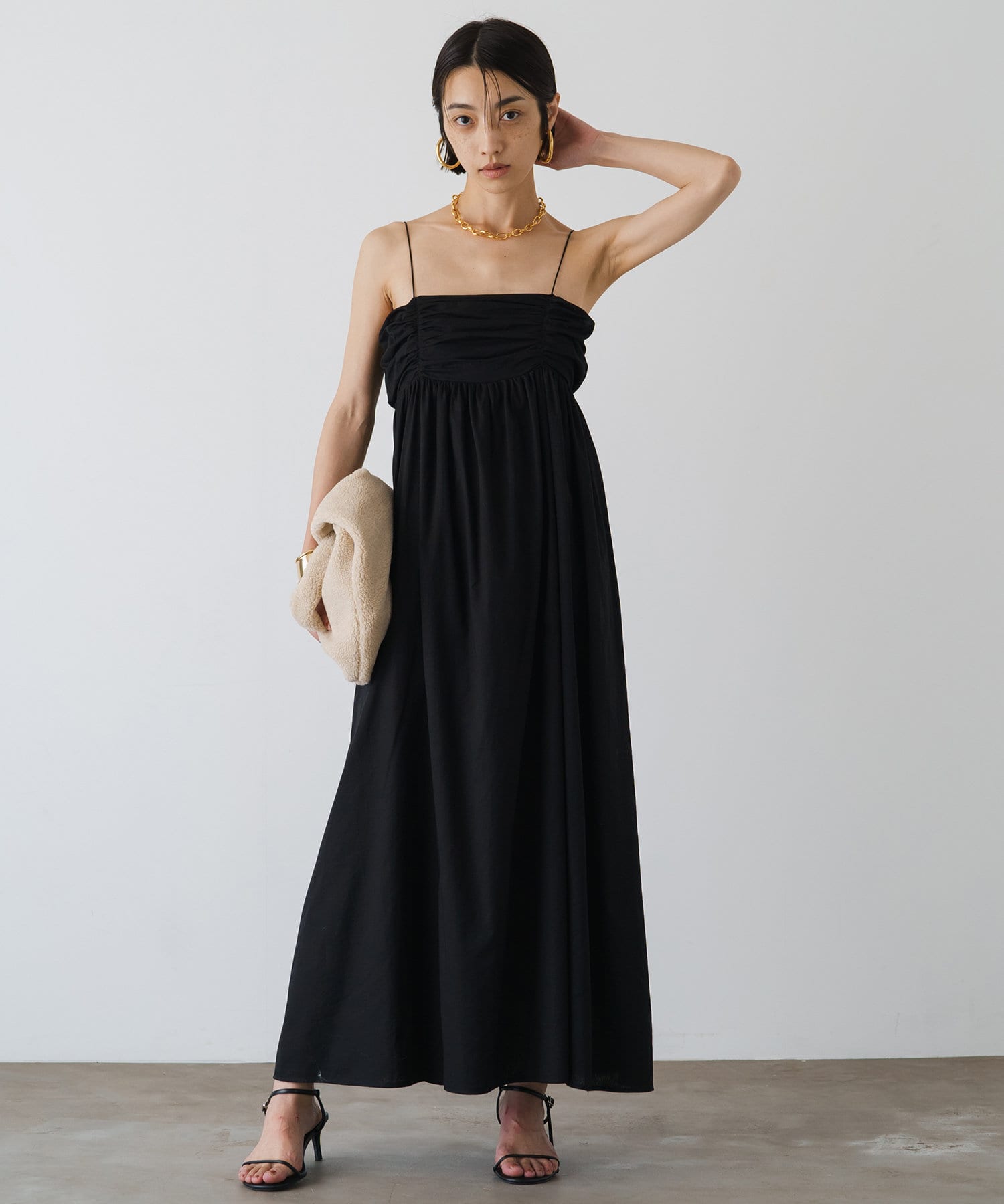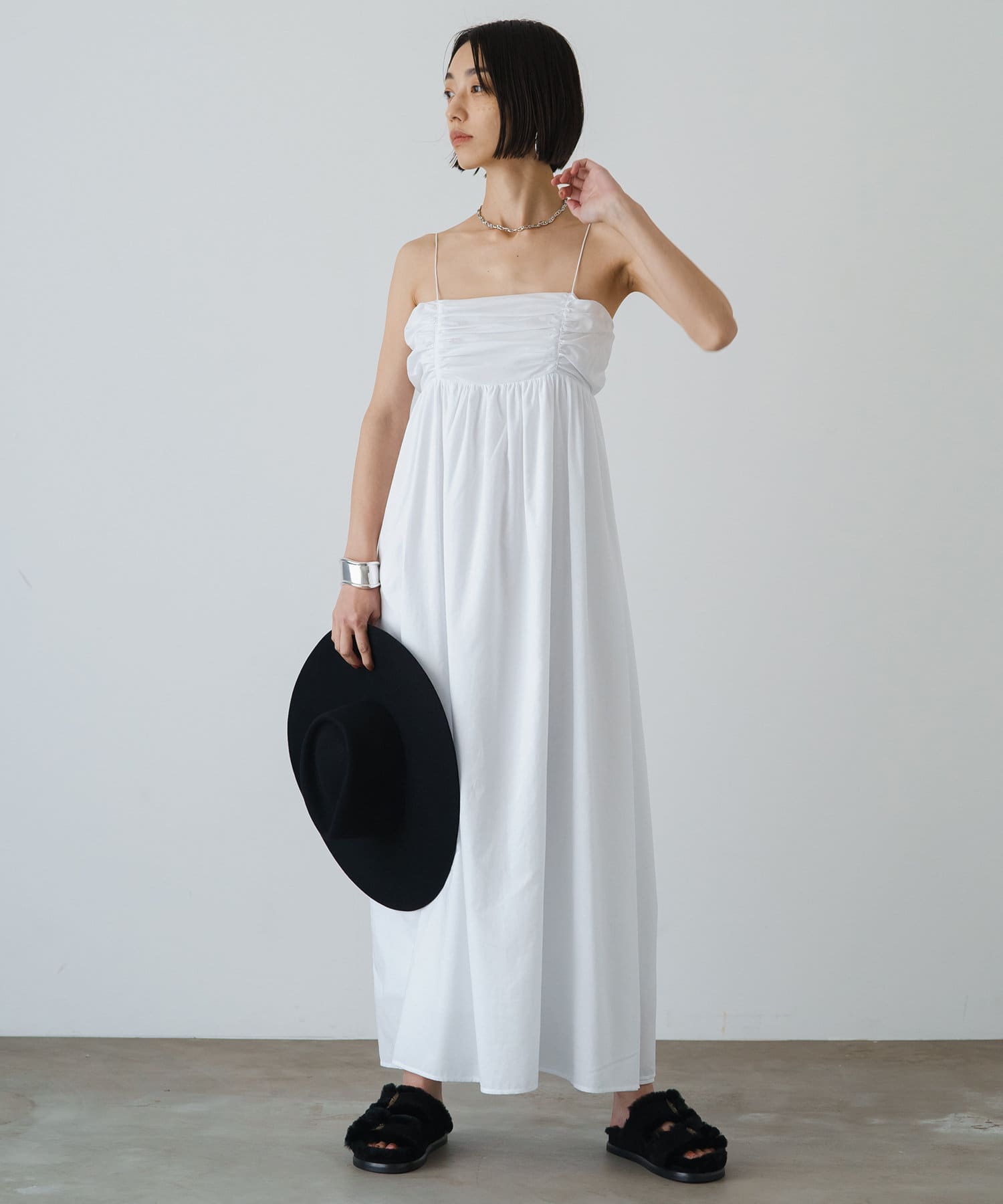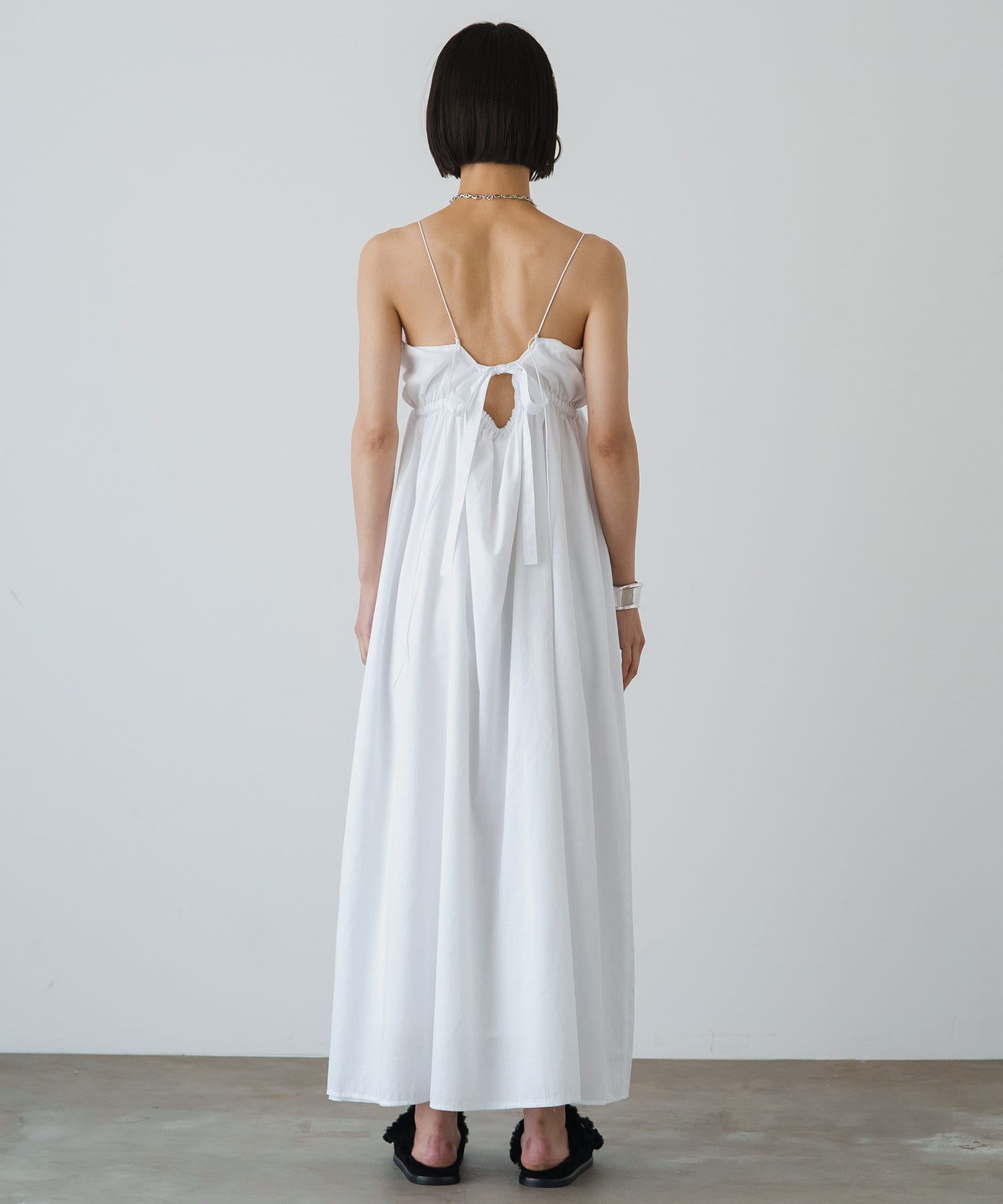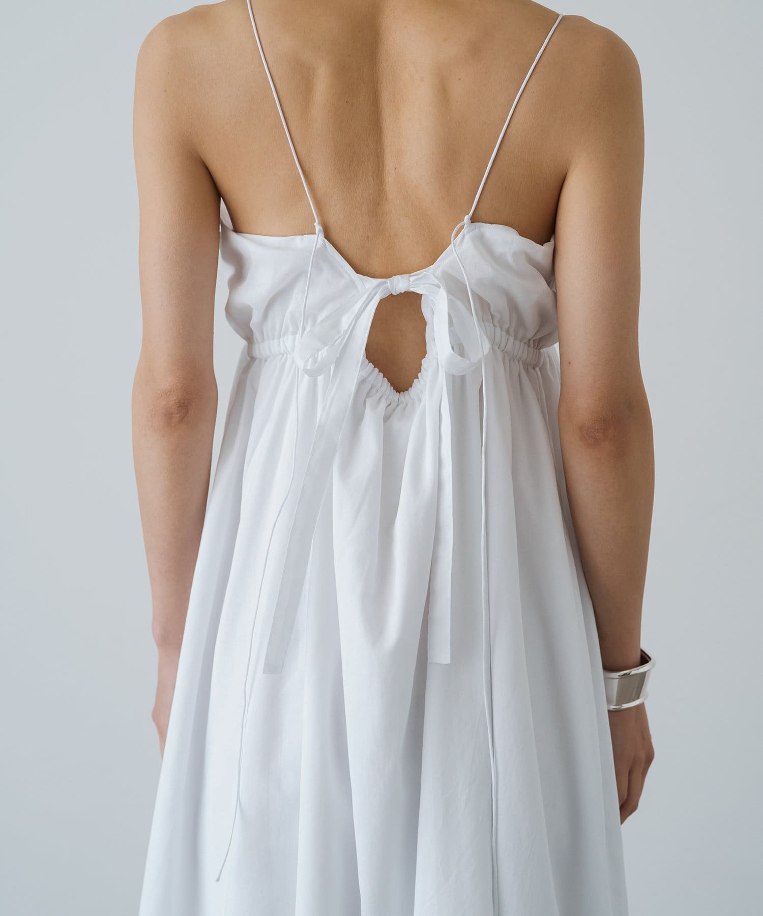 胸元のギャザーと背中のリボンデザインが女性らしいキャミソールタイプのワンピース。