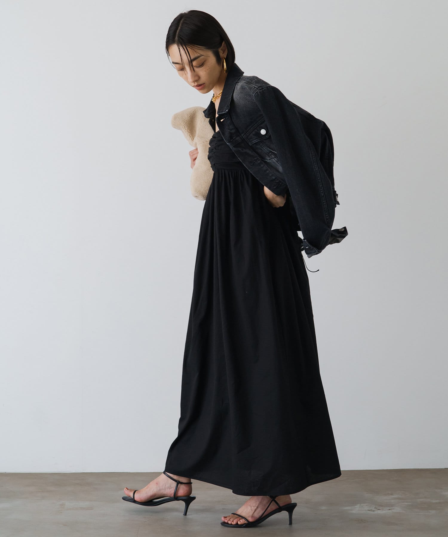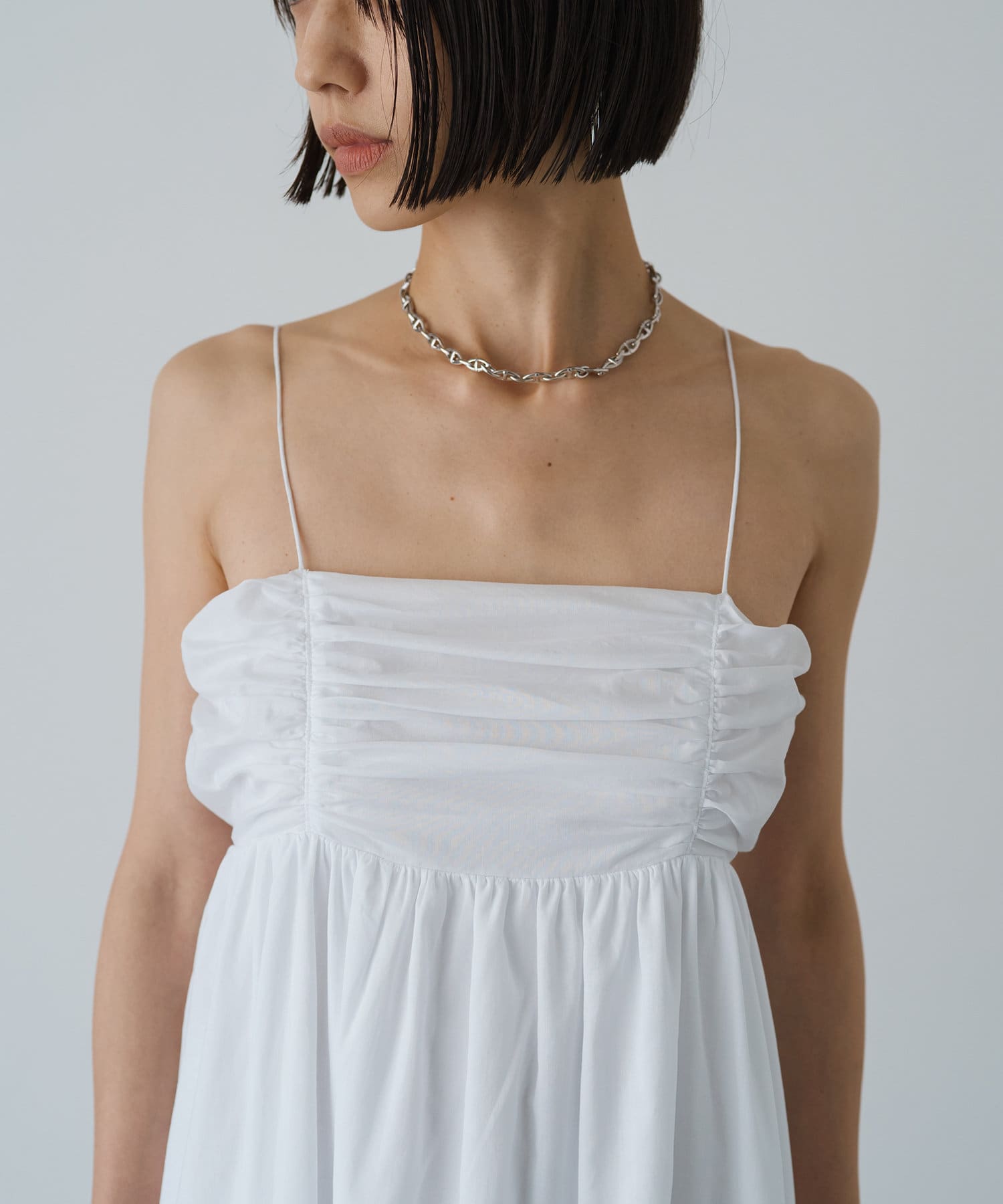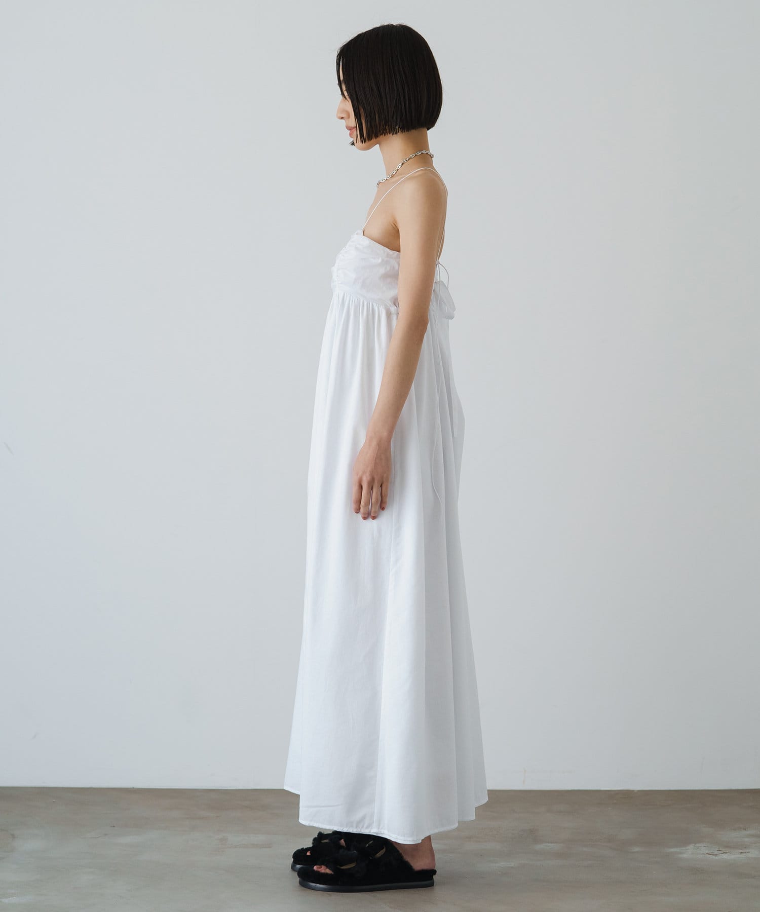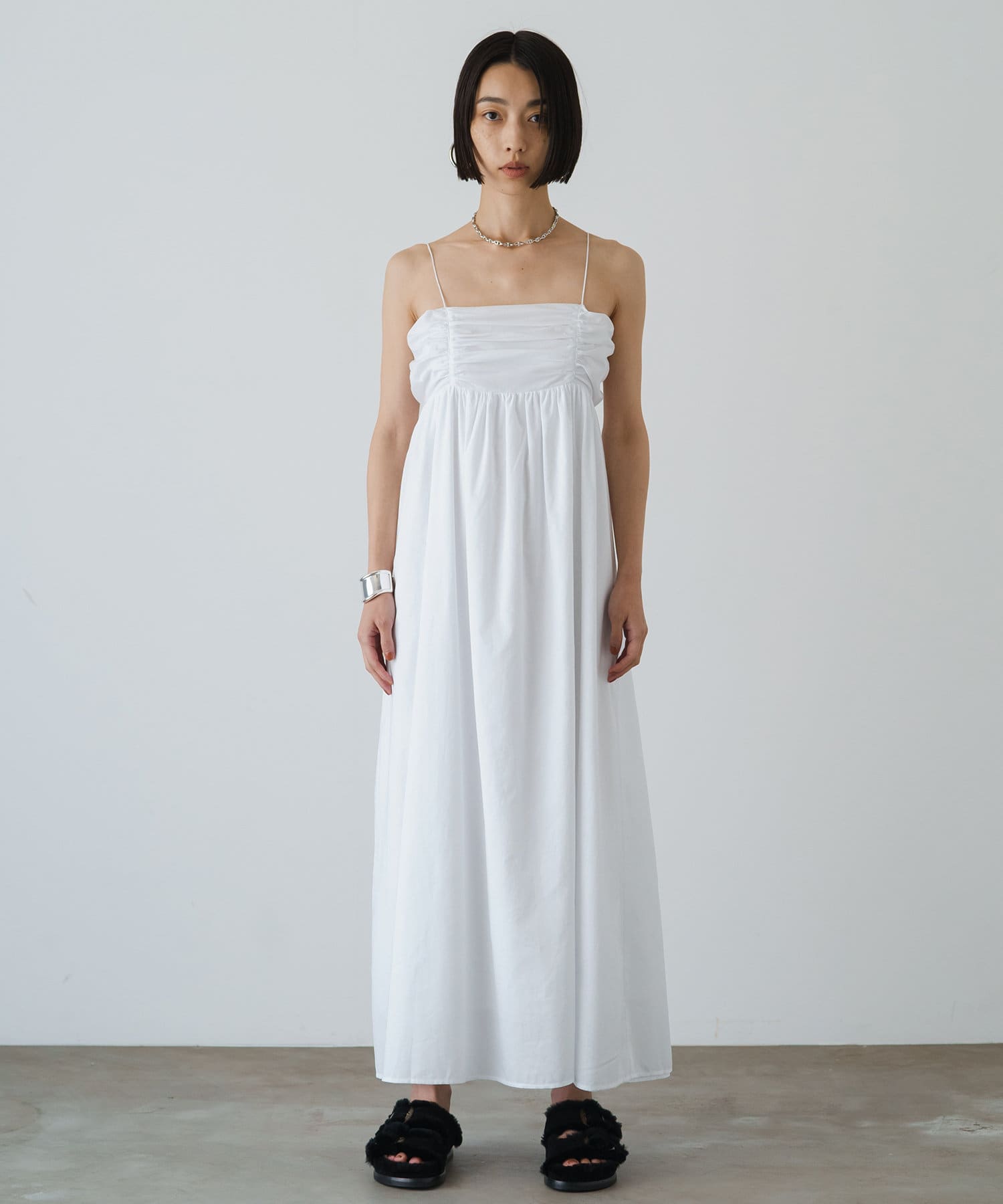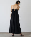 胸元のギャザーと背中のリボンデザインが女性らしいキャミソールタイプのワンピース。