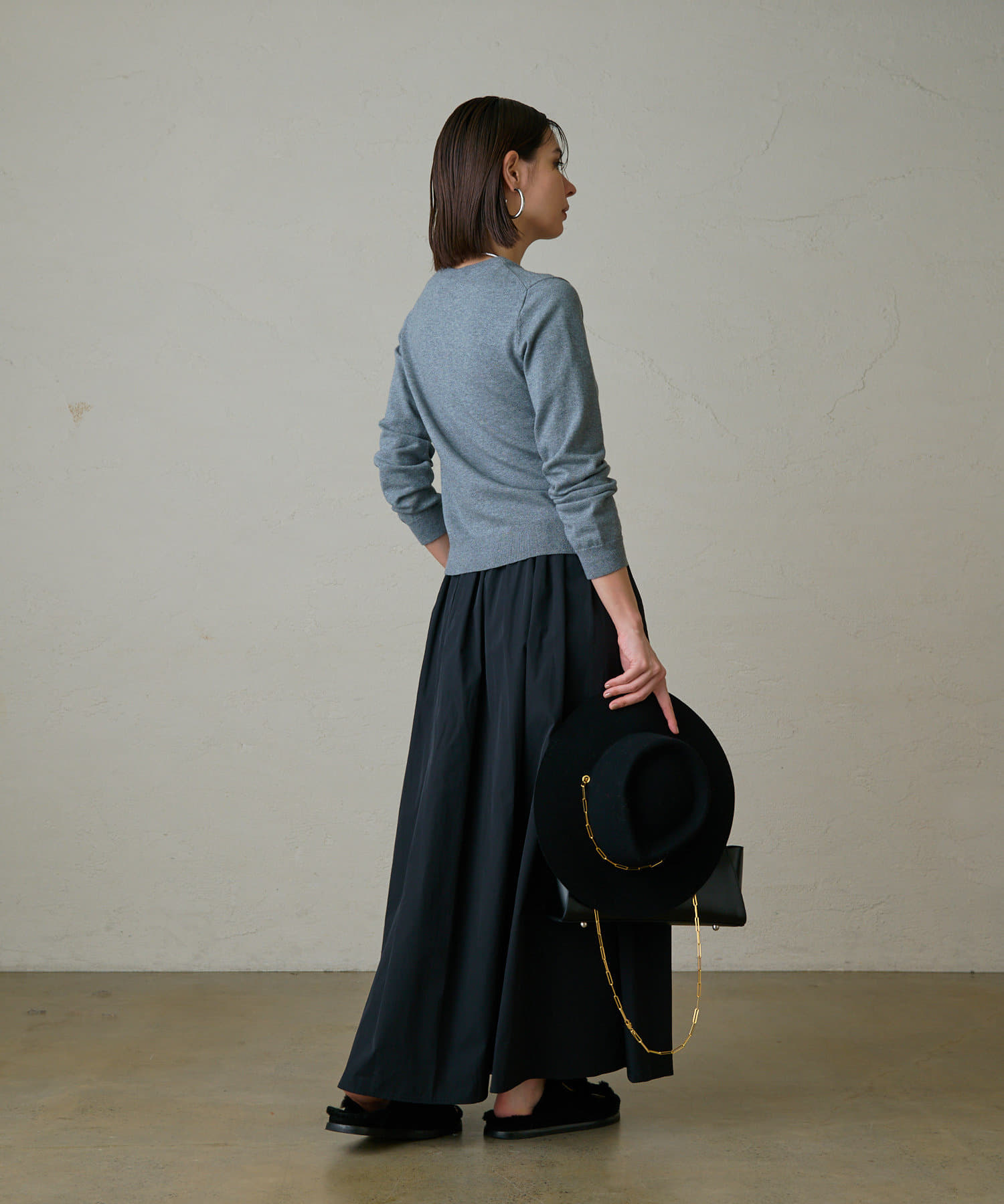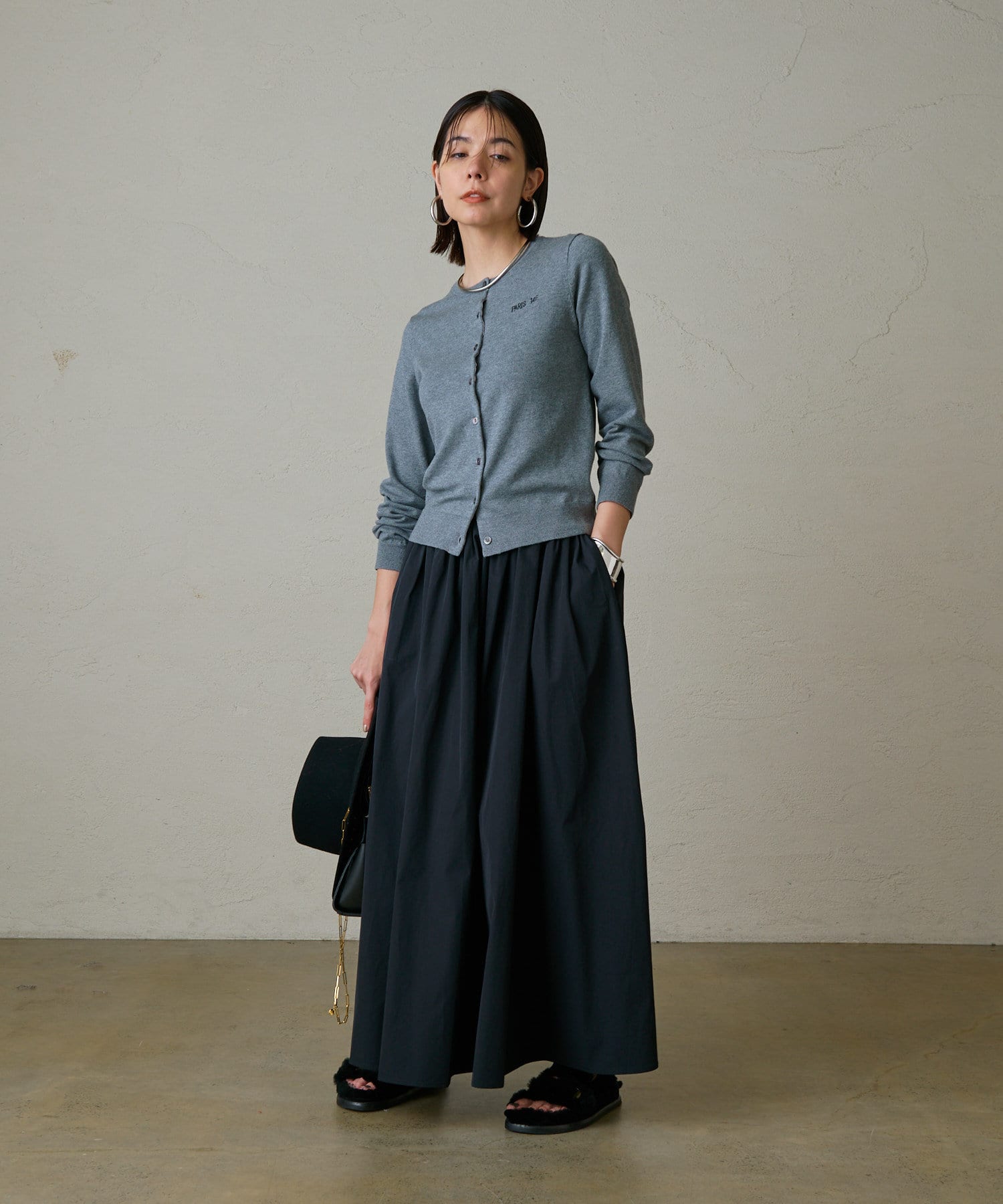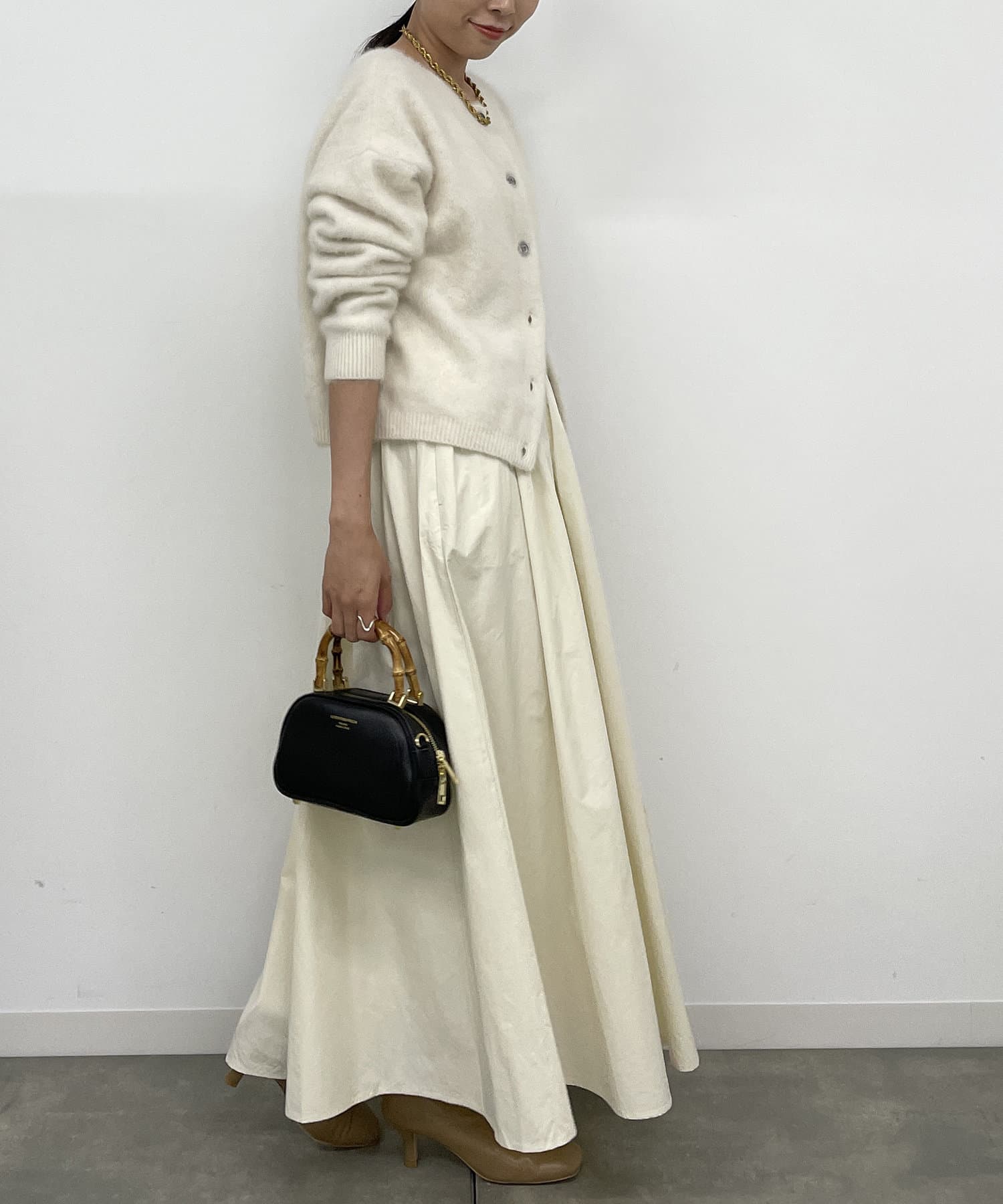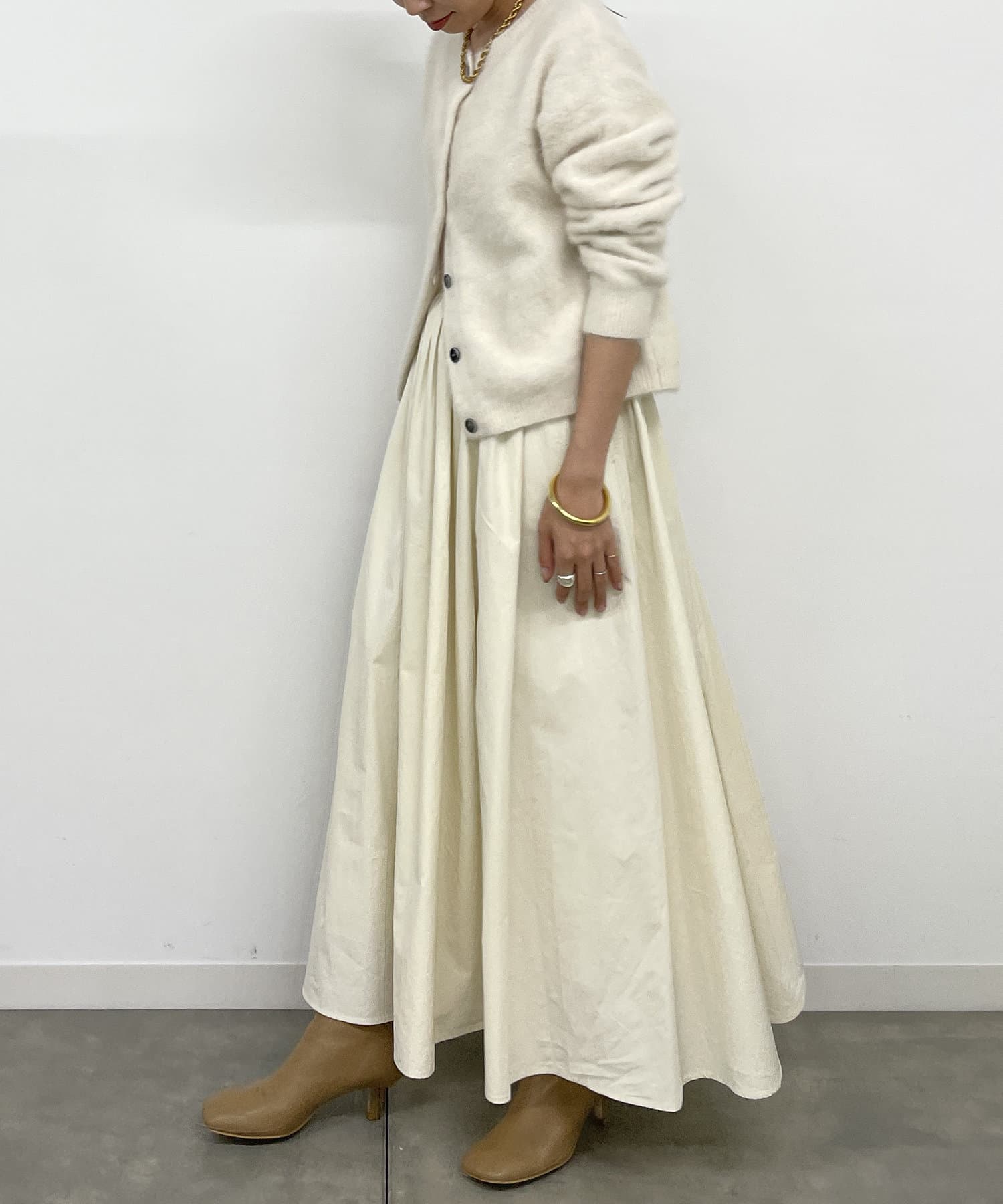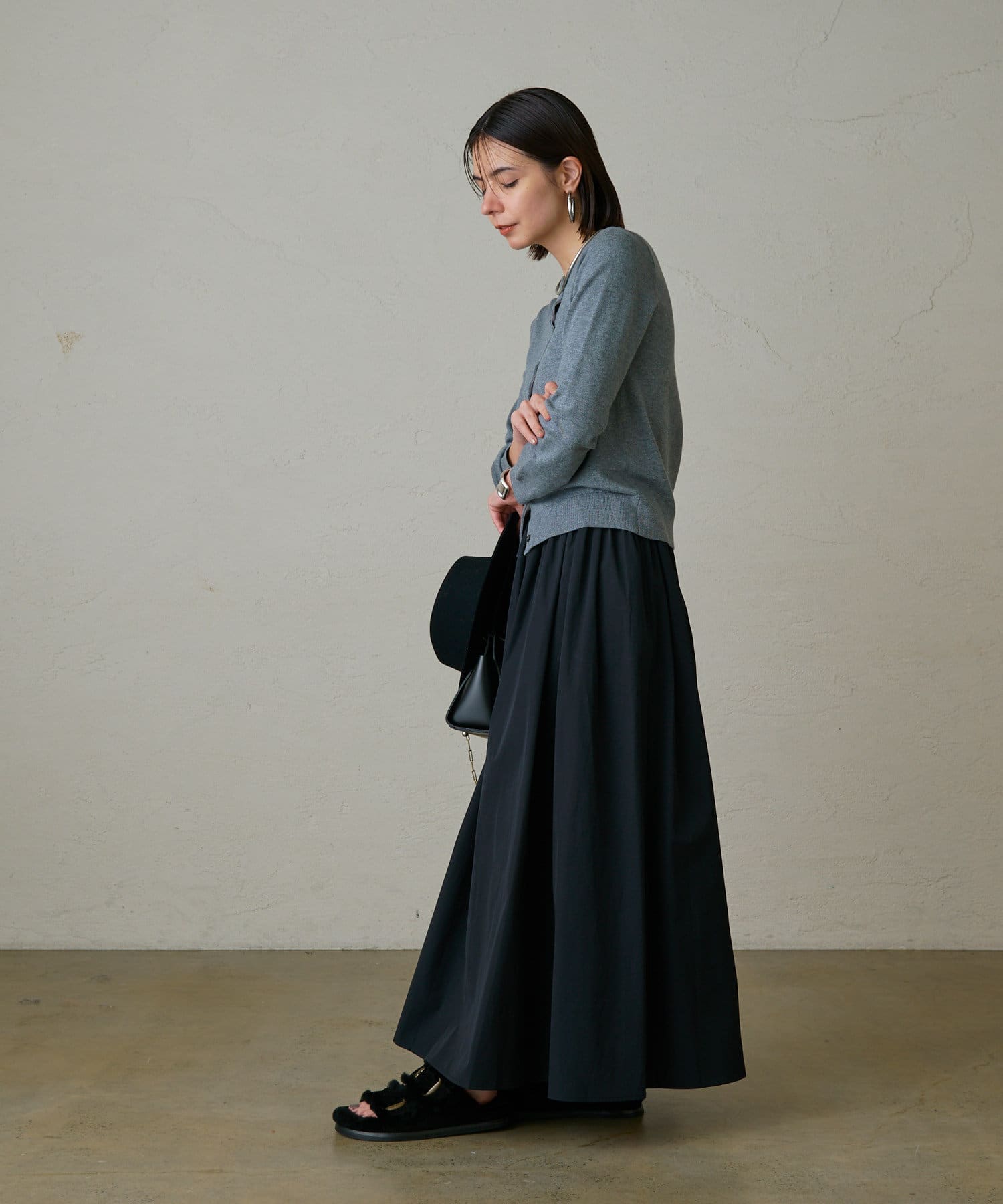 今季はカーディガンの下ボタンを少し多めに開けて、ヘルシーな肌見せスタイルで抜け感を感じる着こなしがおすすめです。