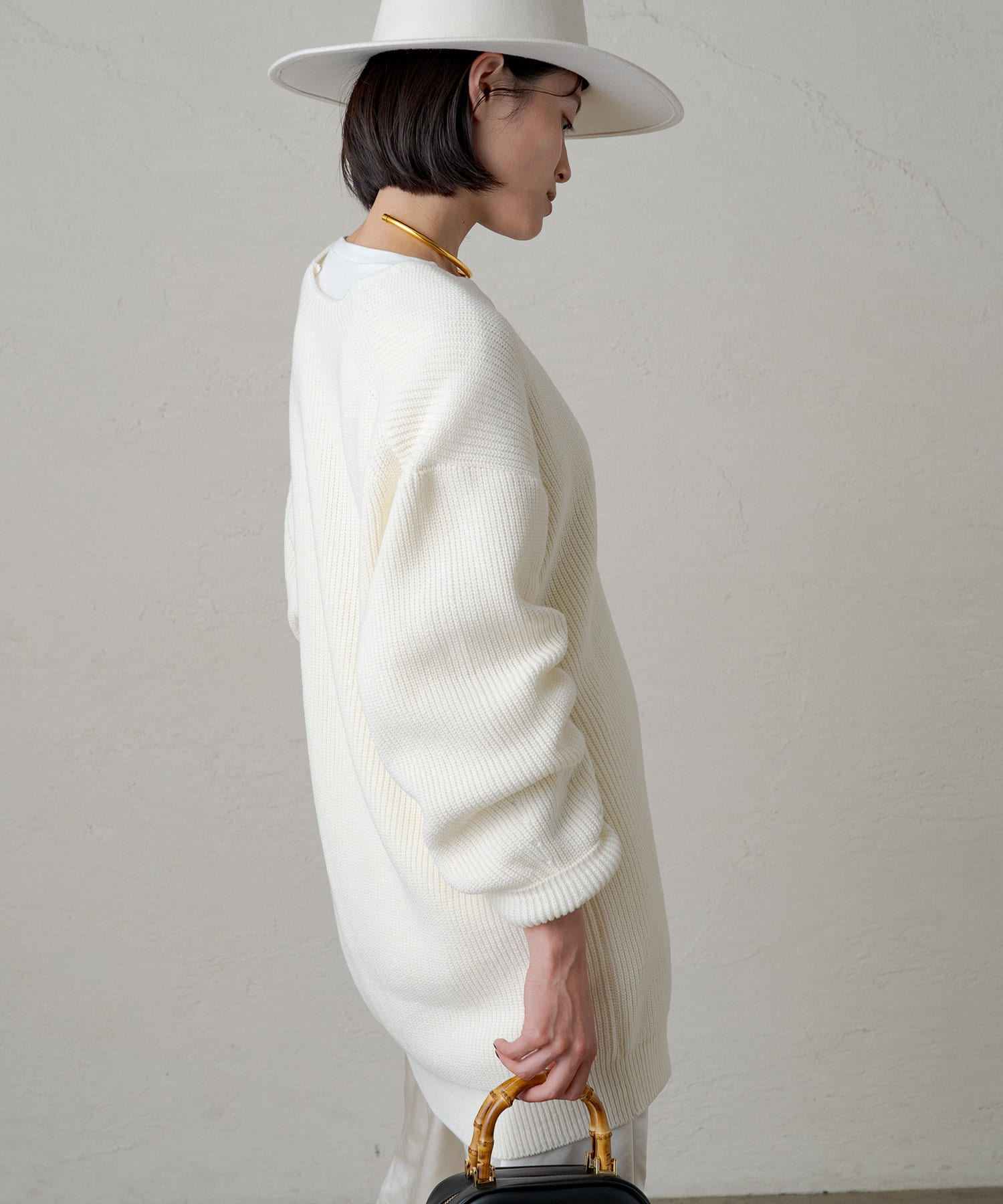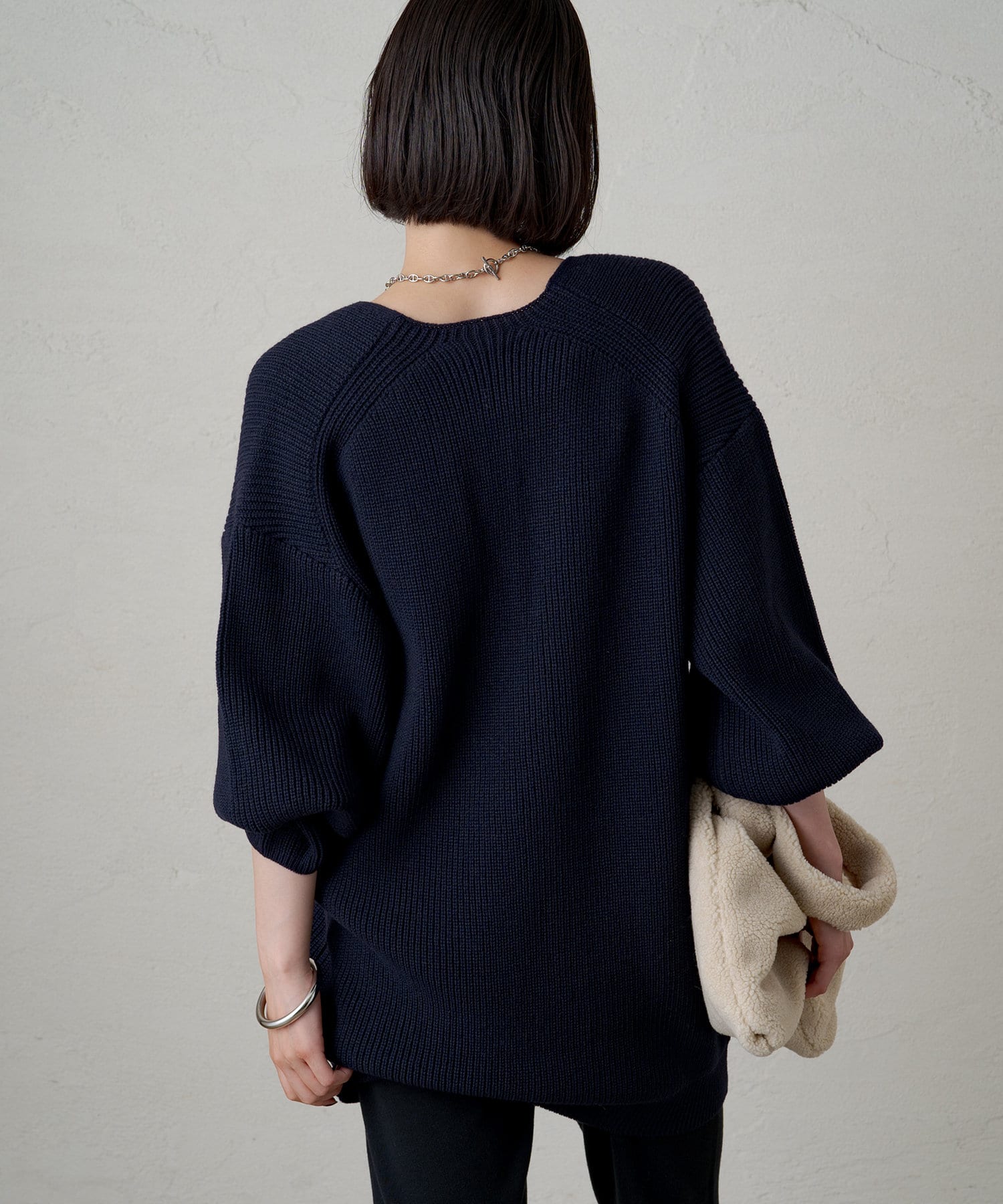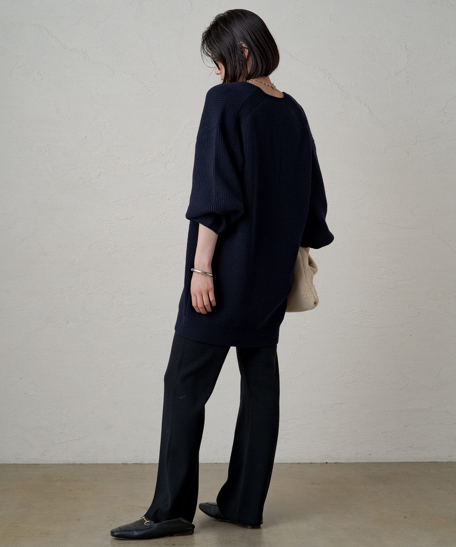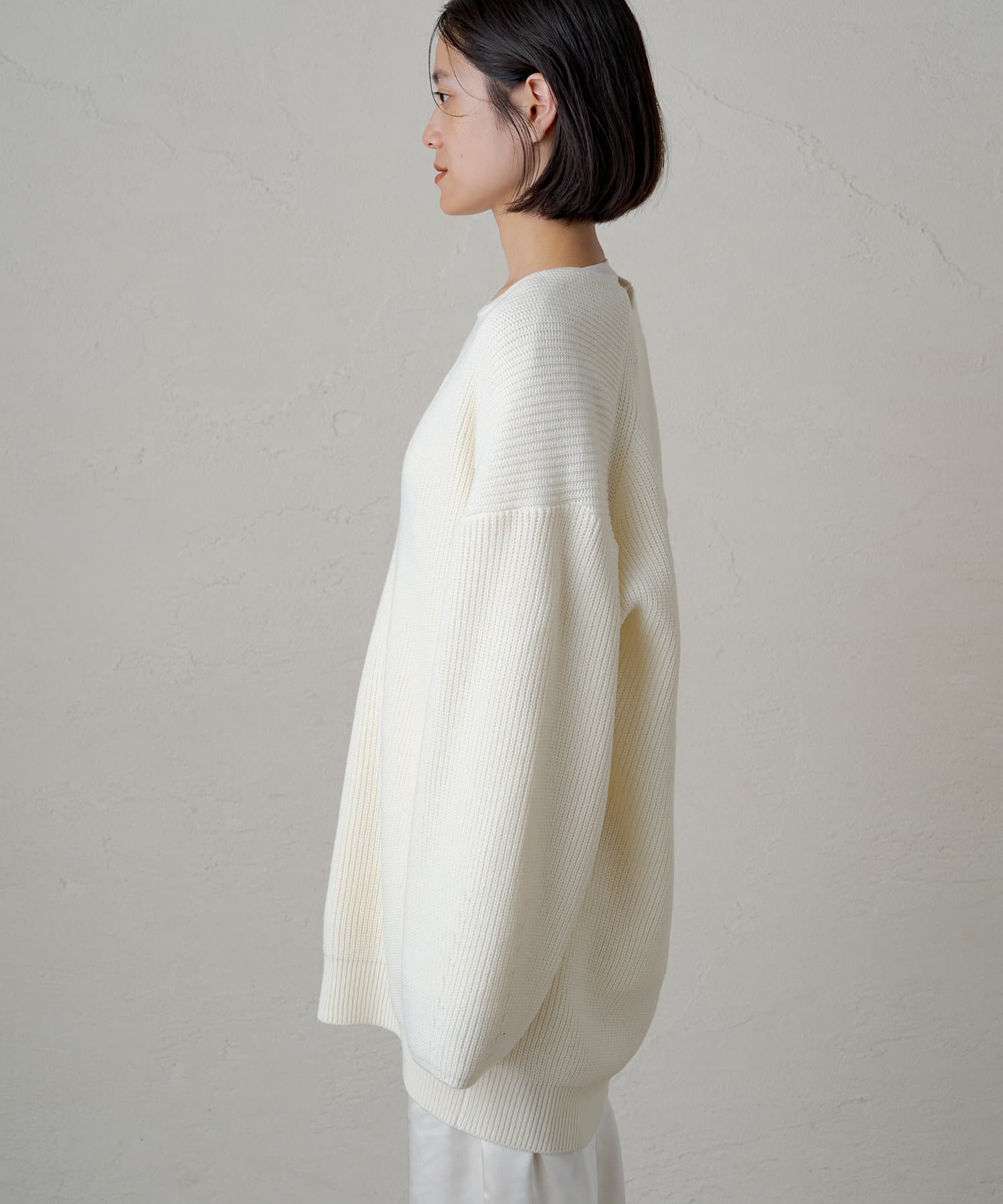 たっぷりとしたゆとりが身体を泳がせて、さらっと着こなしてもボディラインを拾いづらいニットです。
