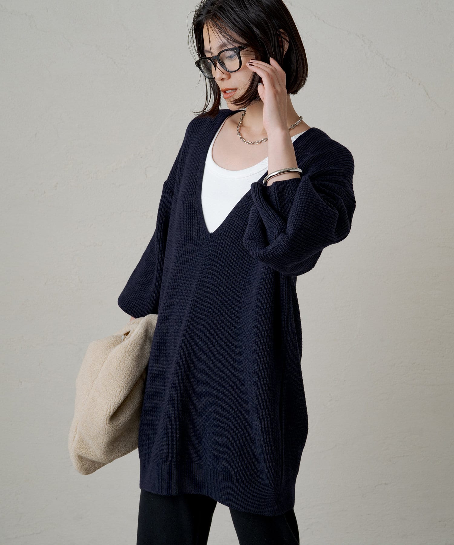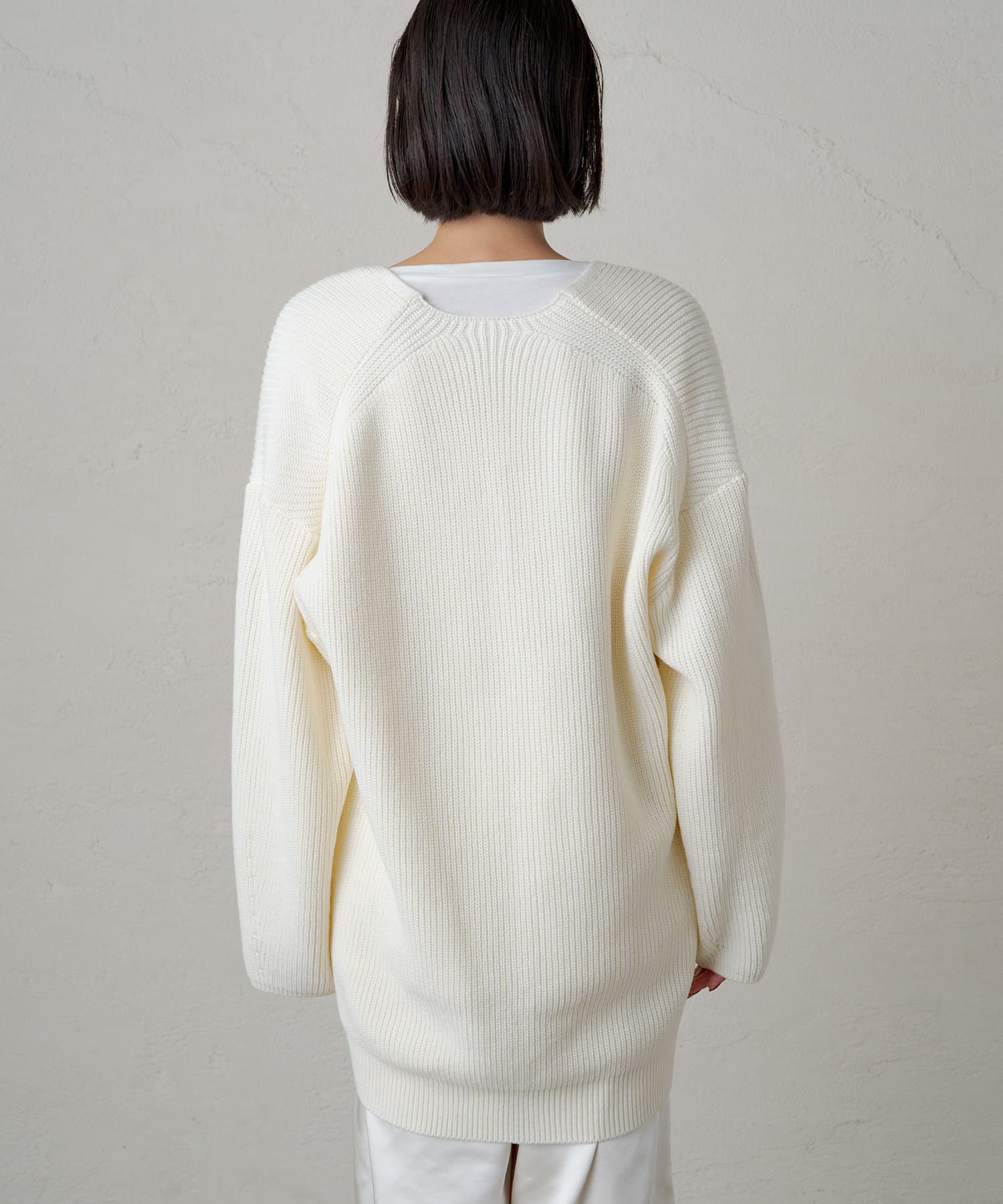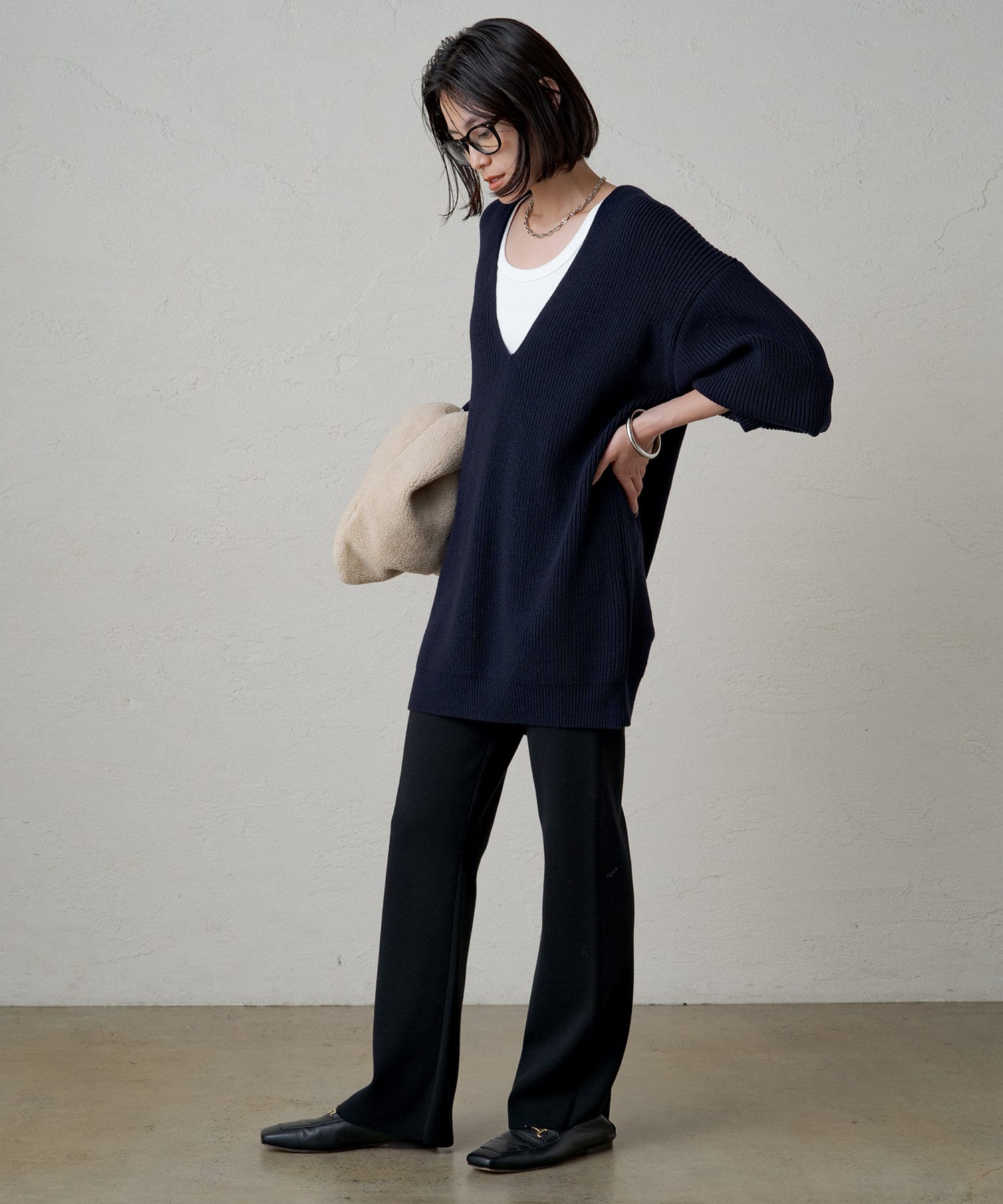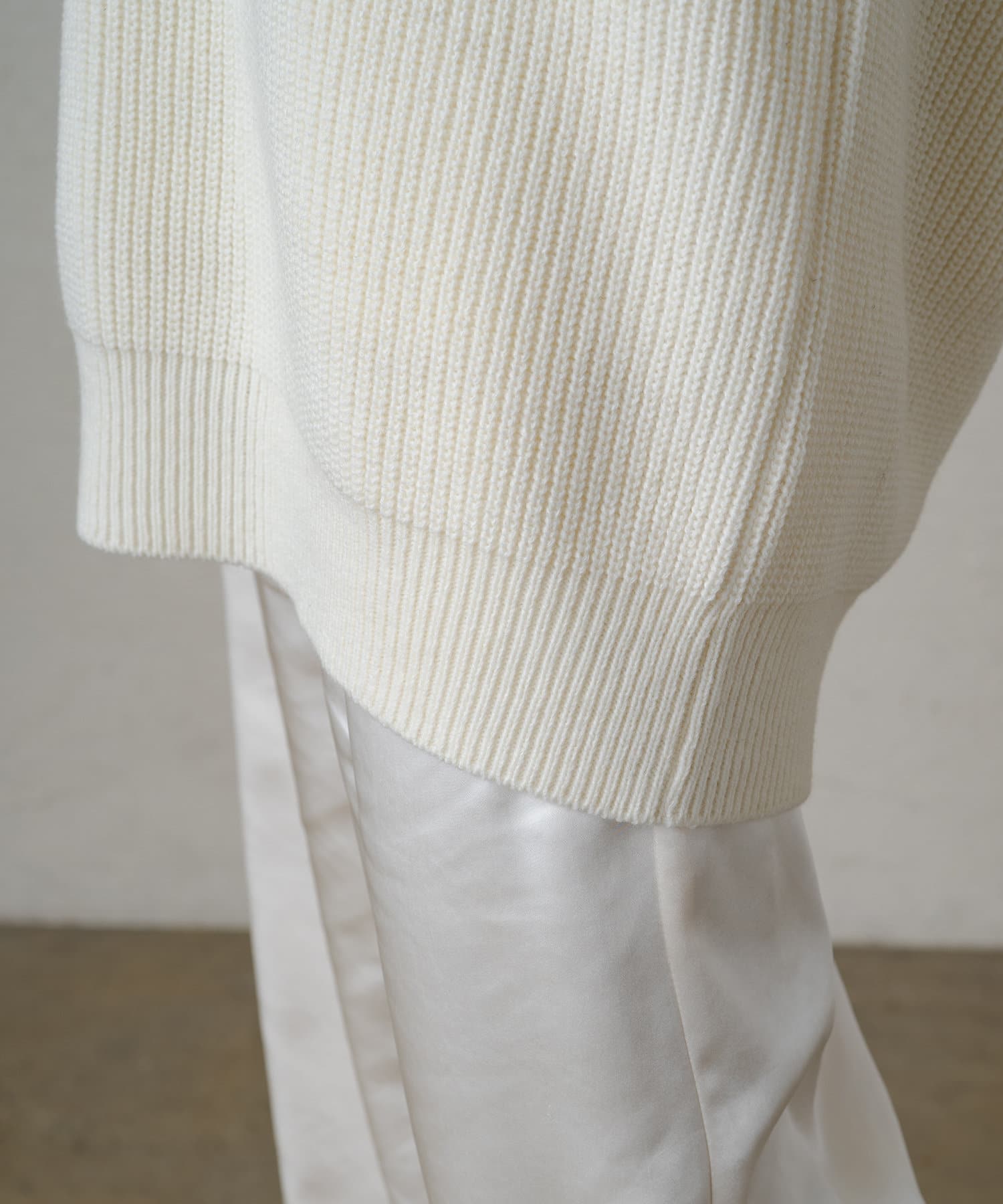 たっぷりとしたゆとりが身体を泳がせて、さらっと着こなしてもボディラインを拾いづらいニットです。