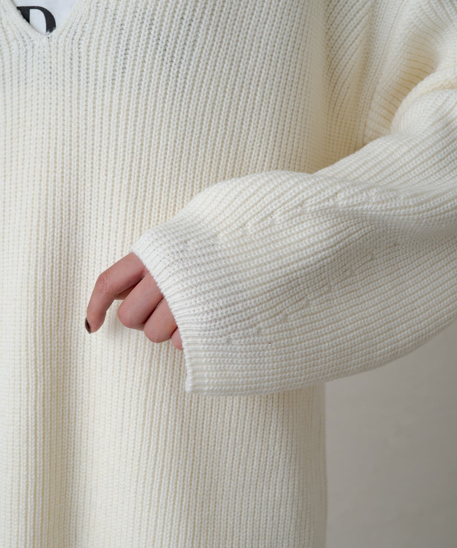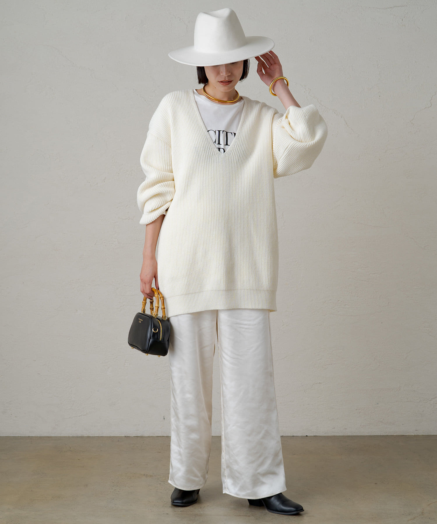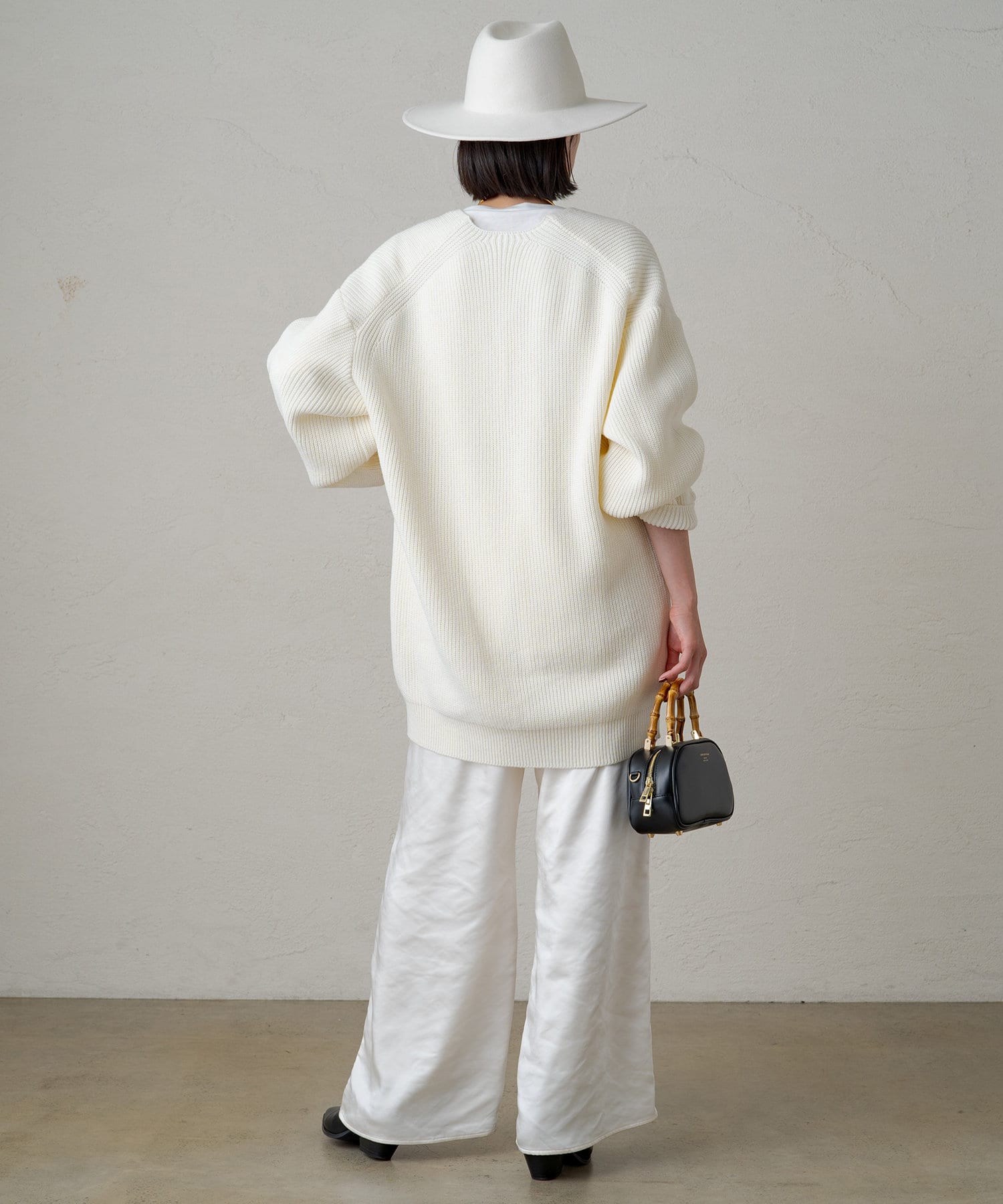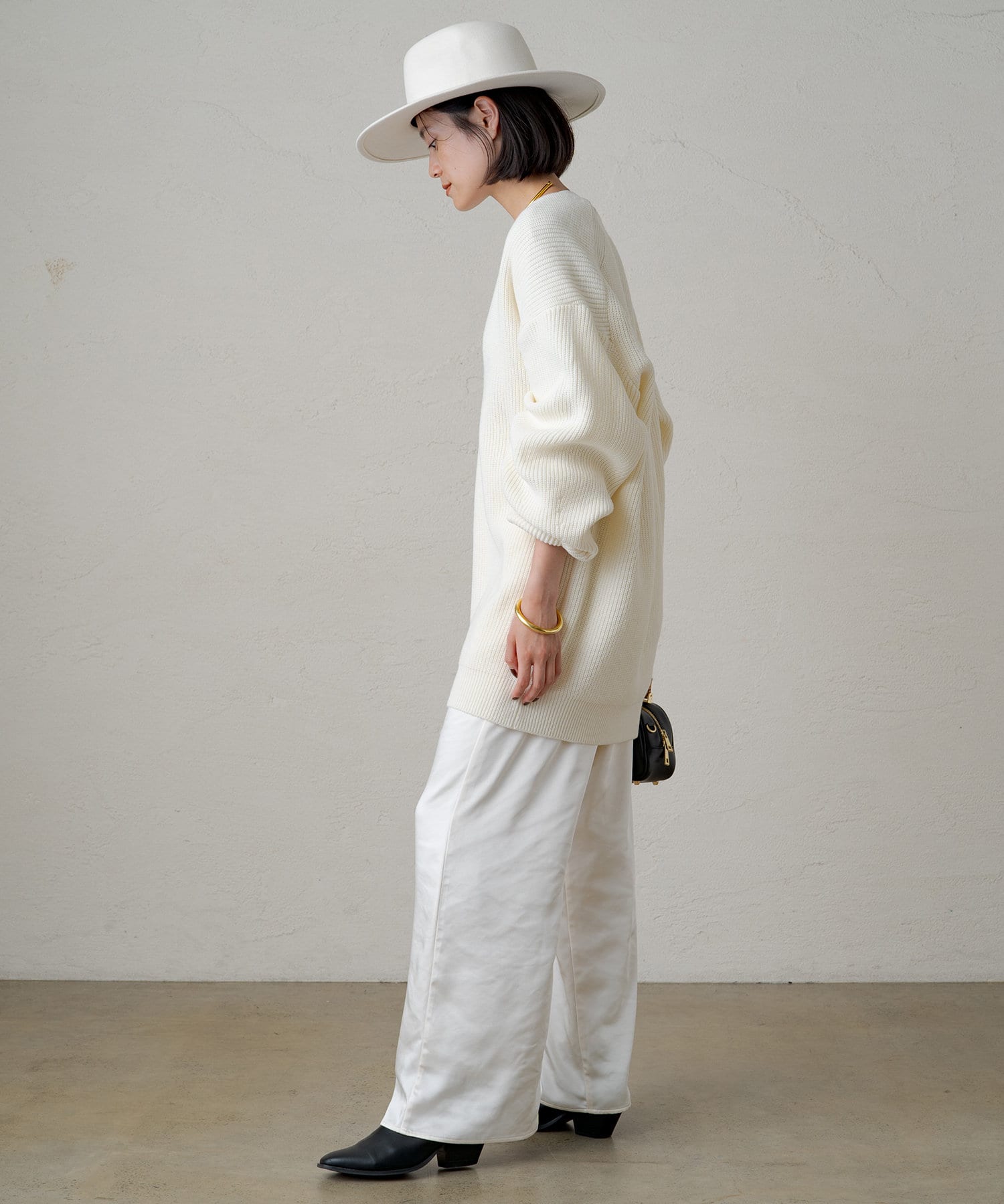 たっぷりとしたゆとりが身体を泳がせて、さらっと着こなしてもボディラインを拾いづらいニットです。