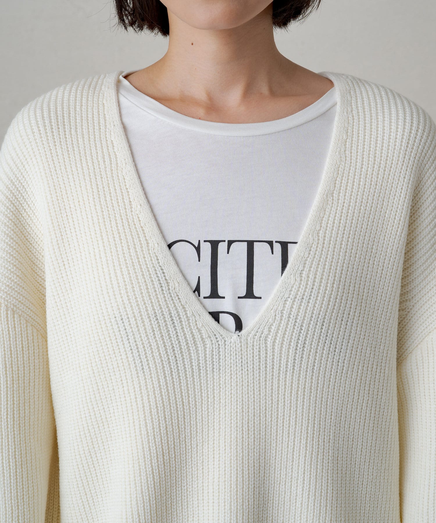 深Vネックのデザインを活かして、インナーにロゴTをレイヤードするスタイルもおすすめ。