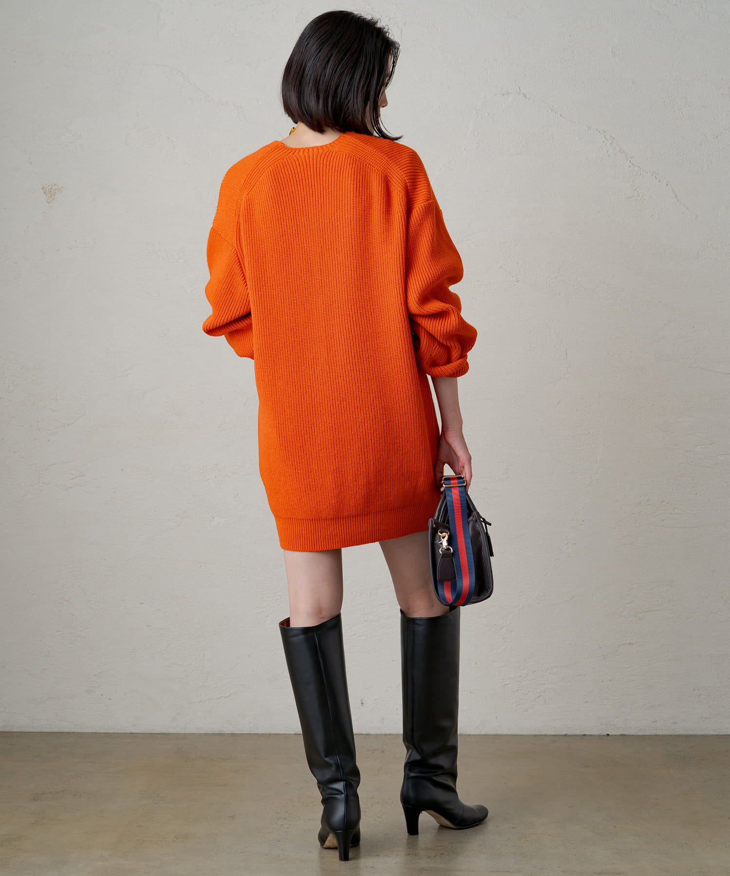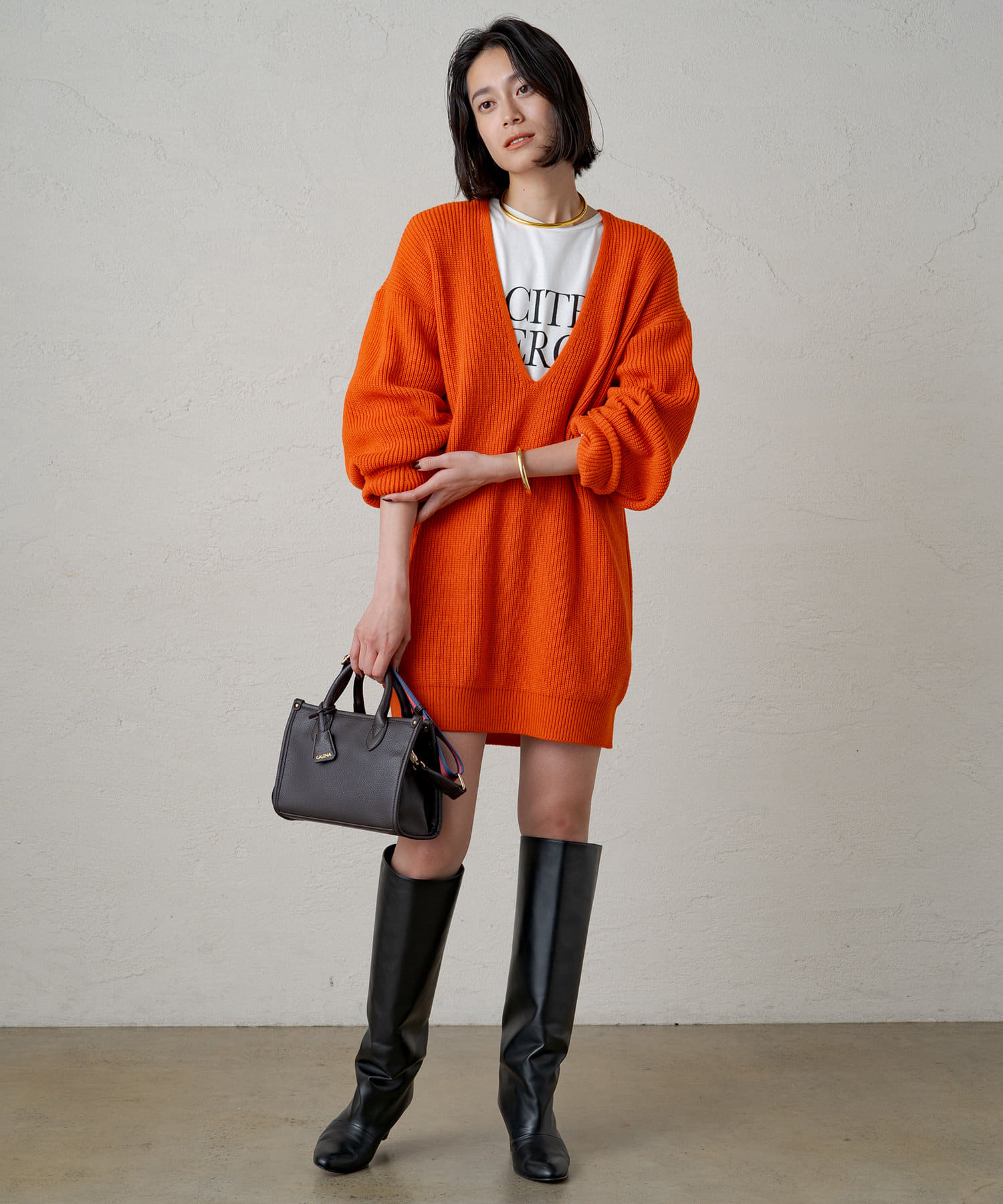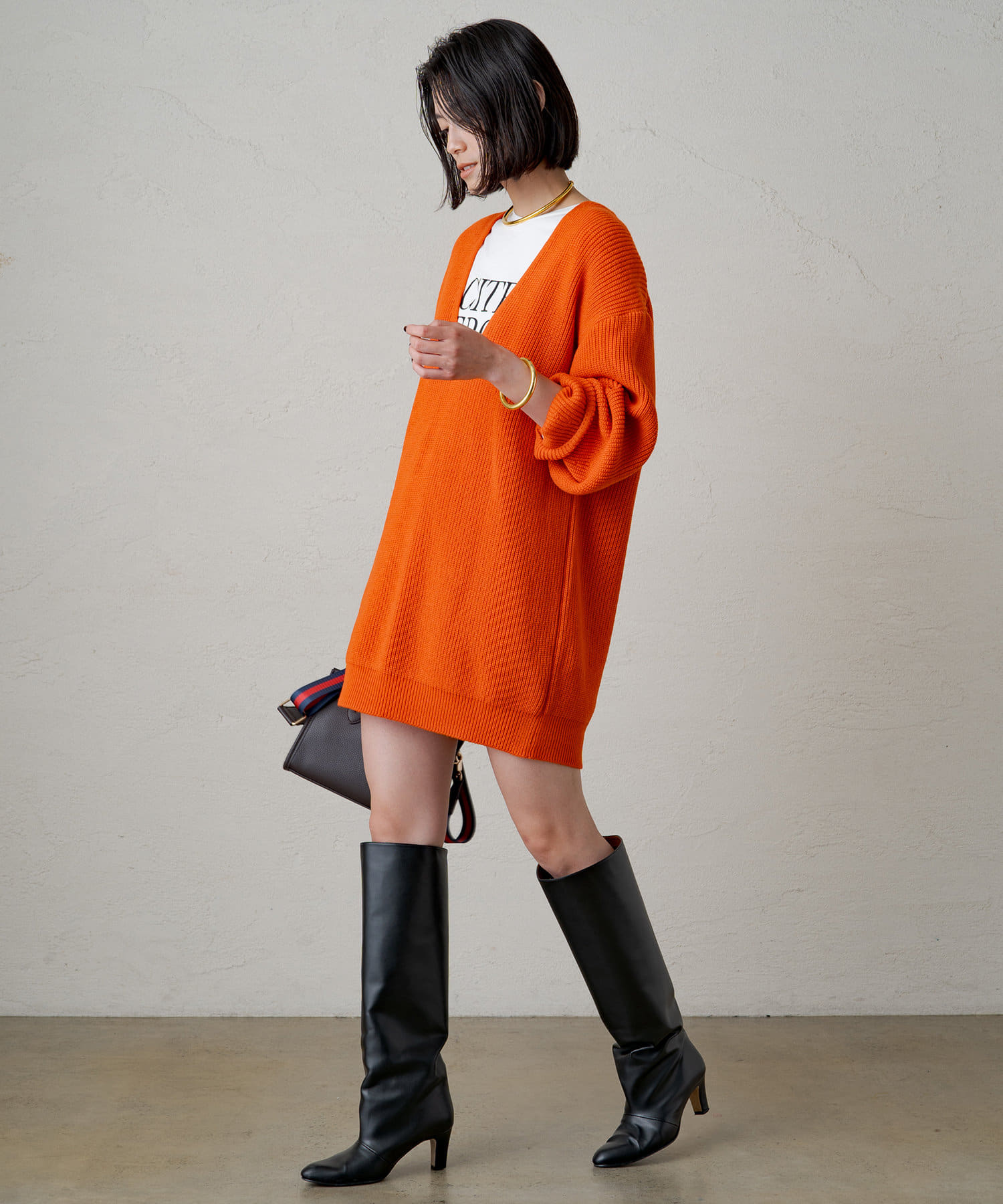 ヒップにかぶさる長めのシルエットなので、ロングブーツと合わせてチュニックワンピース感覚で着るスタイリングも気分です。