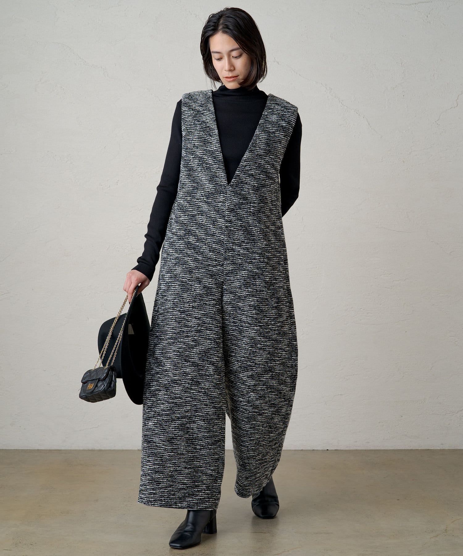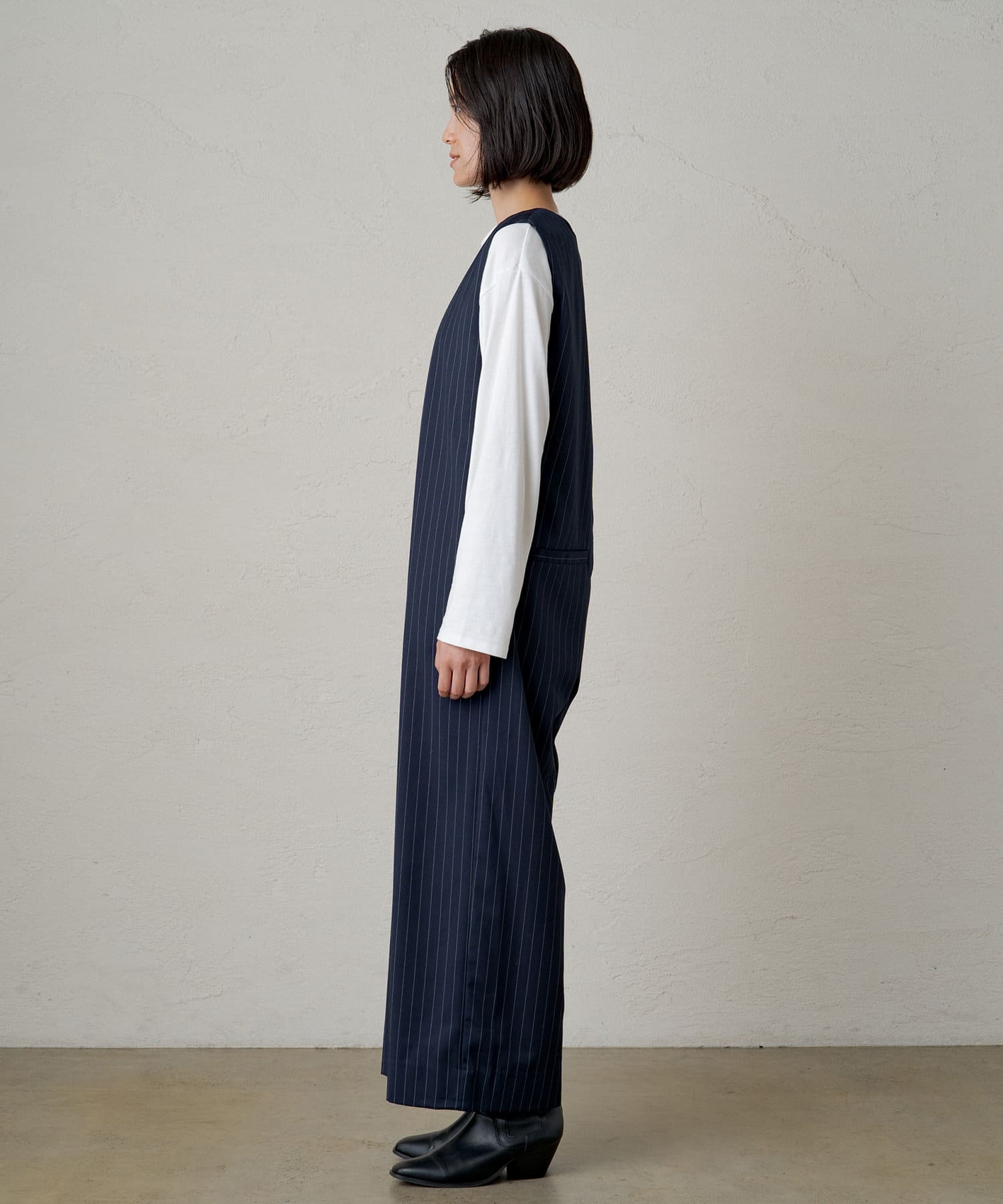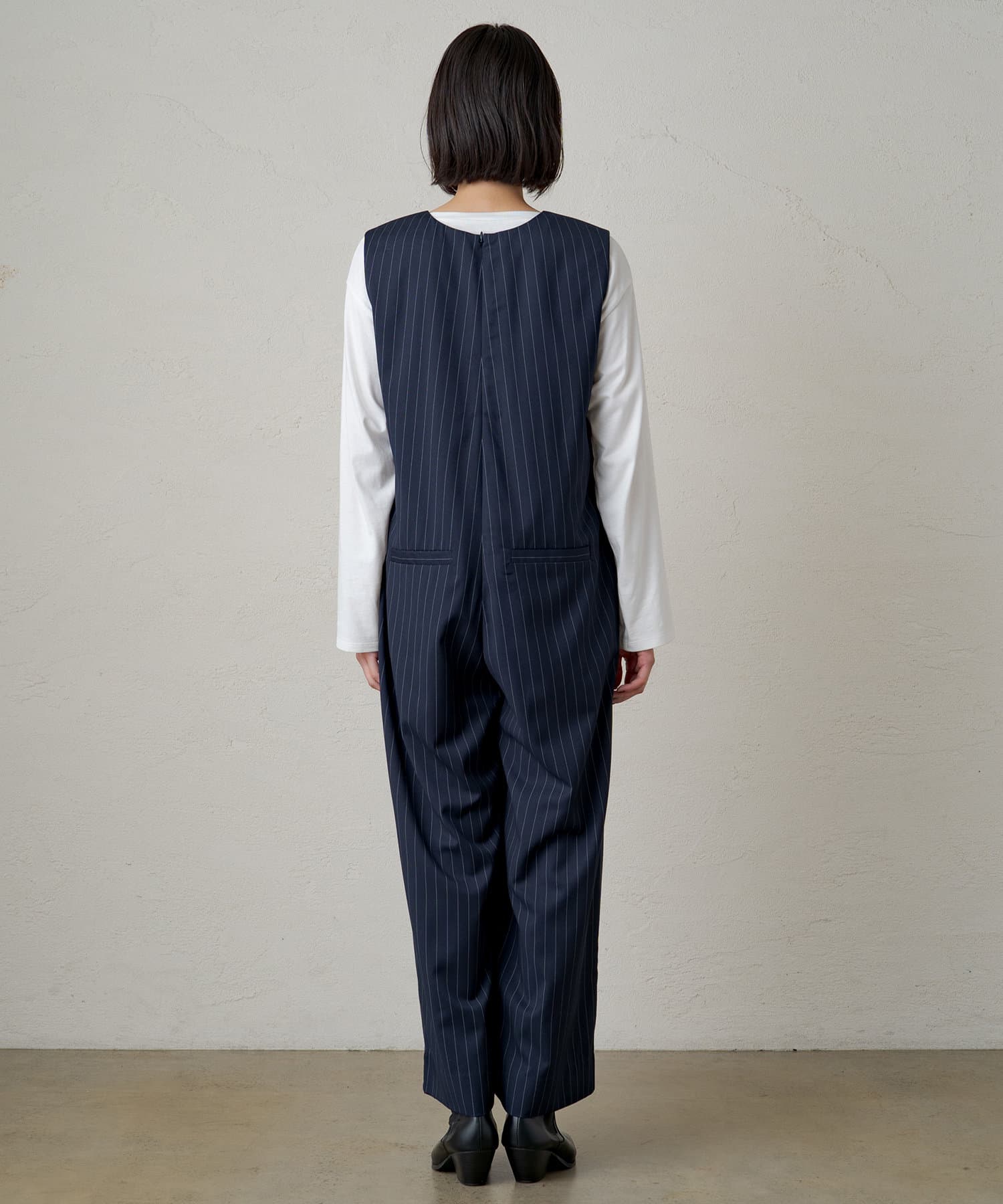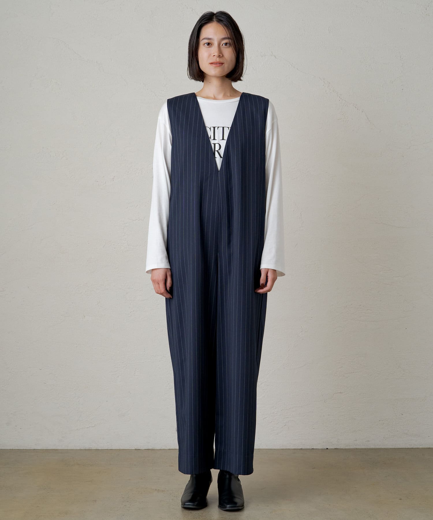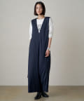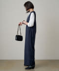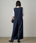 深めに開いたVネックがシャープな印象のオールインワン。