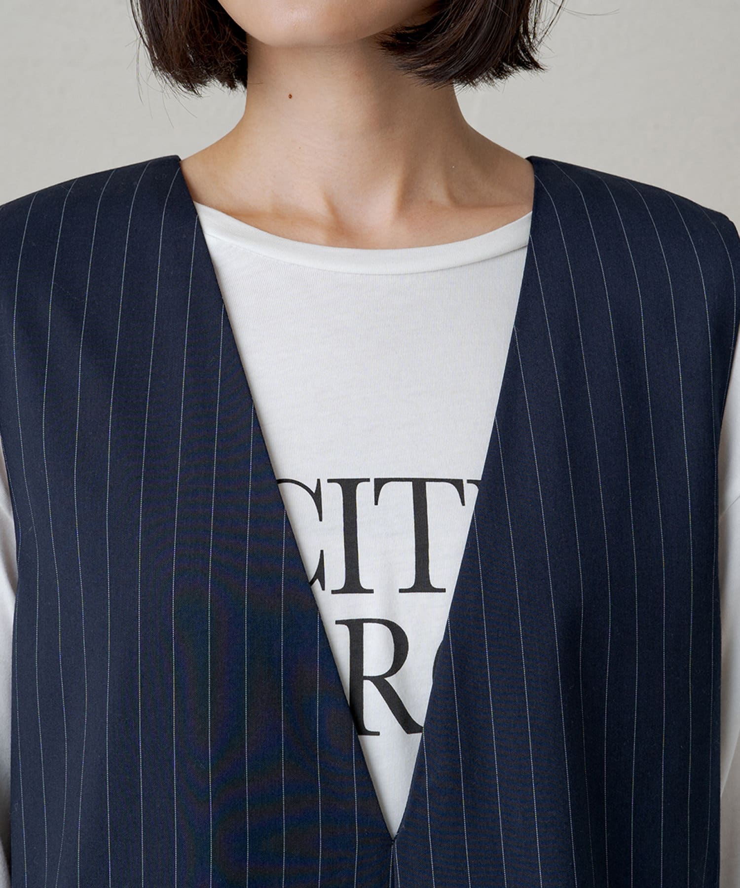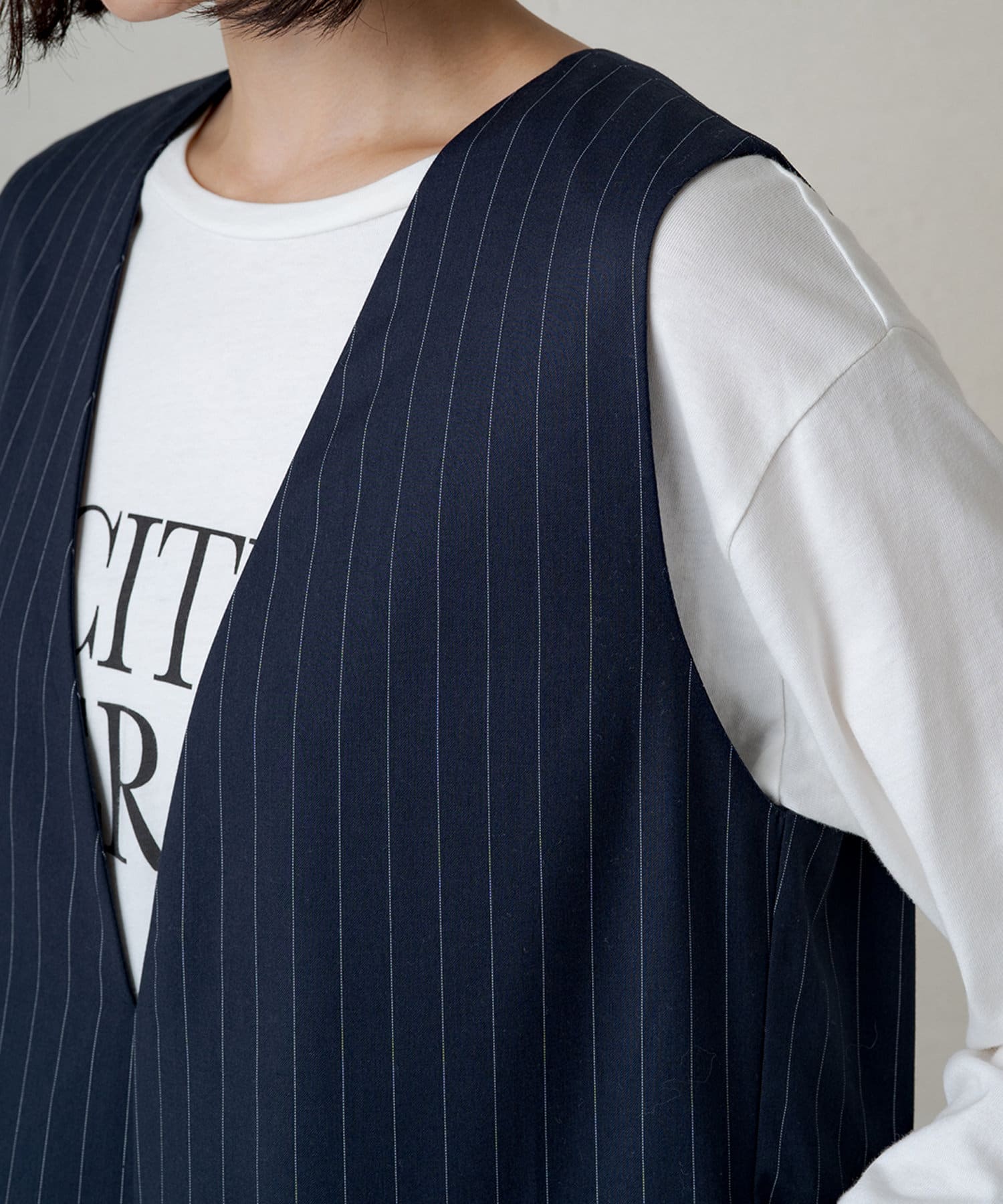 インナーには細身のタートルネックのトップスや、ロゴTや無地のカットソーを合わせて着まわせます。