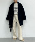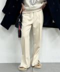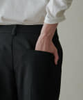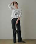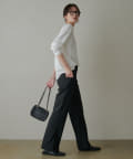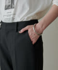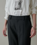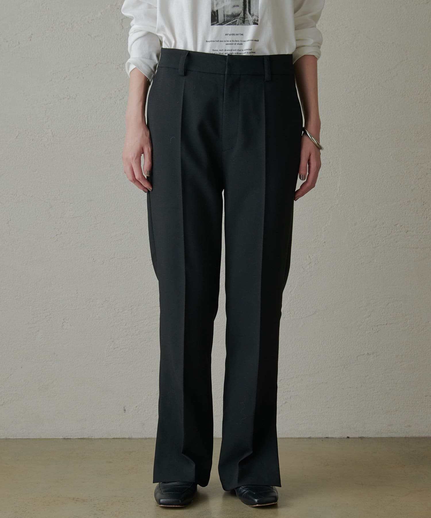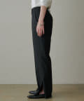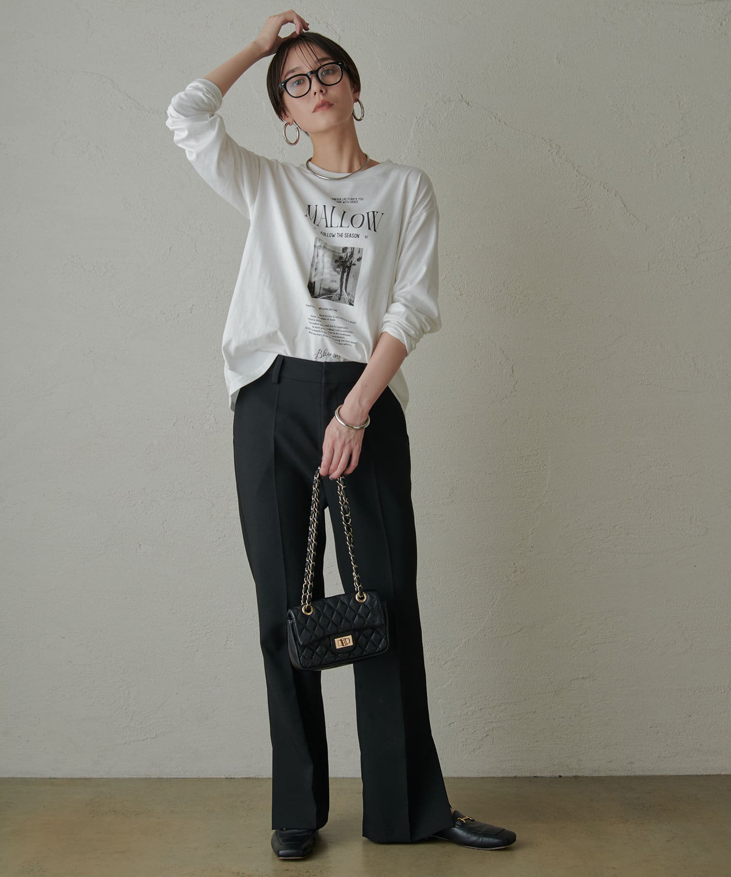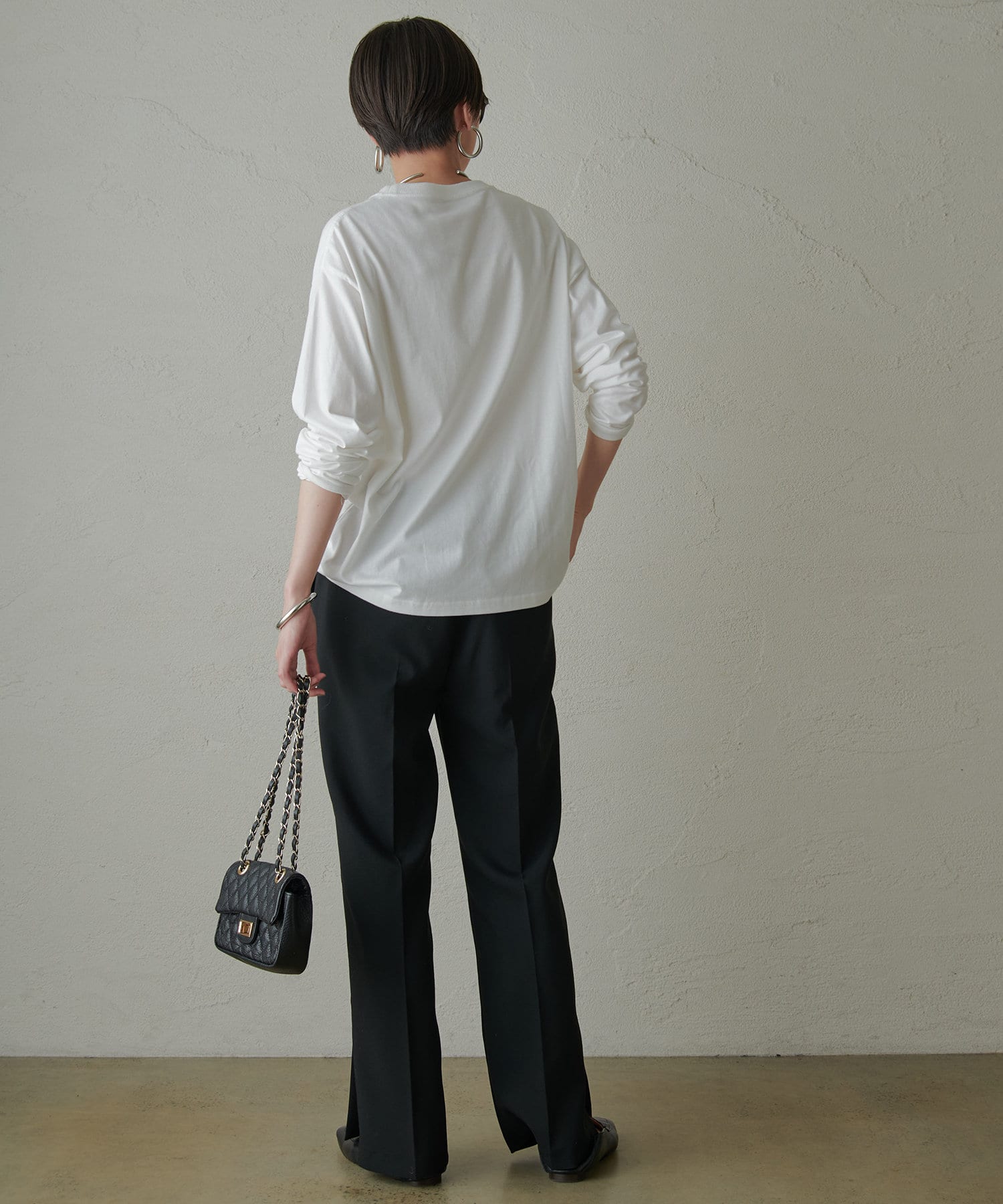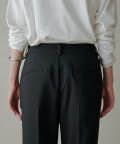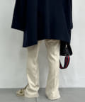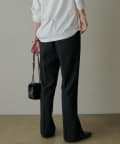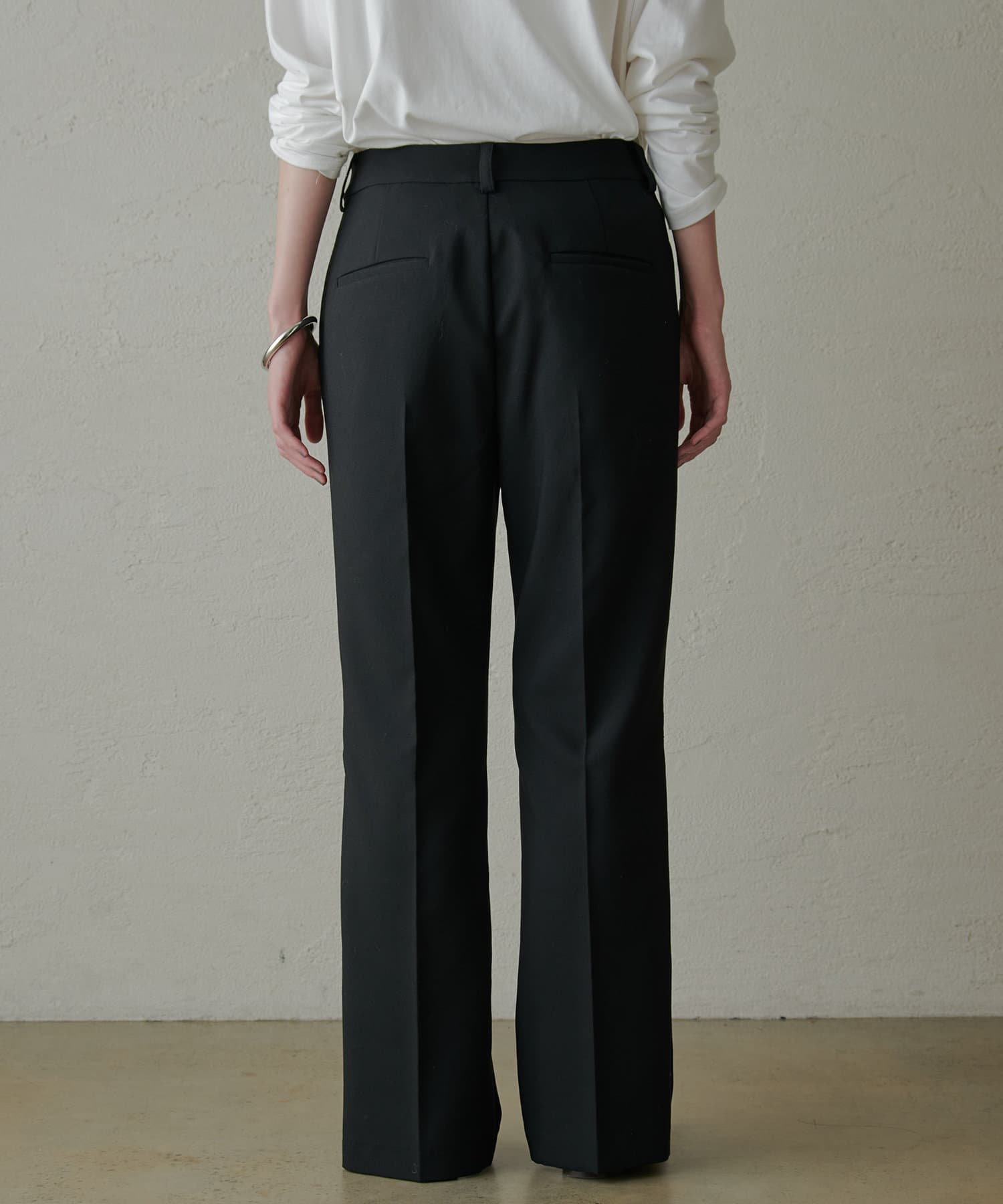 裾にかけて広がるフレアシルエットを採用し、脚長効果が期待できるパンツ。