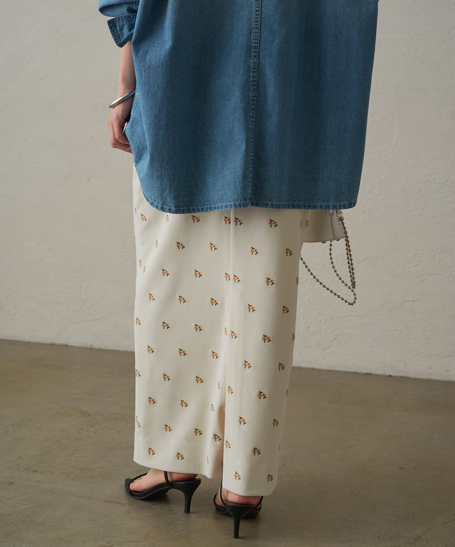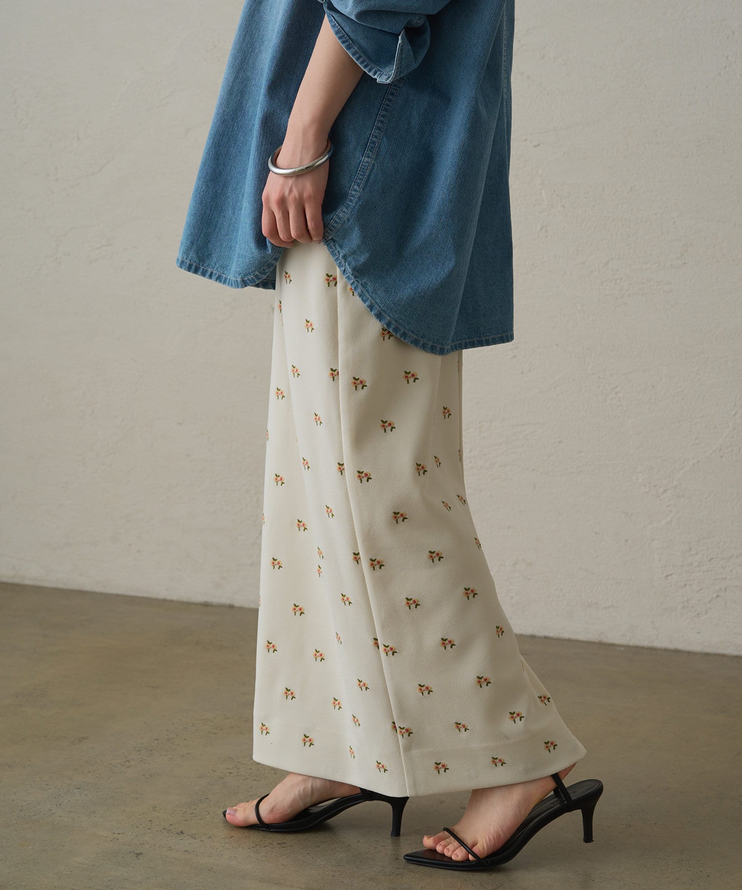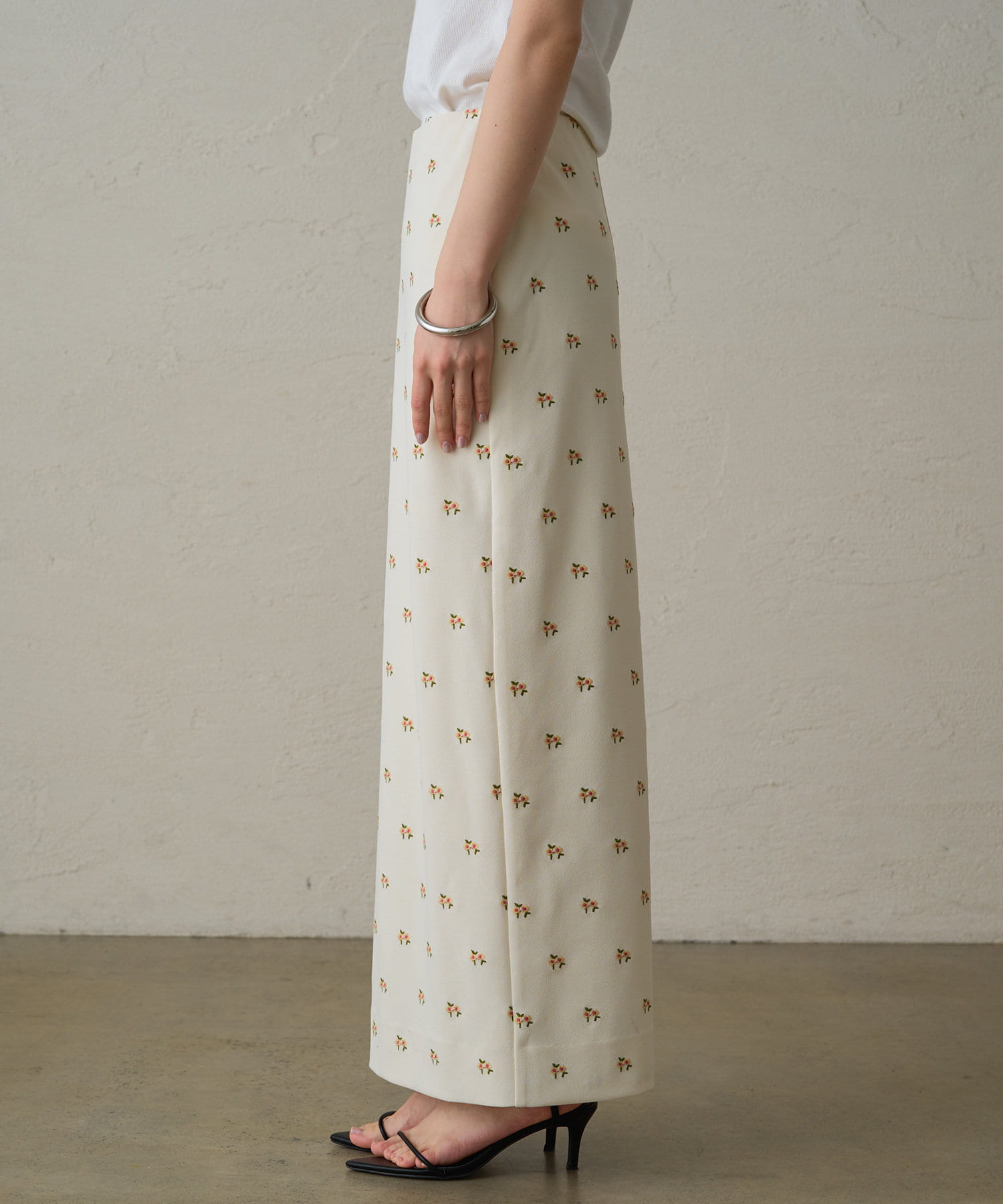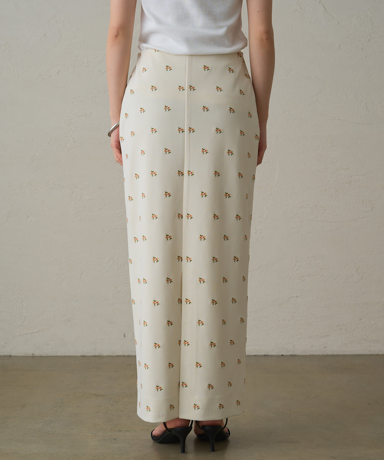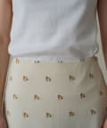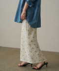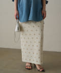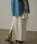 伸縮性のあるジョーゼット生地に、オリジナルの花柄の刺繍がランダムに施されたスカート。