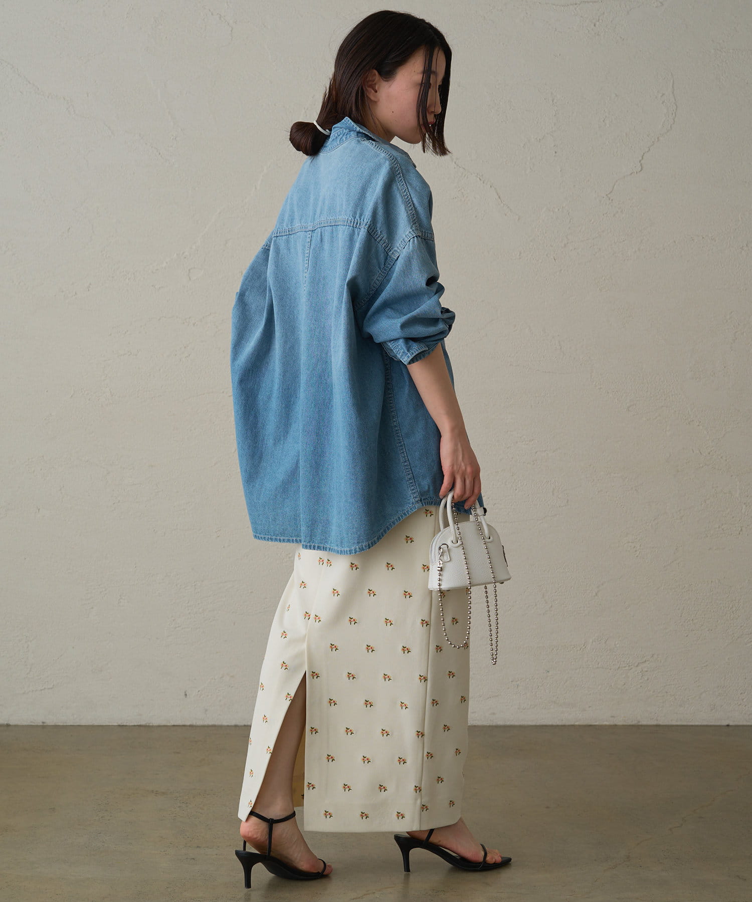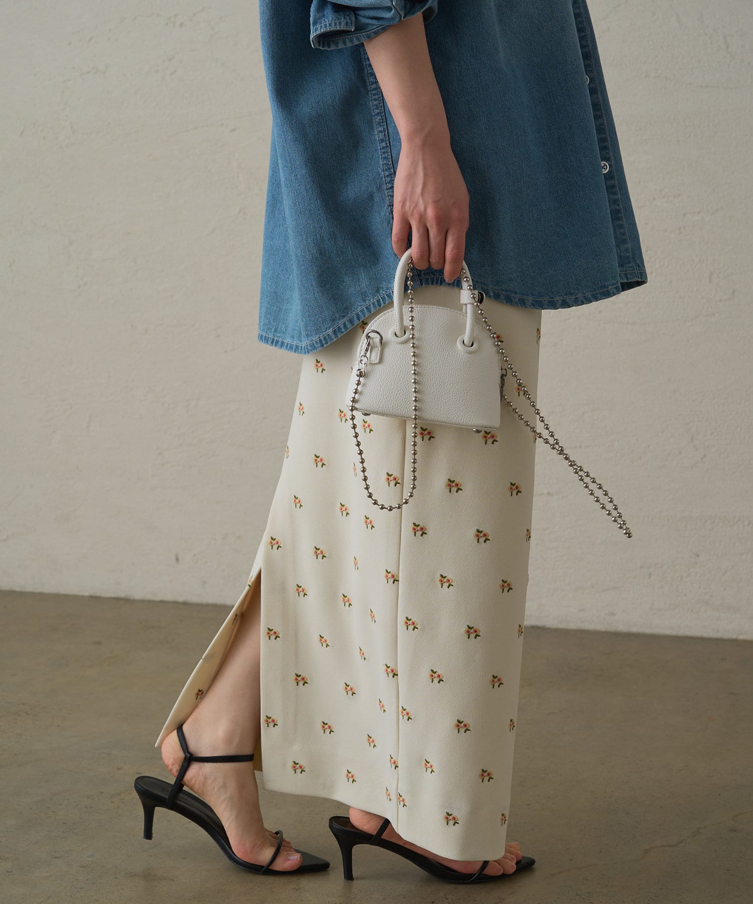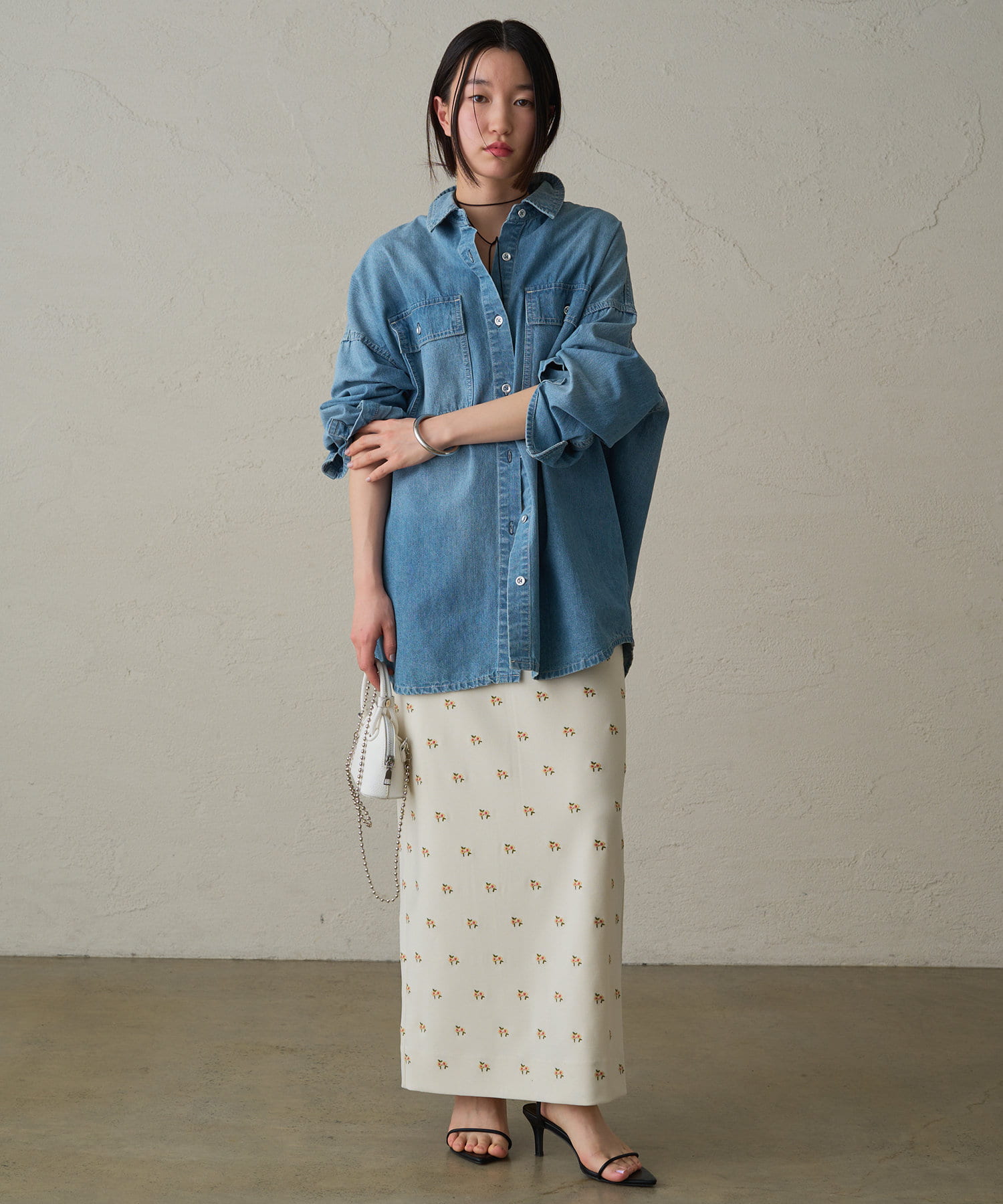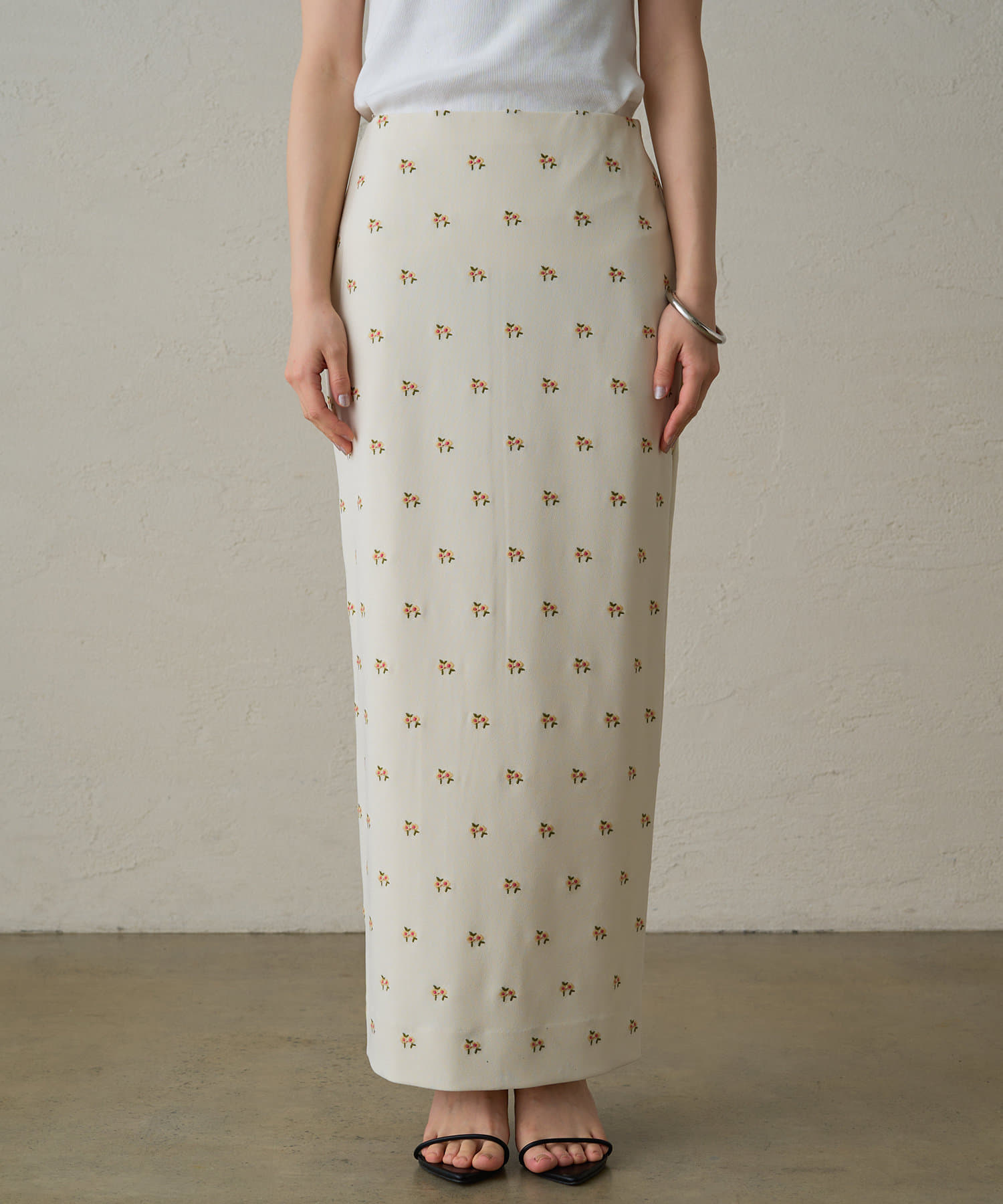 ロマンティックムード漂う花柄刺繍スカートはタイトシルエットで上品さUP